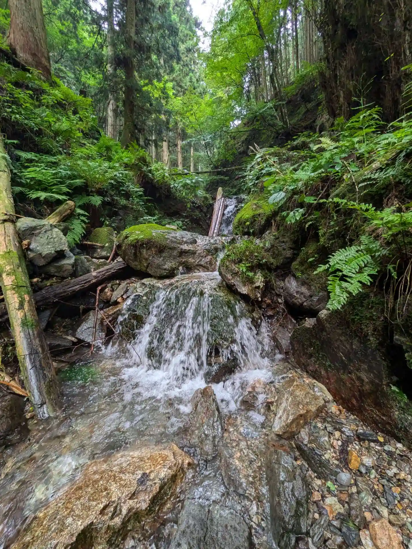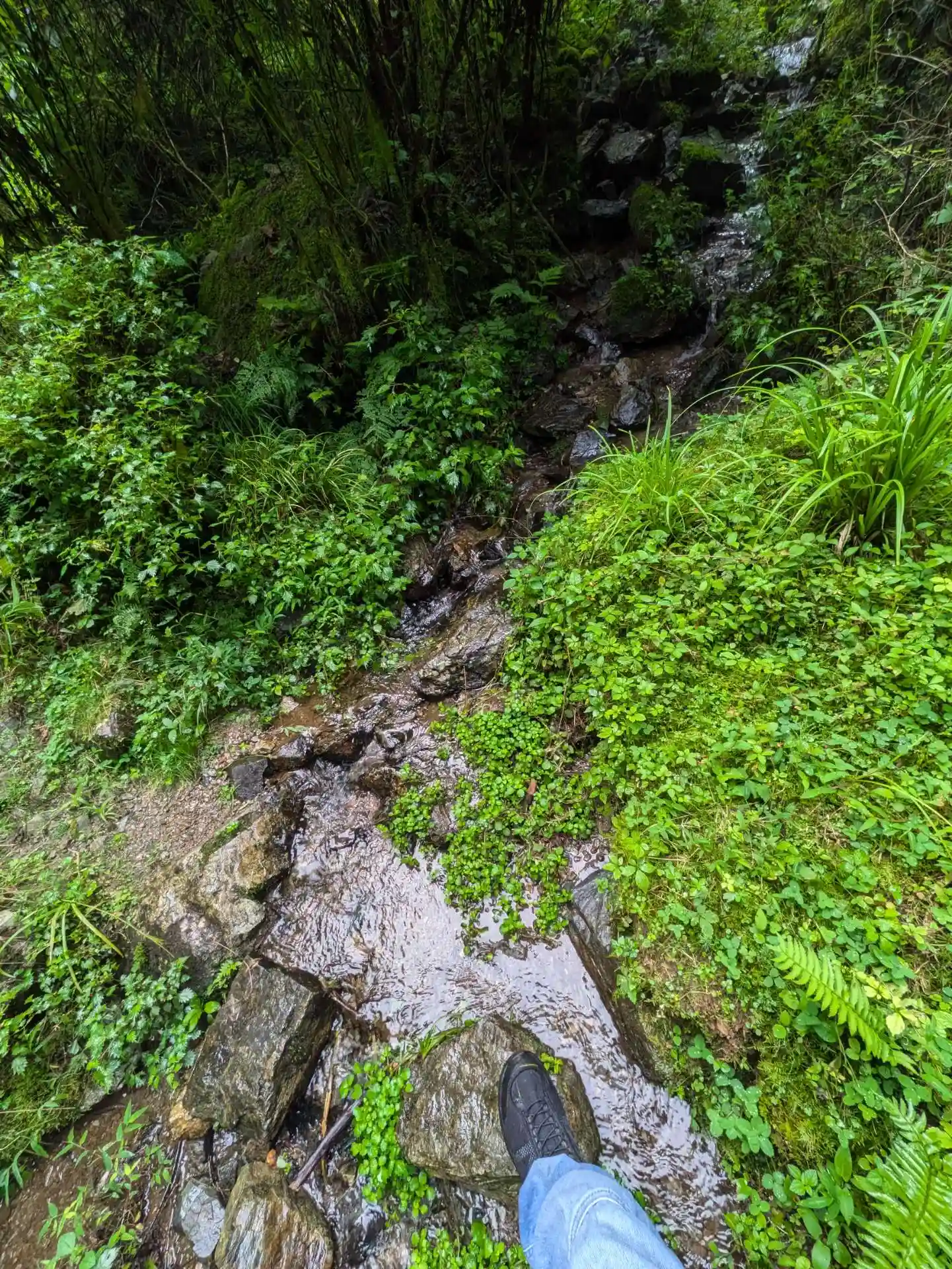 登山道、雨の影響で沢になってます。