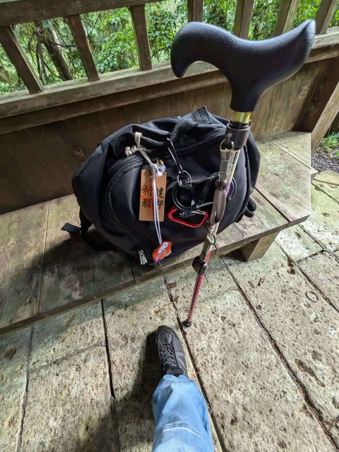先週“轟岩”でポールを落下してしまったのでDAISOの150円の介護用品ステッキ(80cm以上が良いです)を購入。私の登山レベルなら十分です。熊避け鈴、カラビナ(リュックにポールを固定)、安全手袋等DAISO有難い。リュックの中身は“御朱印帳”“100均雨具のカッパ”“DAISO折り畳みイス”“飲料水”等、神社仏閣巡りは、このリュック1つで事足ります。リュックは“折り畳みイス”が入る大きさで両側に飲料水が入るポケットがあるのが使いやすいと思います。小さくまとまるリュックが良いです(料理しなければ)
