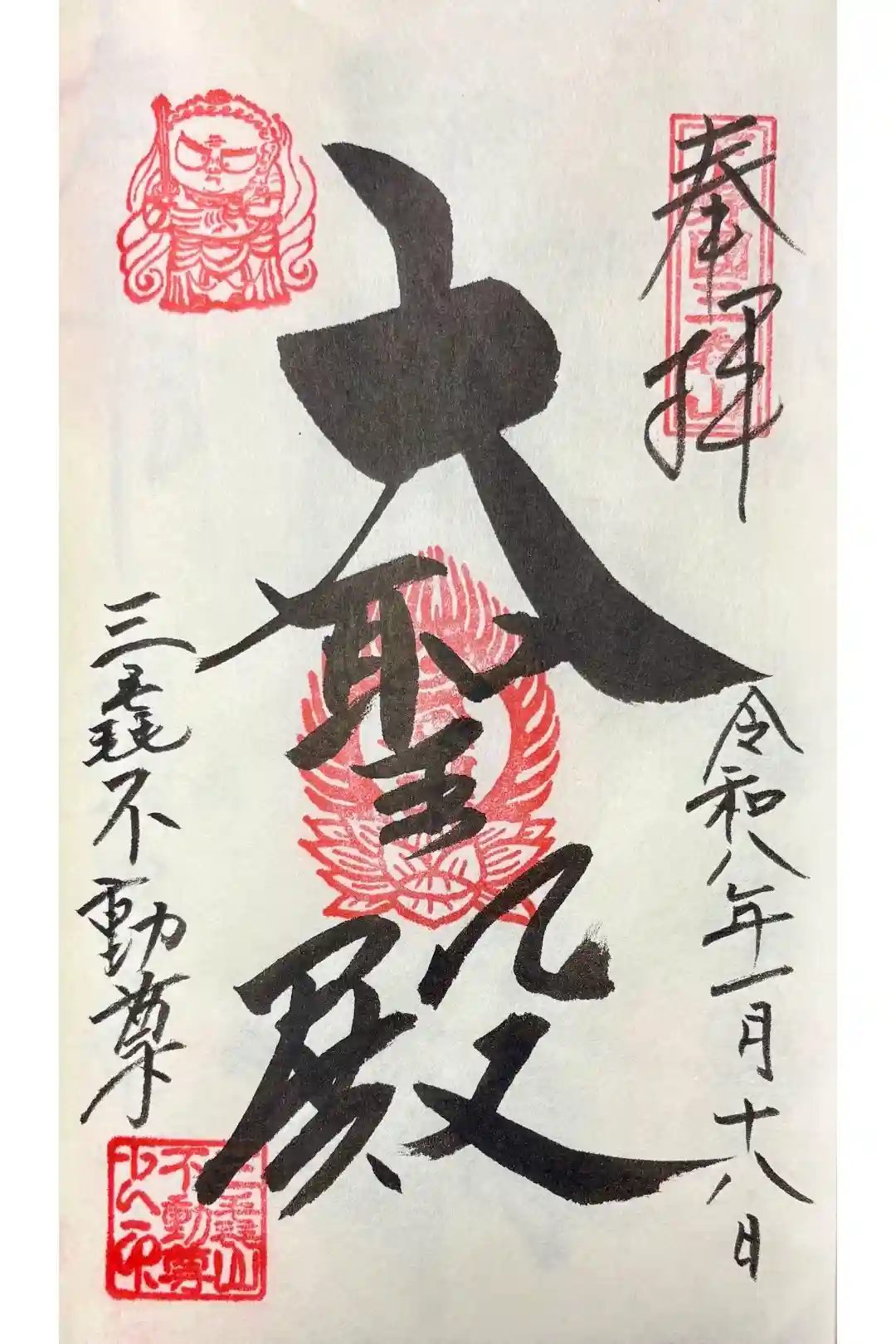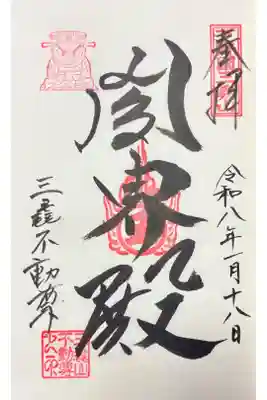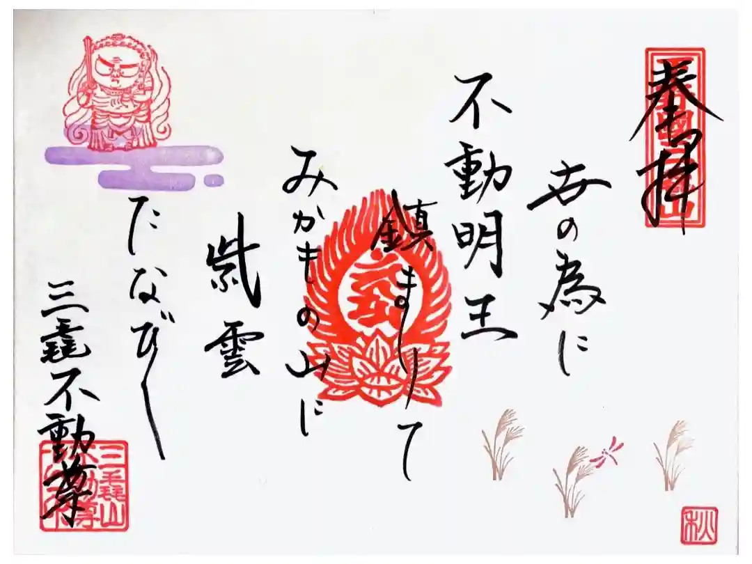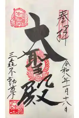 真ん中に大聖殿、左下に三毳不動尊と書かれ、梵字の印、左上に不動明王のお姿が描かれた印が押されています。