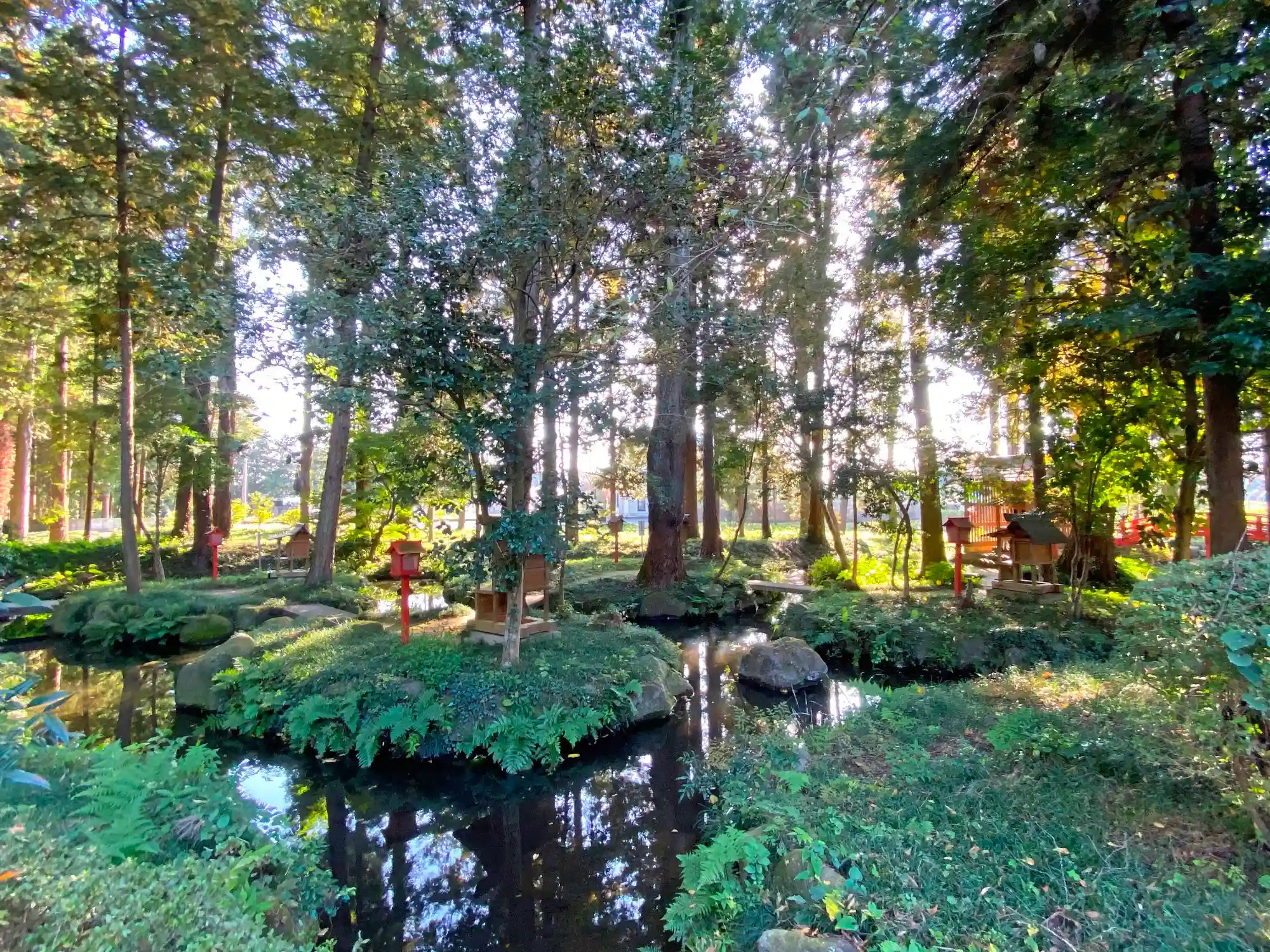 定義すると、「杉木立の中の掘割に、小さな祠を戴く8つの小島がある、およそ800坪ほどの庭園状の場所」といった感じ。