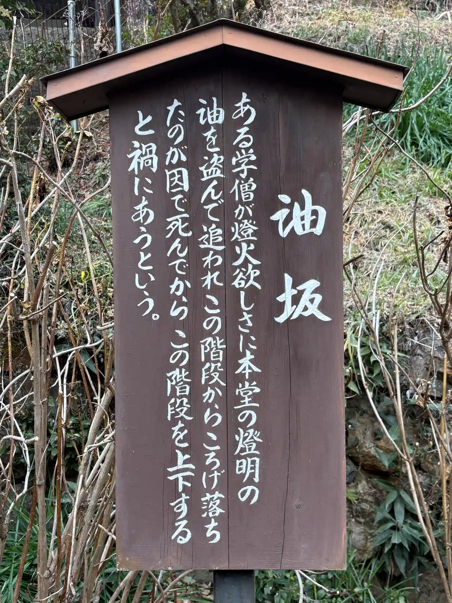 【油坂】…ある学僧が夜間の勉学のために本堂の灯明の油を盗んでいたが、それがある時ばれそうになって逃げようとして誤って石段から転げ落ちて死んでしまった。それ以降、この石段を上り下りすると不吉なことが起こるとして、使用が禁じられた。