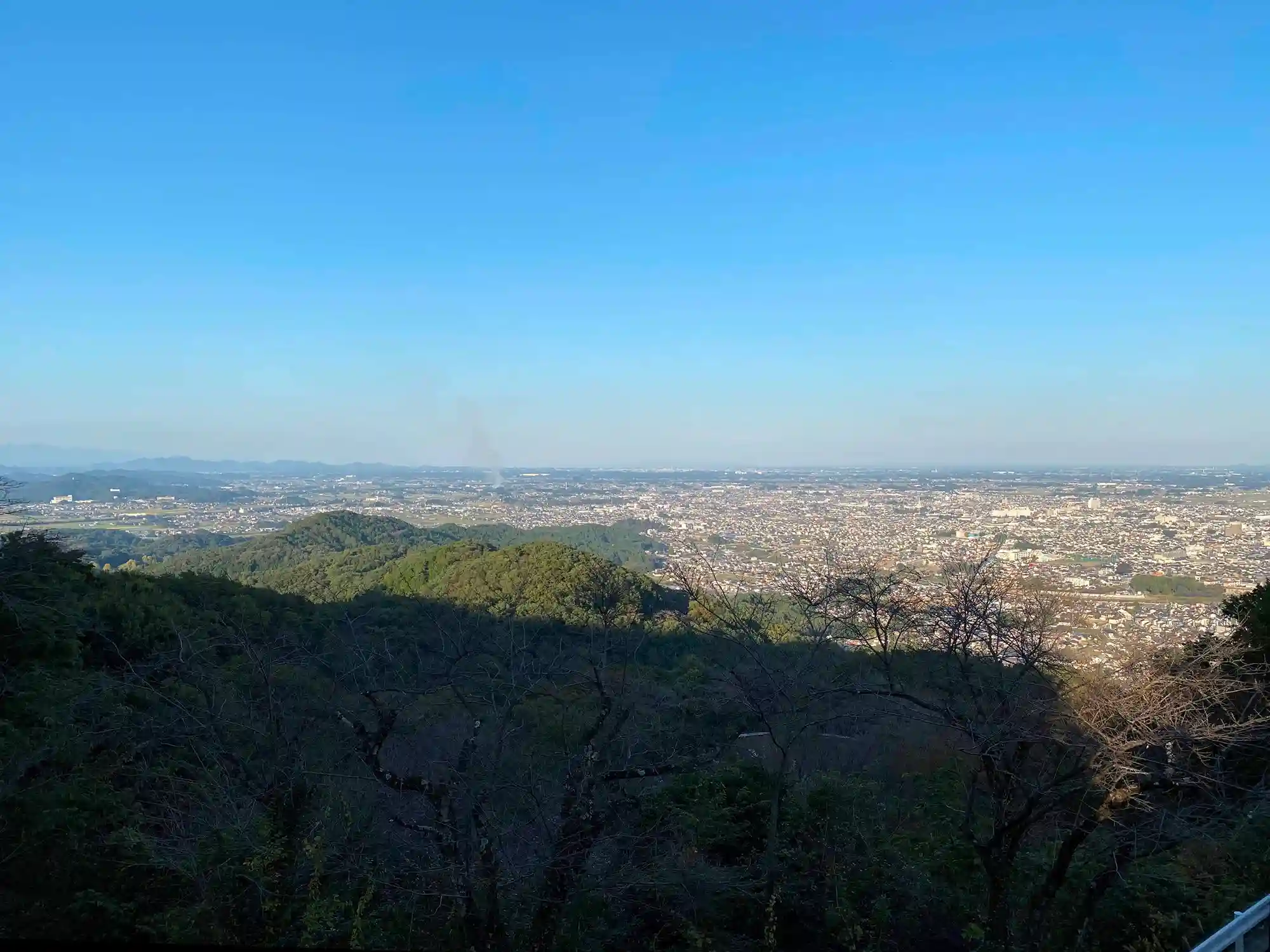 当社の駐車エリアと思しき場所にバイクを停めて、参拝の皆さんとともにちょっとした細い階段を登ると、いきなりの展望台。眼下に広がるのは栃木市、小山市方面かな。