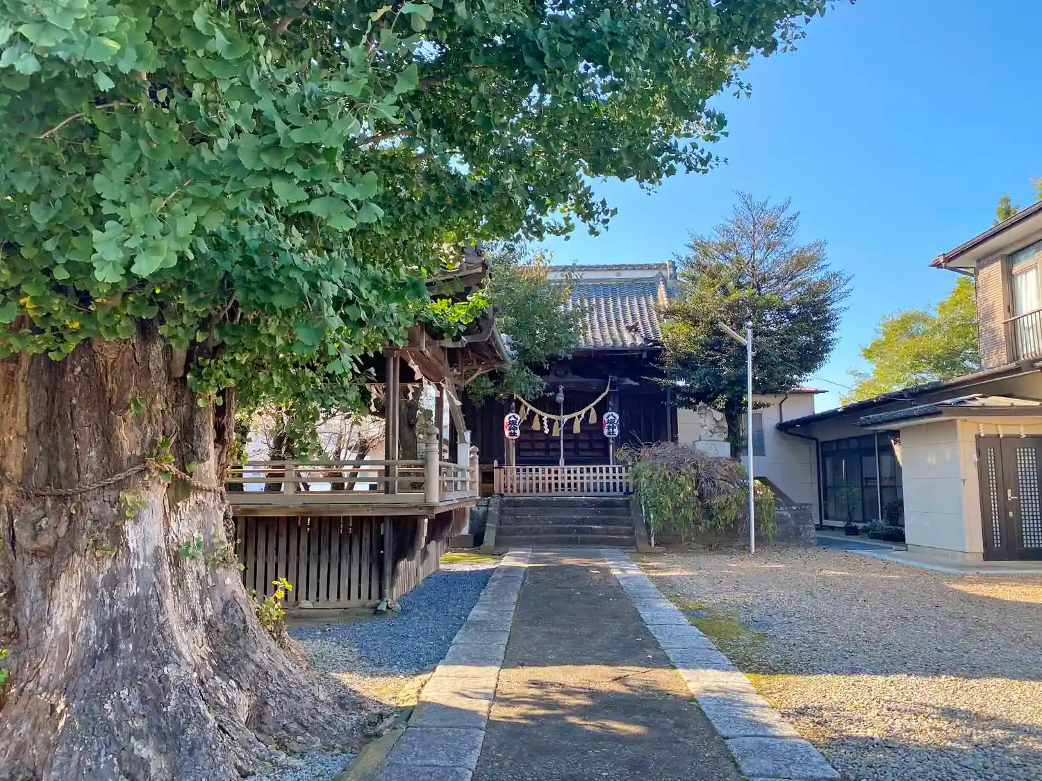 手水舎近くから<拝殿>を望む。高さは低いが幹がめちゃめちゃ太い銀杏の木が主張している。