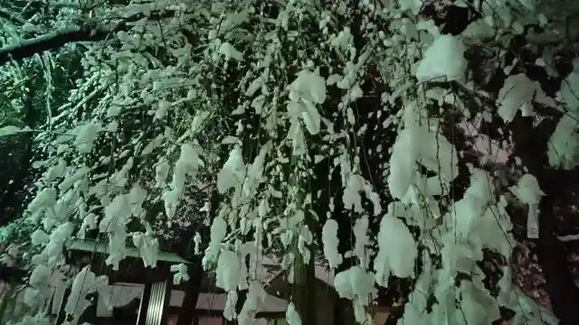 垂れ桜の枝に雪の花。