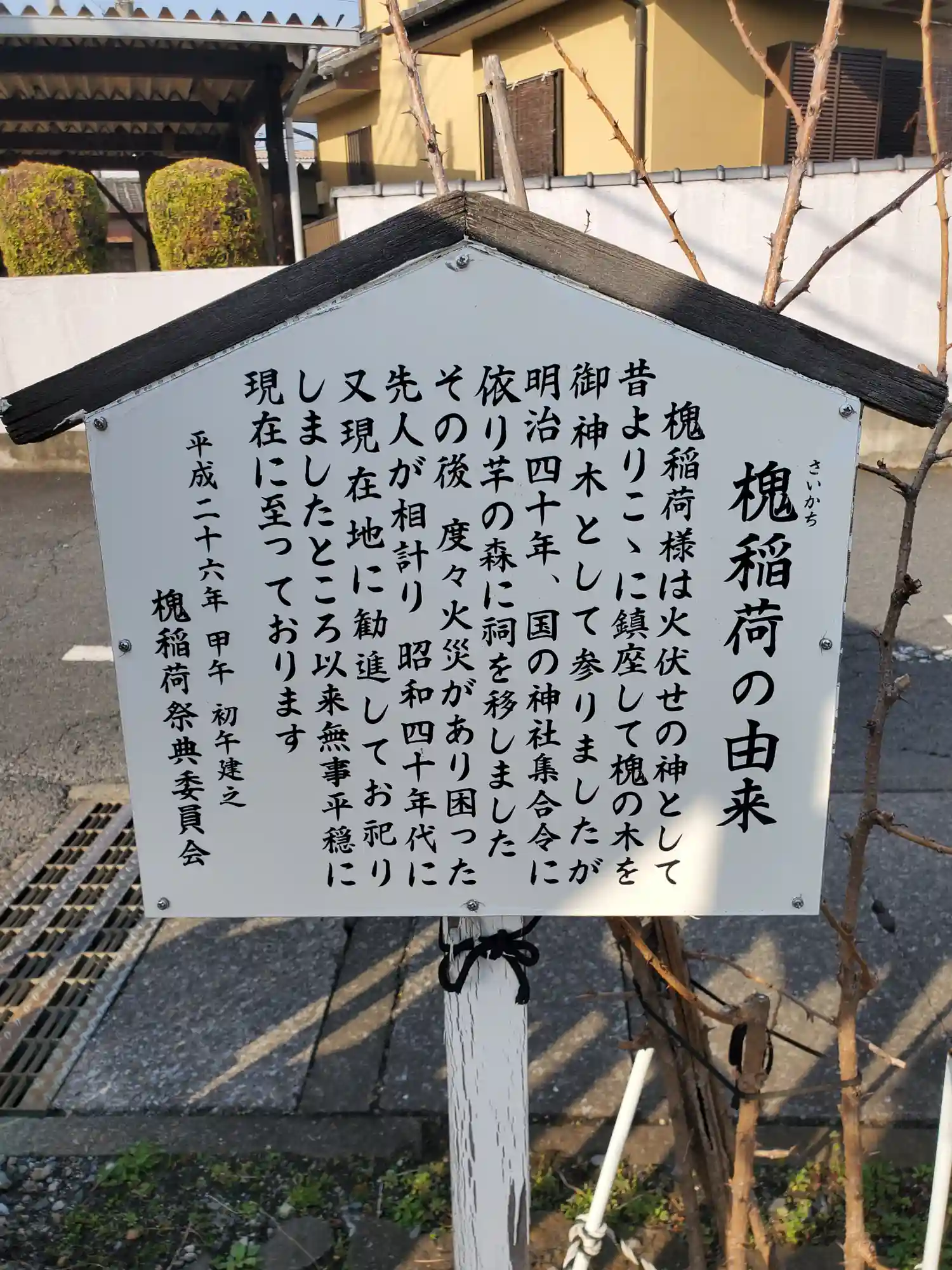 槐稲荷様は火伏せの神として昔よりこゝに鎮座して槐の木を御神木として参りましたが明治四十年、国の神社集合令に依り芋の森に祠を移しました。