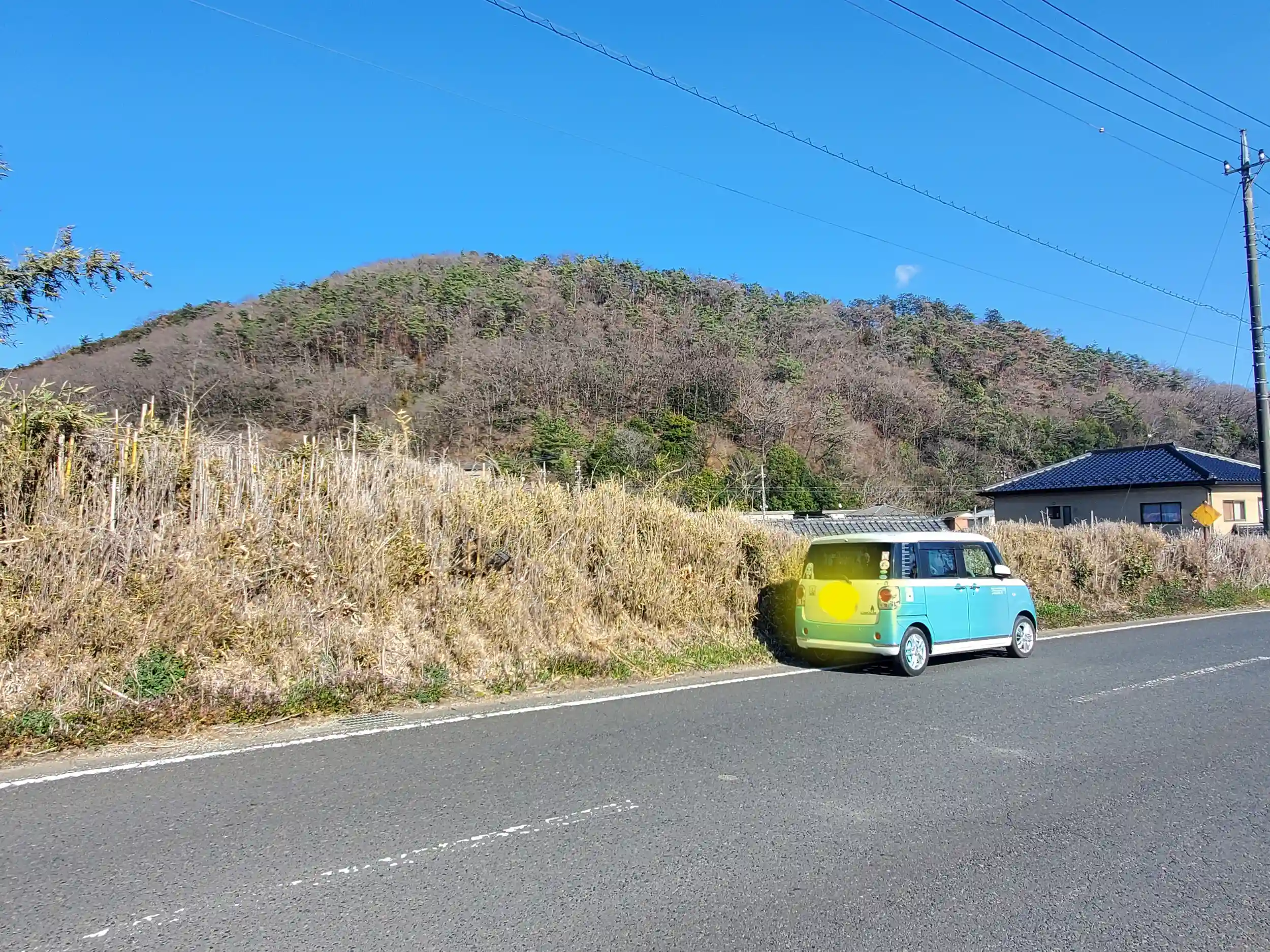 平石八幡宮前の道を東に進むと前にこんもりした低山が見えてきます。