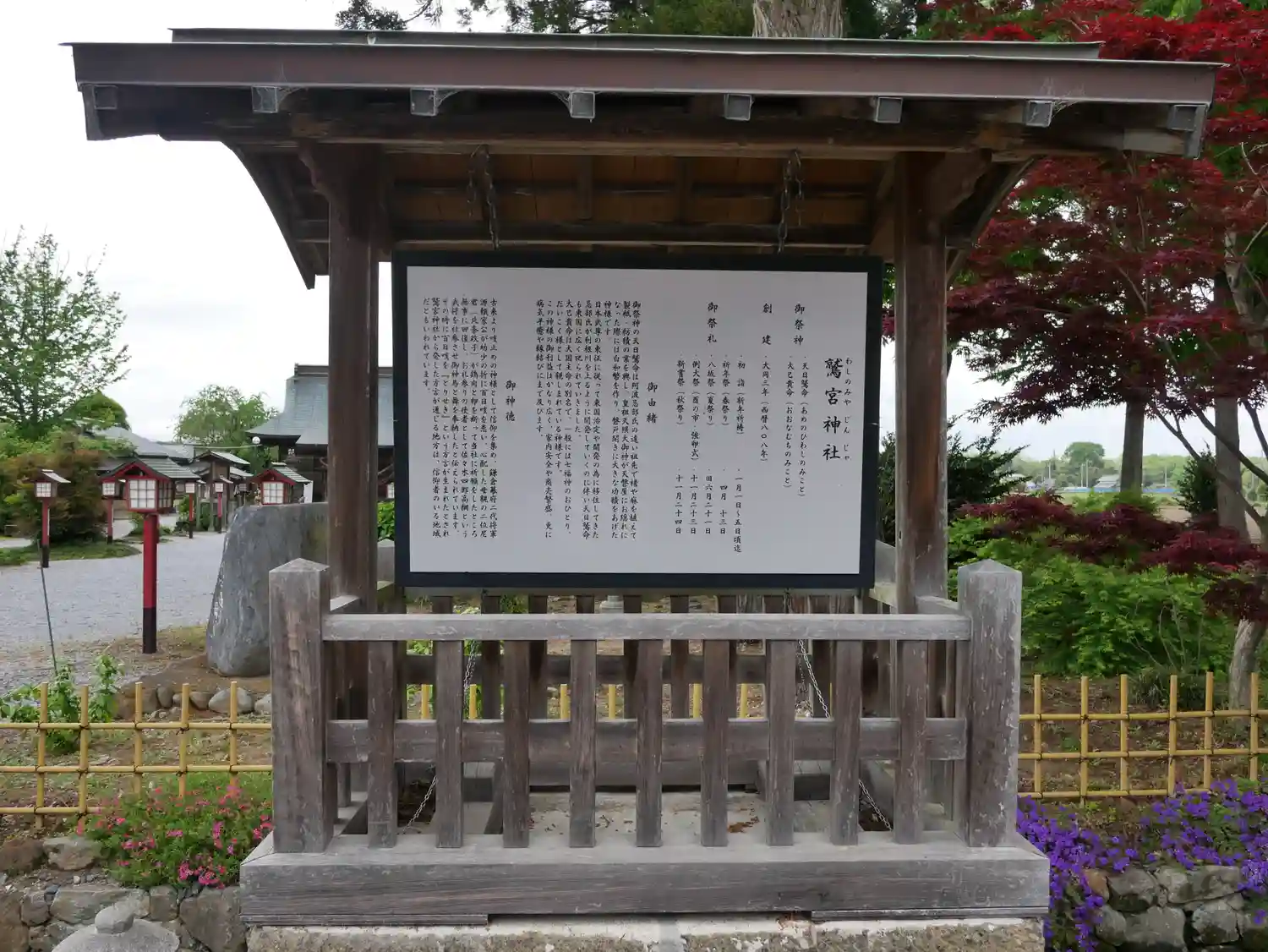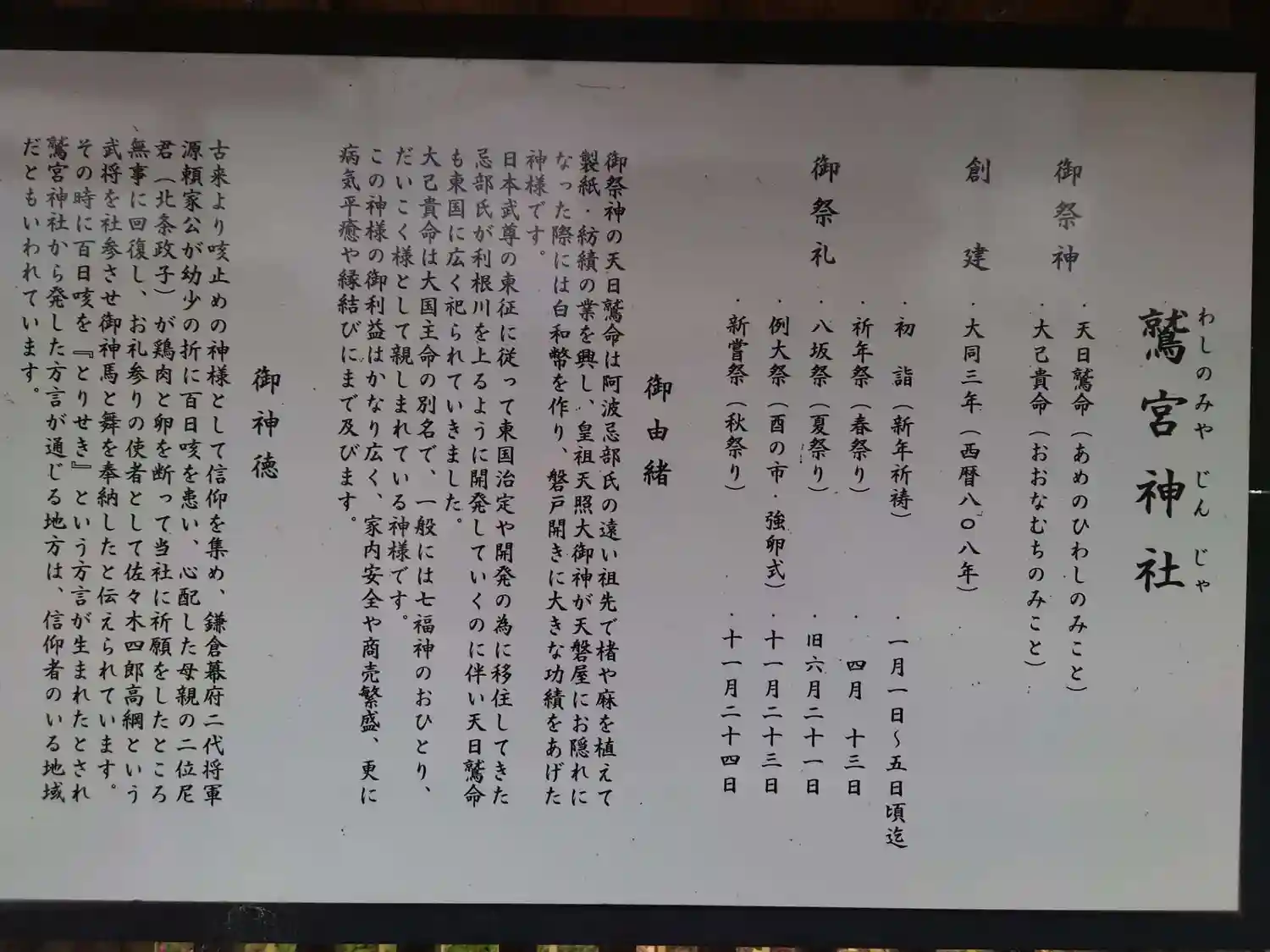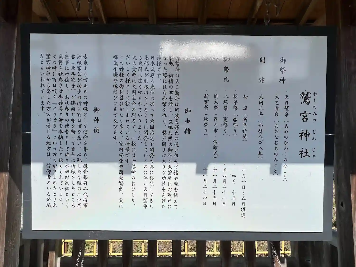 御祭神の天日鷲命は阿波忌部氏の祖先でこうぞや麻を関東に持ち込み、製紙・紡績を広めた一族です。