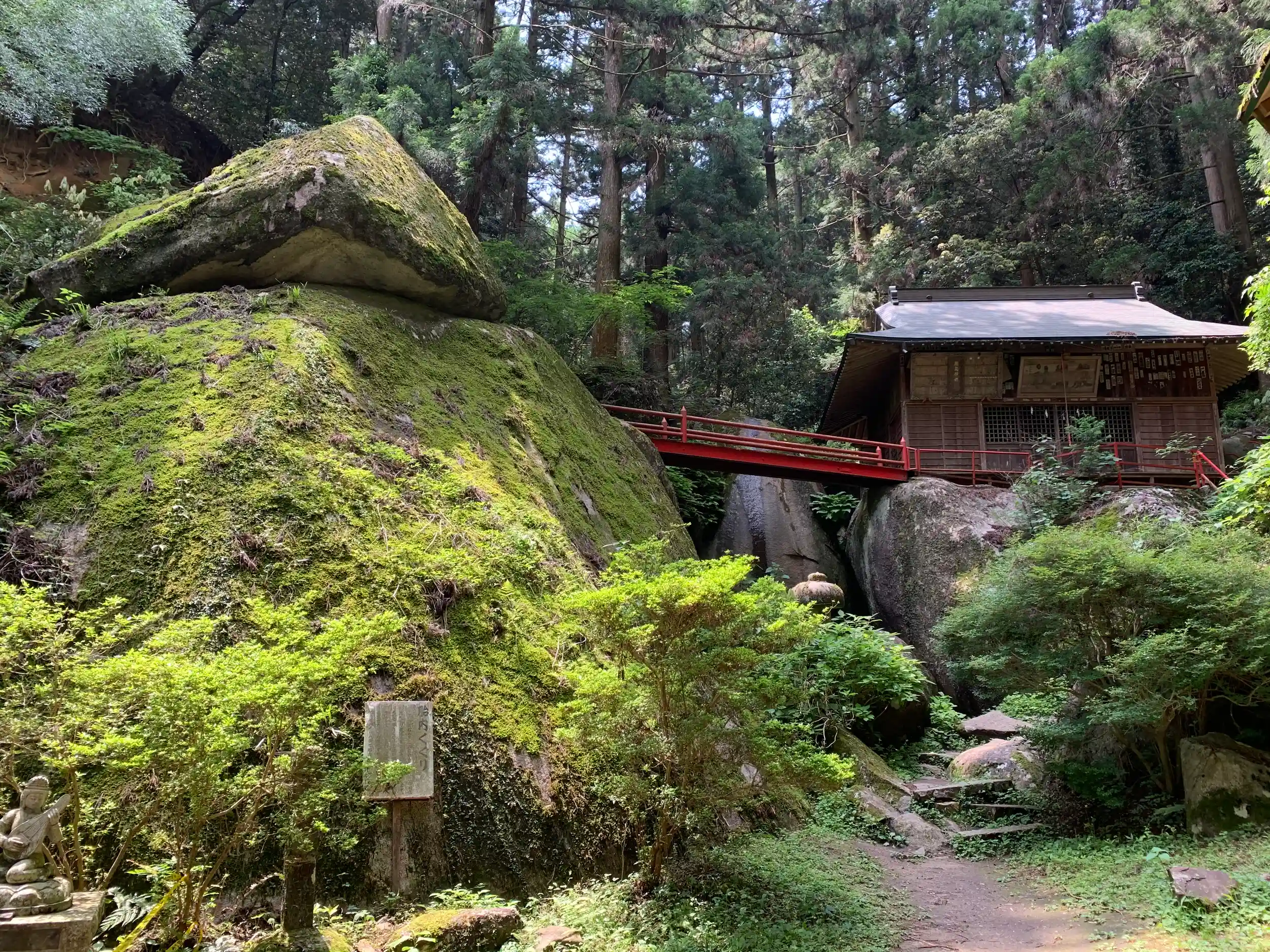 胎内くぐりの大岩へ朱の橋がかかっています。
