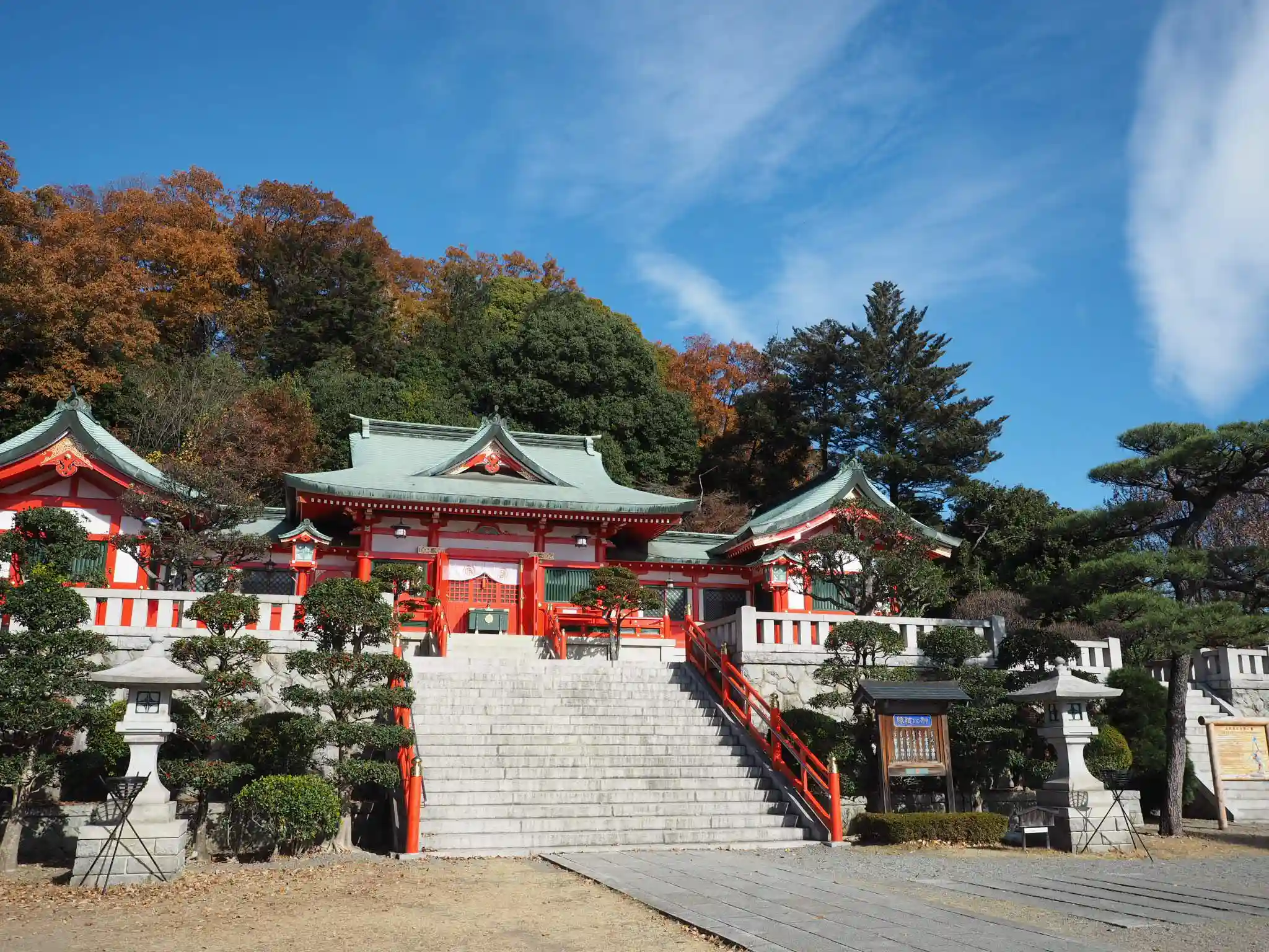 ちょうど紅葉の時期だったので、真っ青な空に真っ赤な社殿と真っ赤な紅葉が映えて🍁とっても美しく、