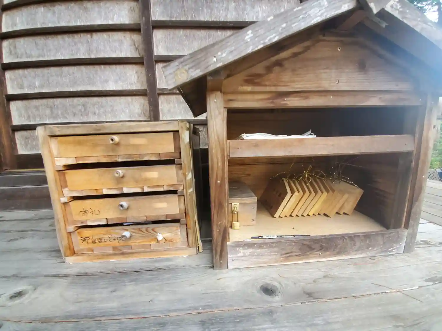 「ご自由にお持ちください」となってましたが、賽銭箱のもないお宮だったので、賽銭も兼ねて引き出しの中に少し納めて来ました。