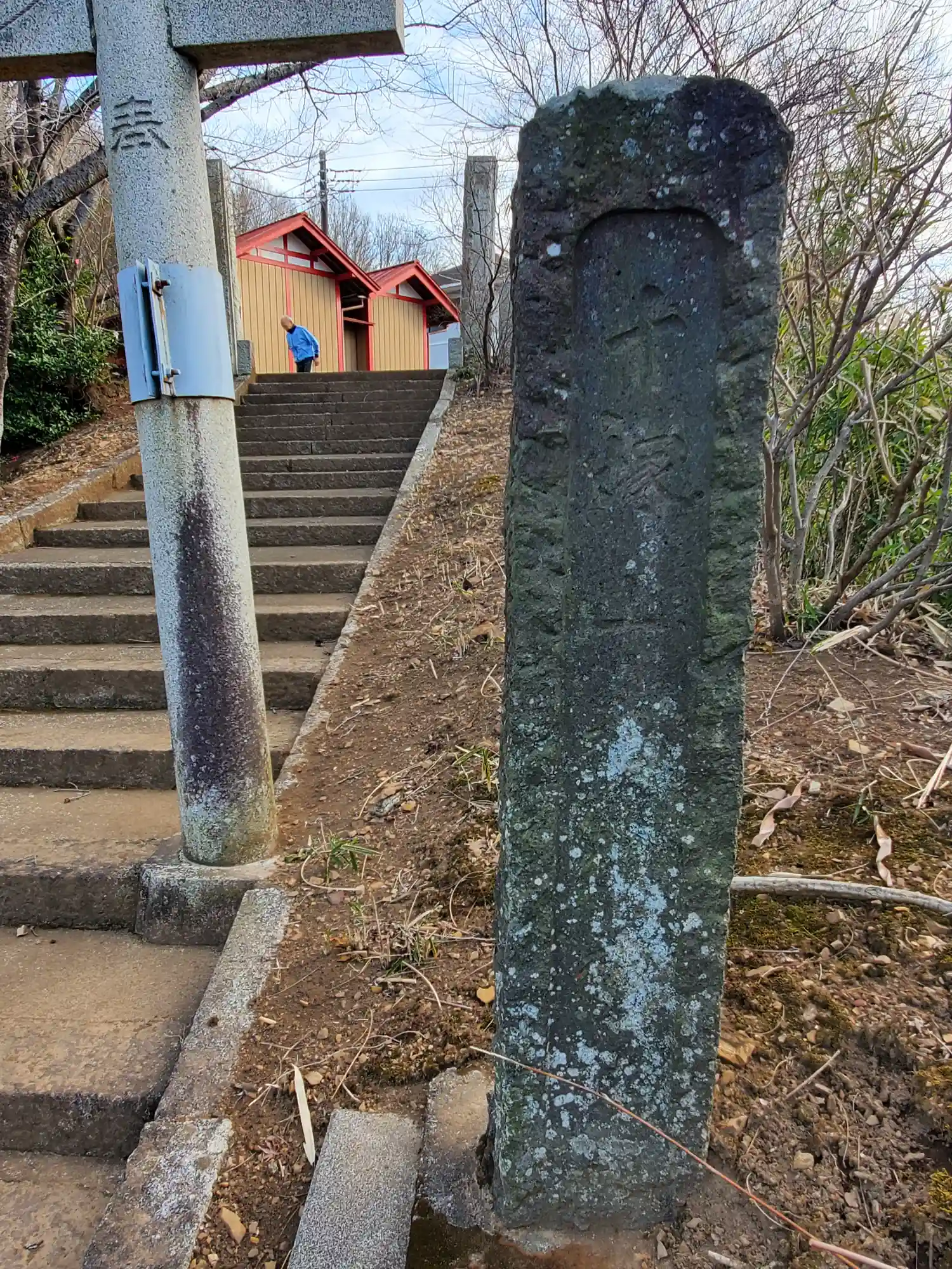 右側の参道には古い評柱