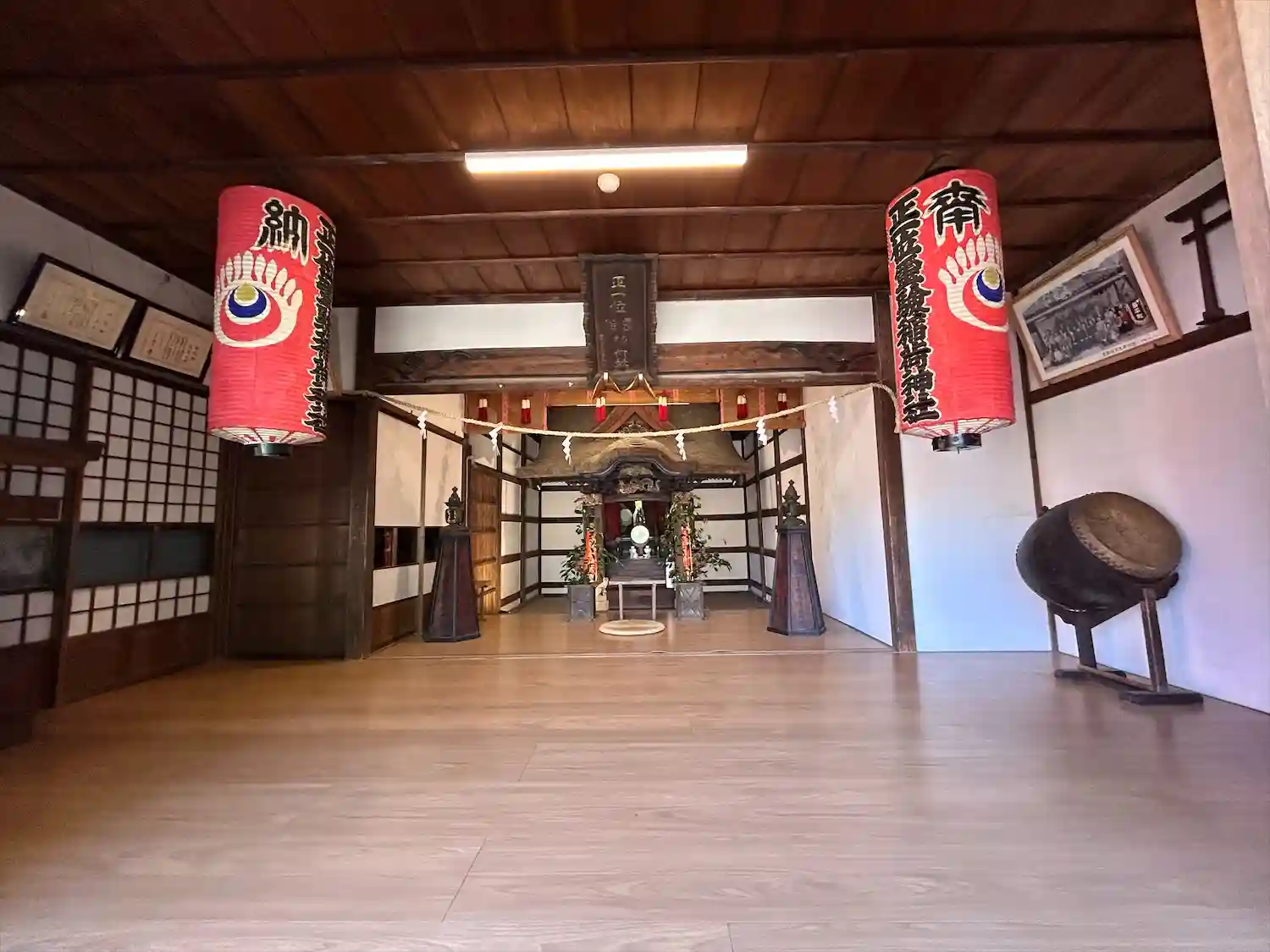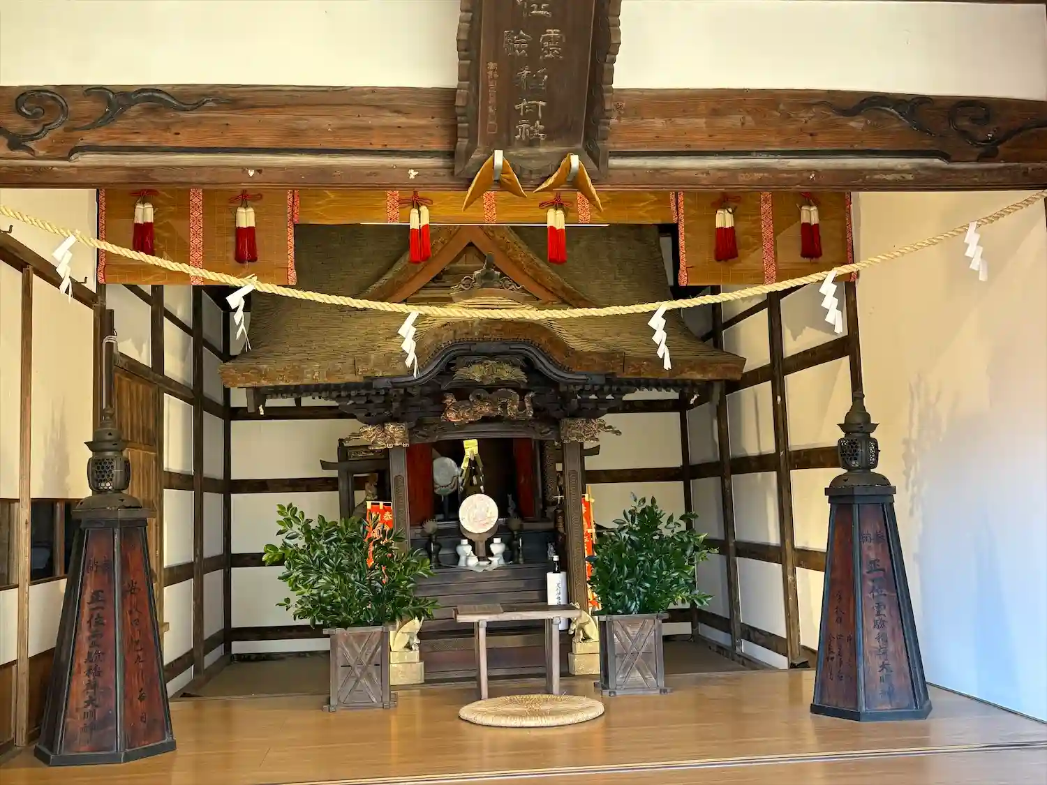 拝殿内 本殿、手前左右に安政四年(1857)佐野天明鋳物製燈籠
