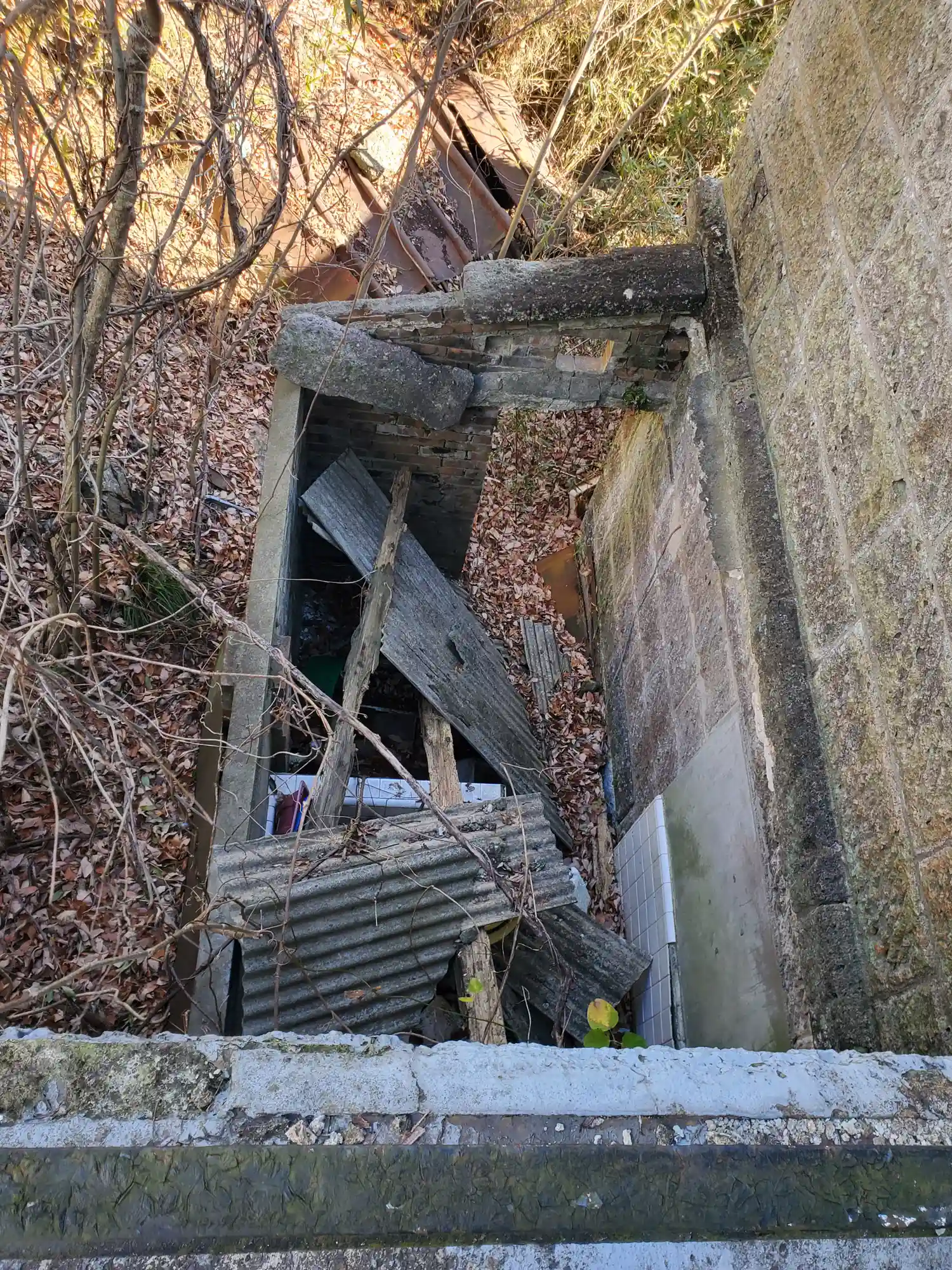 橋の下に物置か何かあったようだが、屋根は完全に崩落