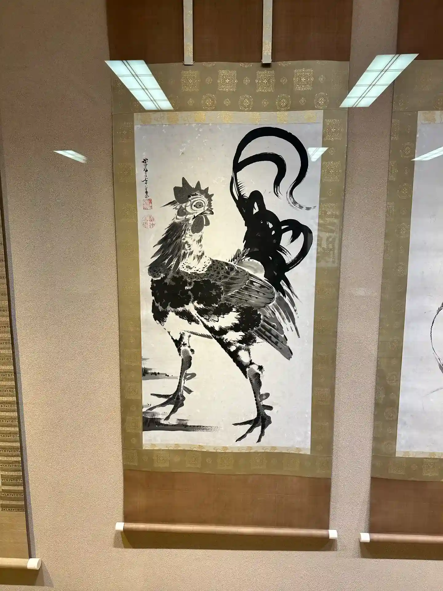 美術館併設。御朱印もらったら入場無料だそうで、御朱印帳の鶏さんが描かれた掛け軸もそこに。