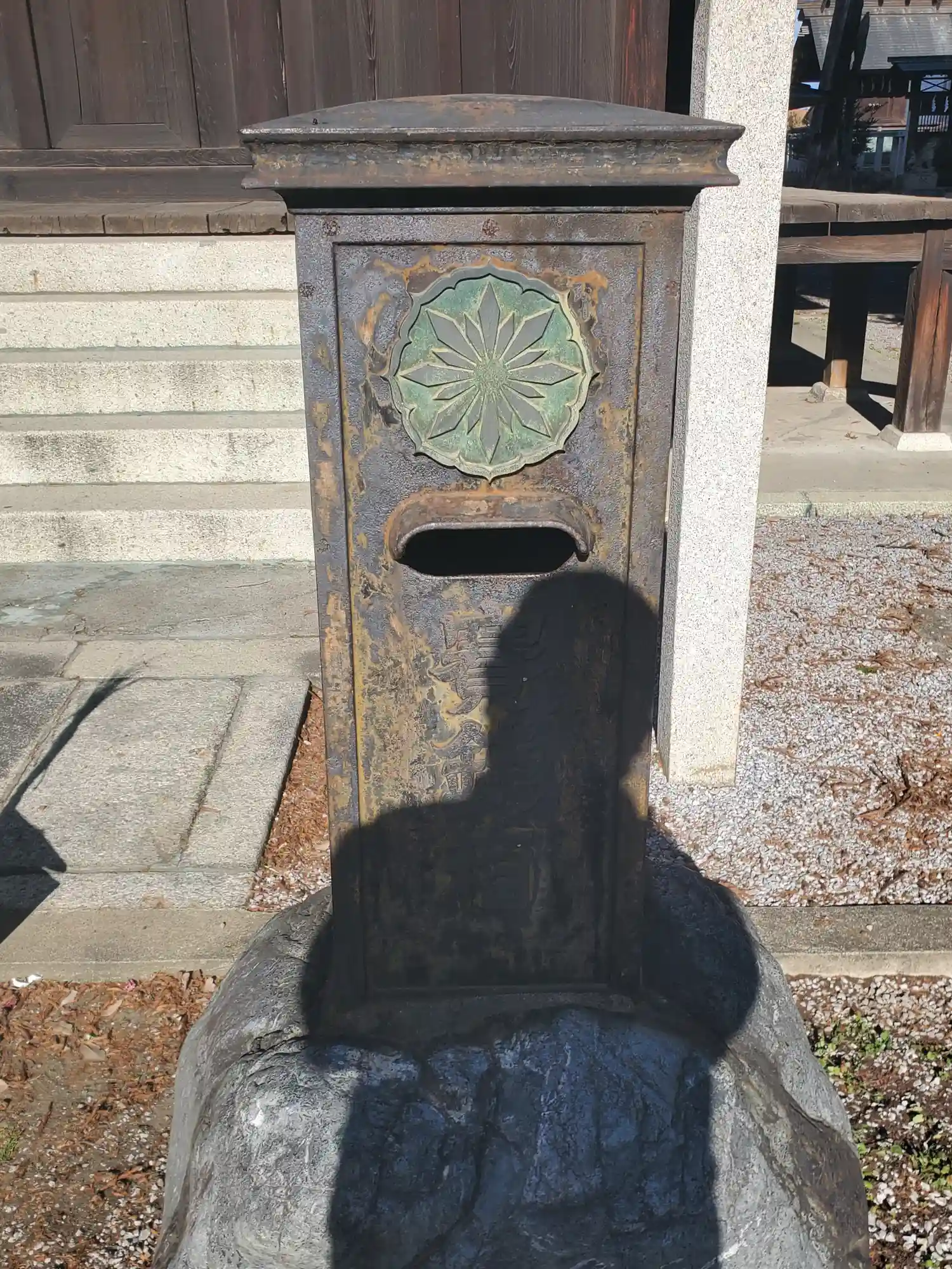 さっきの本社拝殿前にもあった、変わった形の<賽銭箱>。青銅製のハイカラな感じからすると明治期に造られたのかな?