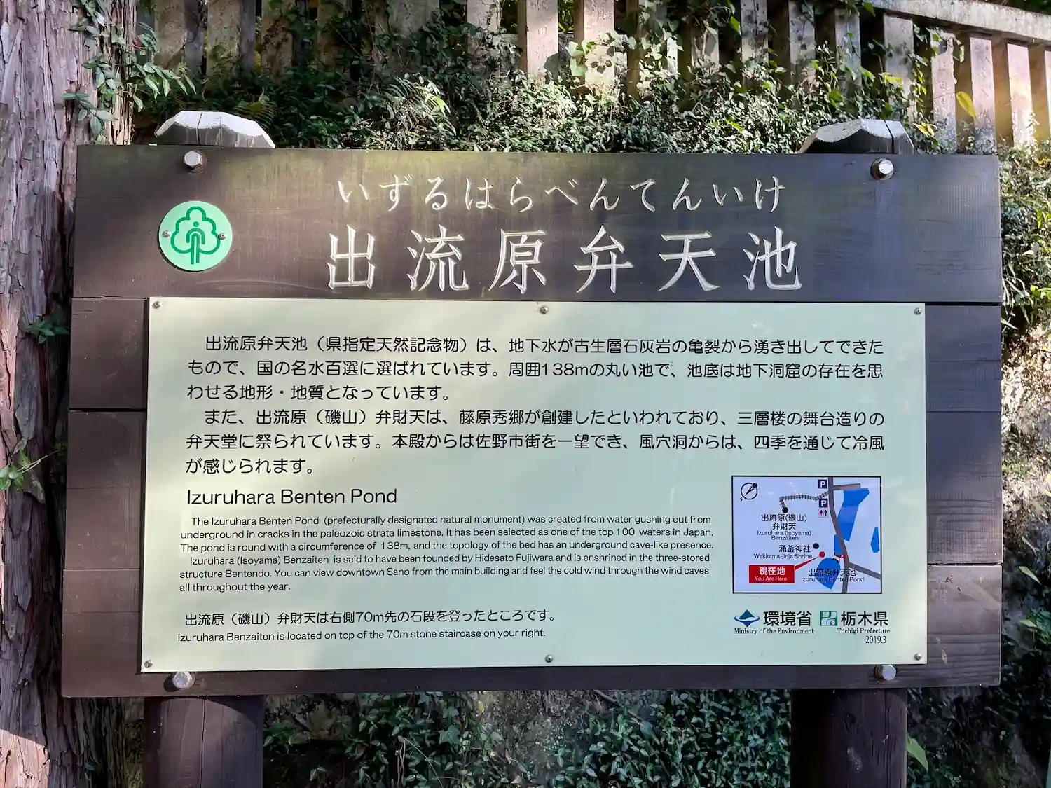 大正2年に旧地より現在地に造営遷宮し、名水百選にも指定されている「出流原弁天池(いずるはらべんてんいけ)」の横に鎮座している。