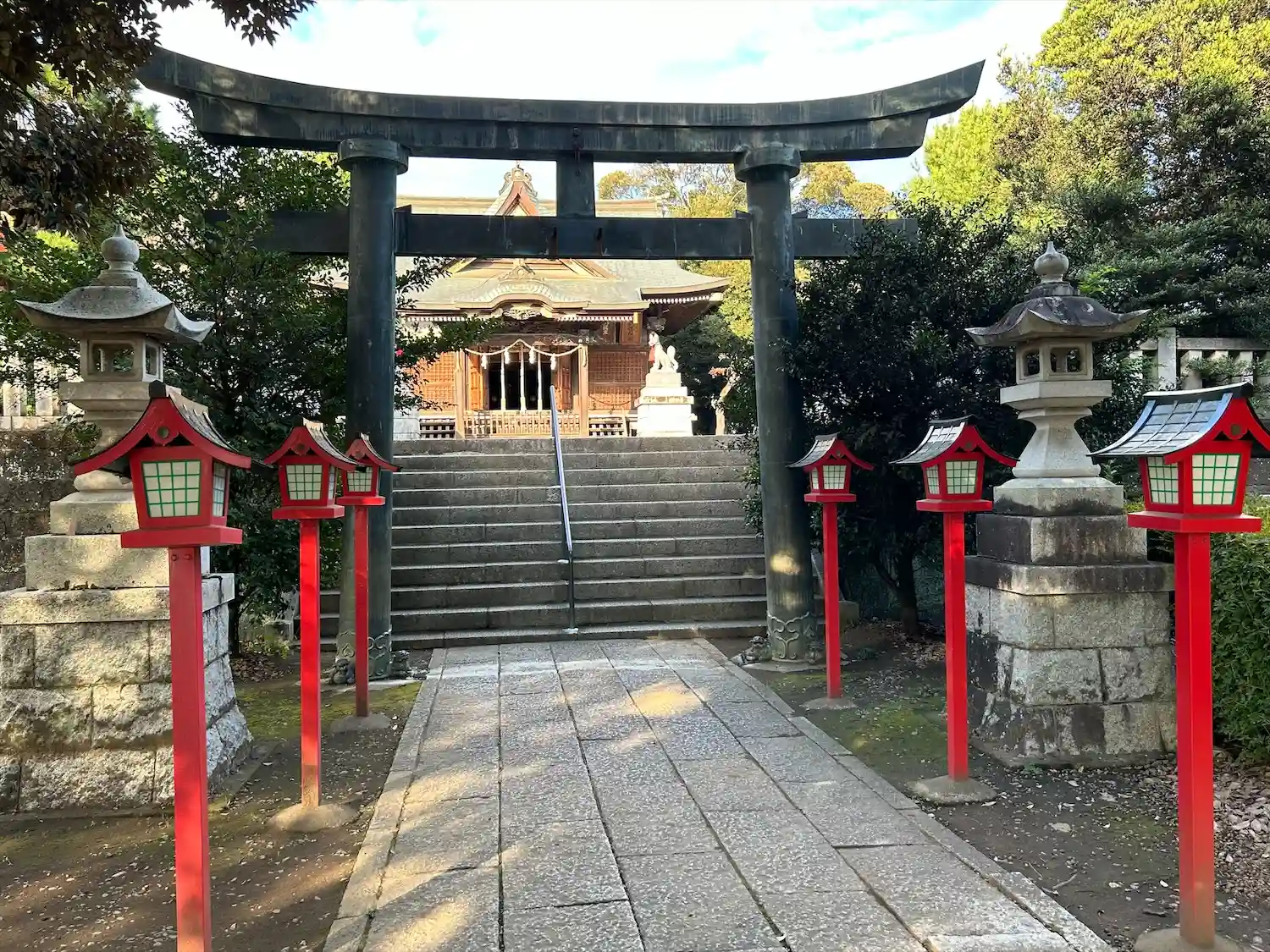 田沼駅から歩いてきて鳥居が見えた時の風景 右側は神社の駐車場です