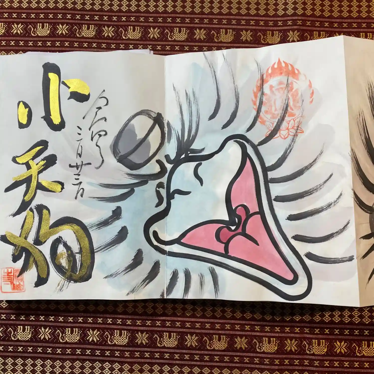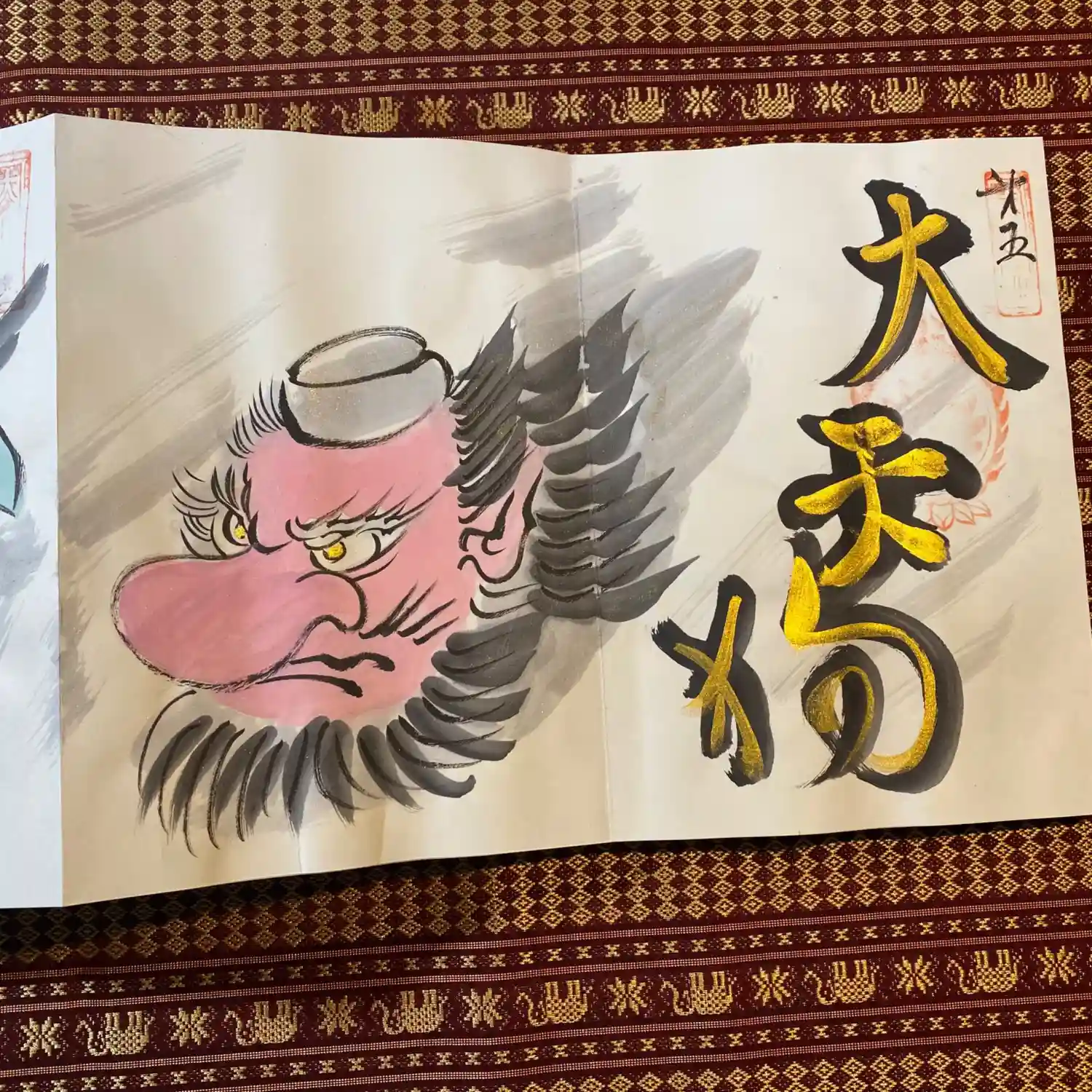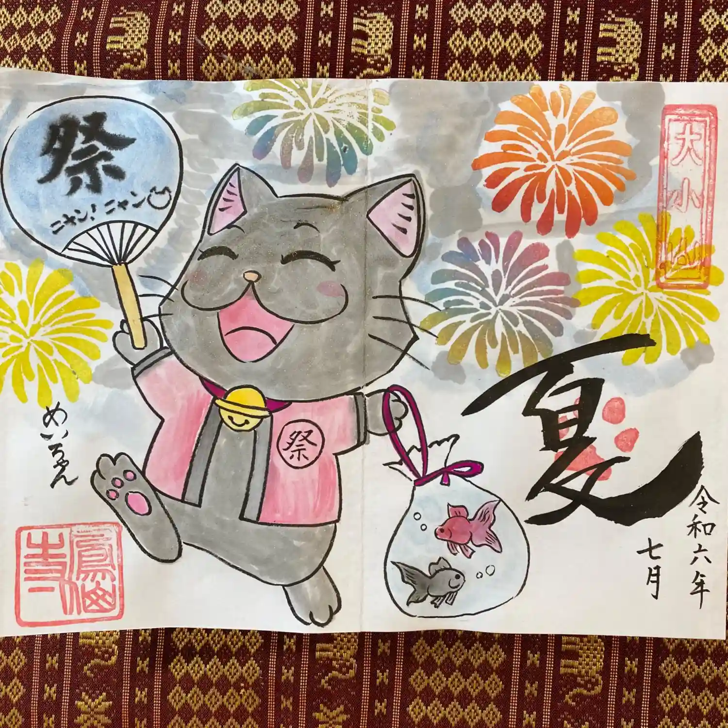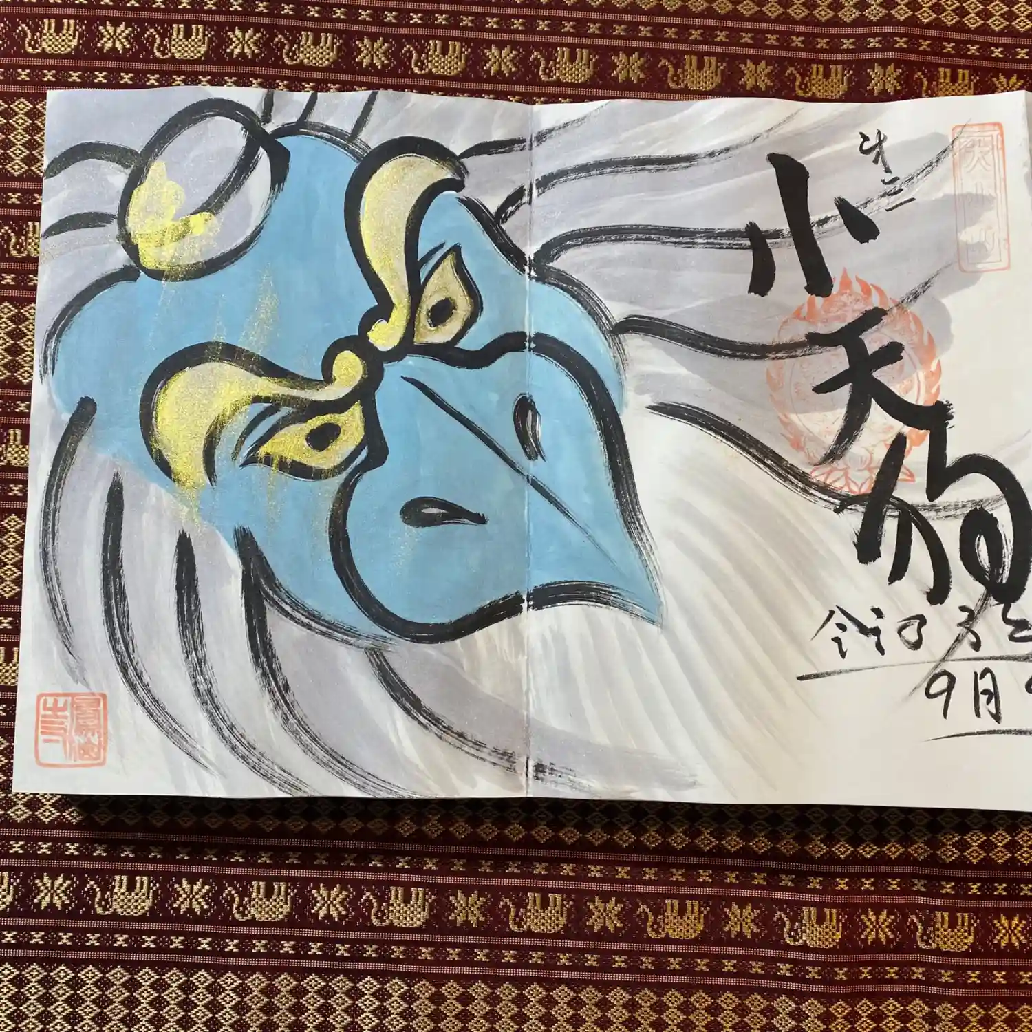 先月末に登場した八大天狗の参「比良 治郎坊」大判の御朱印帳の2面から4面まで対応しております。うちわは夏限定の福猫うちわです。