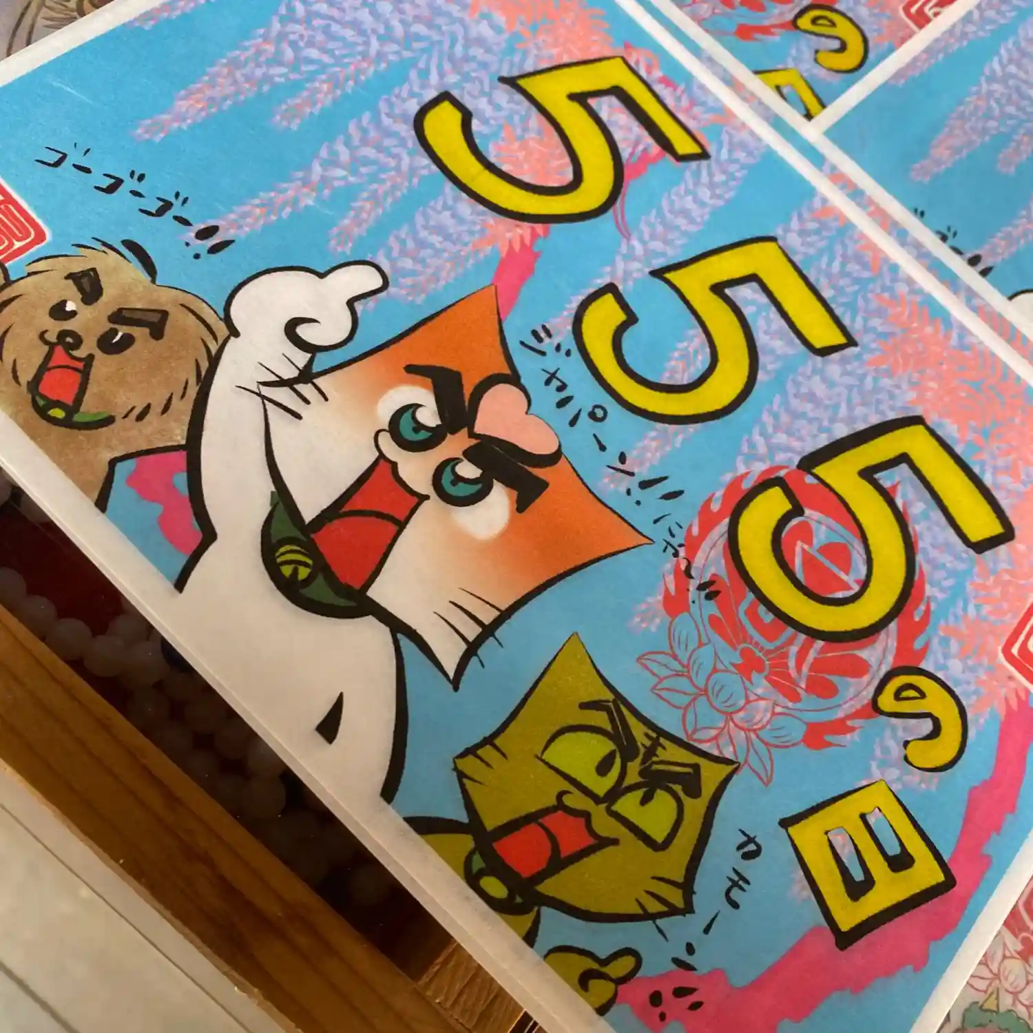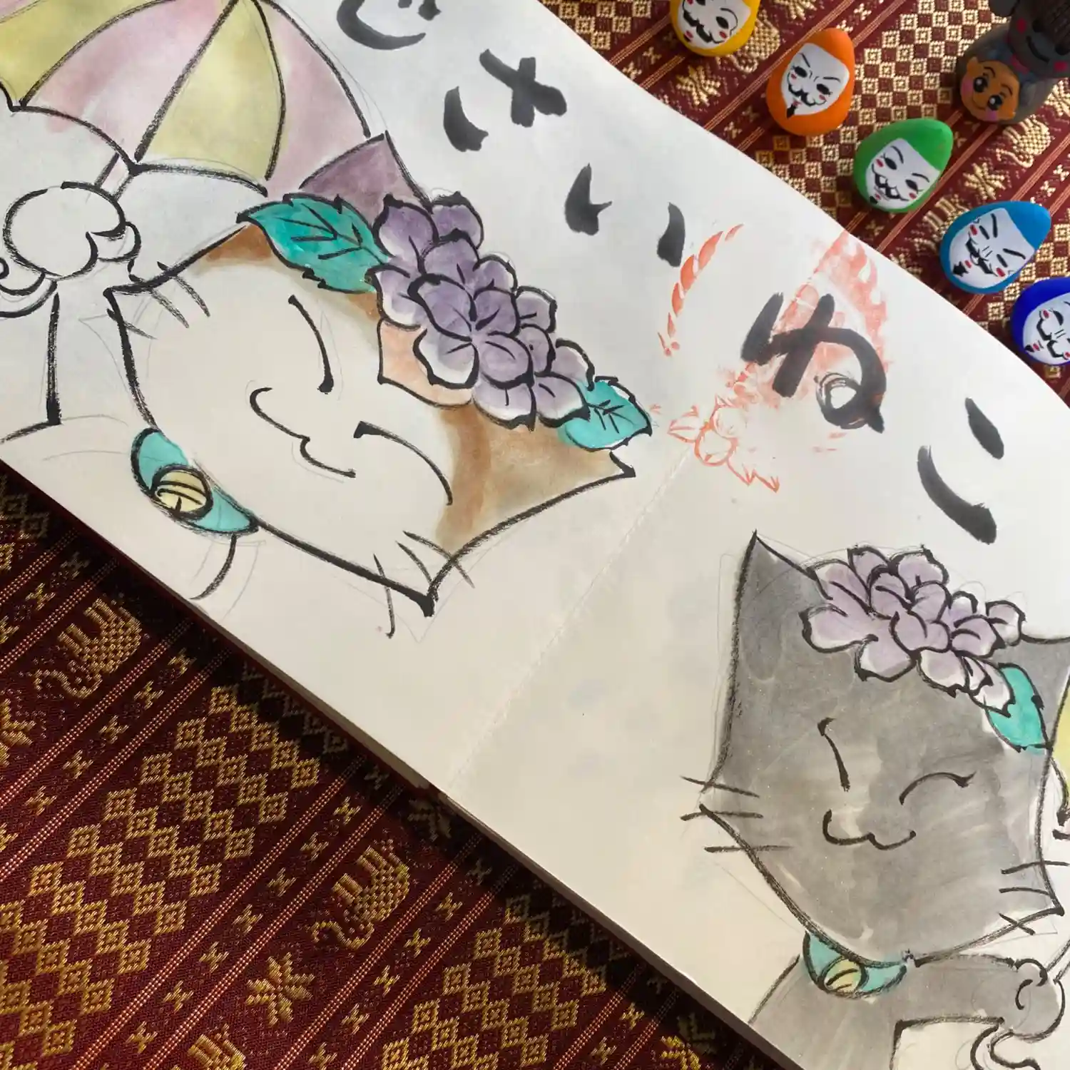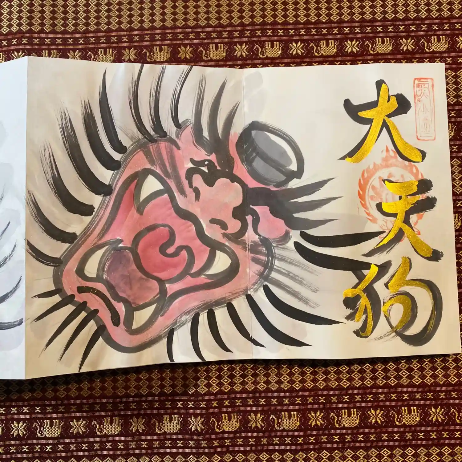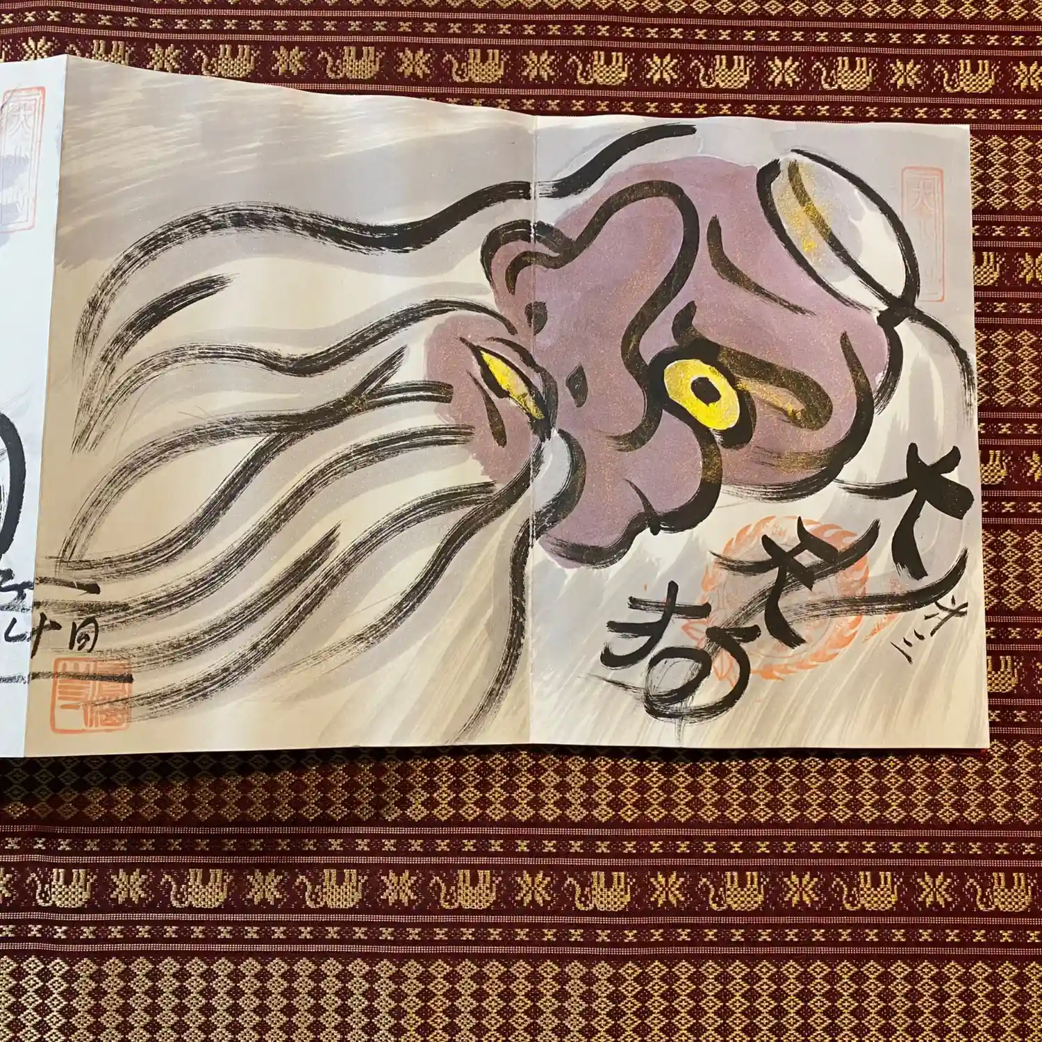 先月末に登場した八大天狗の参「比良 治郎坊」大判の御朱印帳の2面から4面まで対応しております。うちわは夏限定の福猫うちわです。