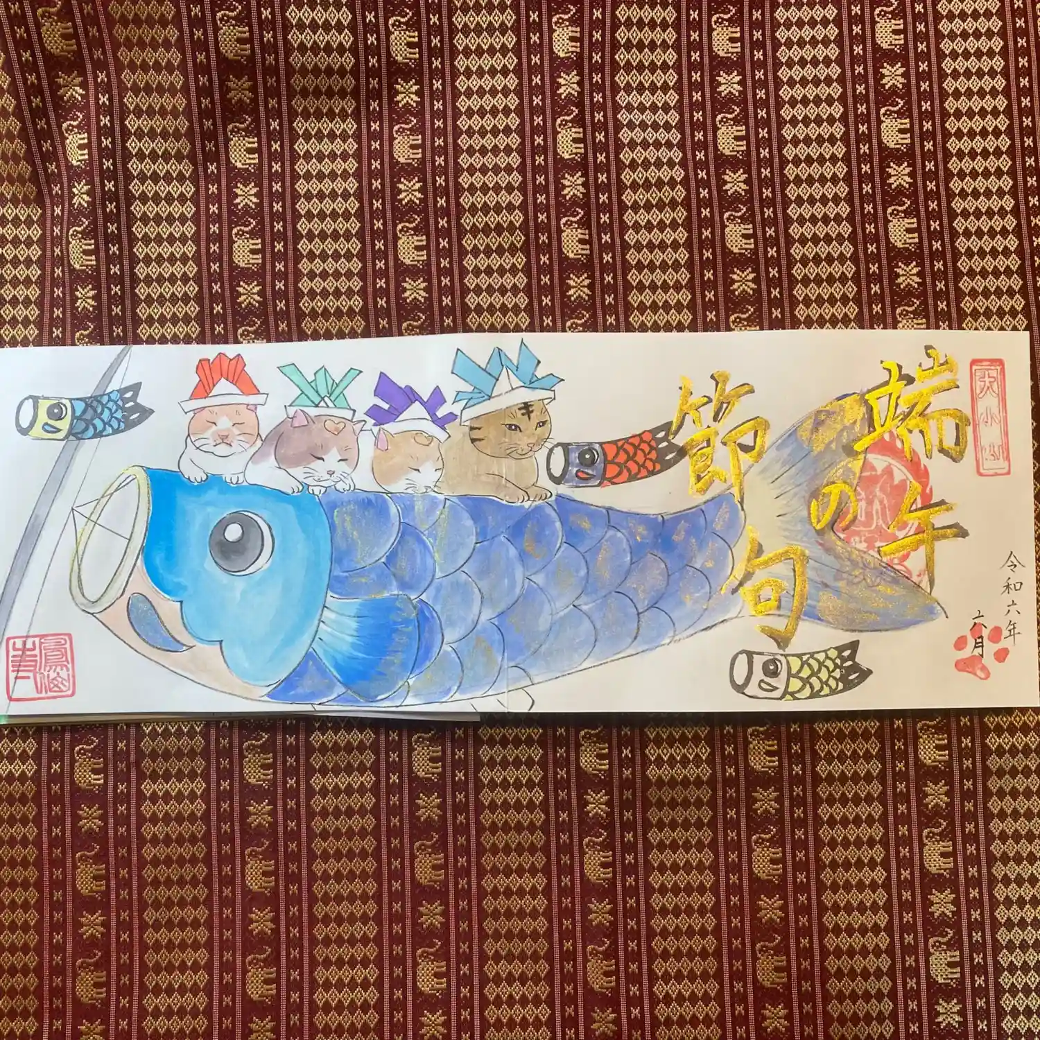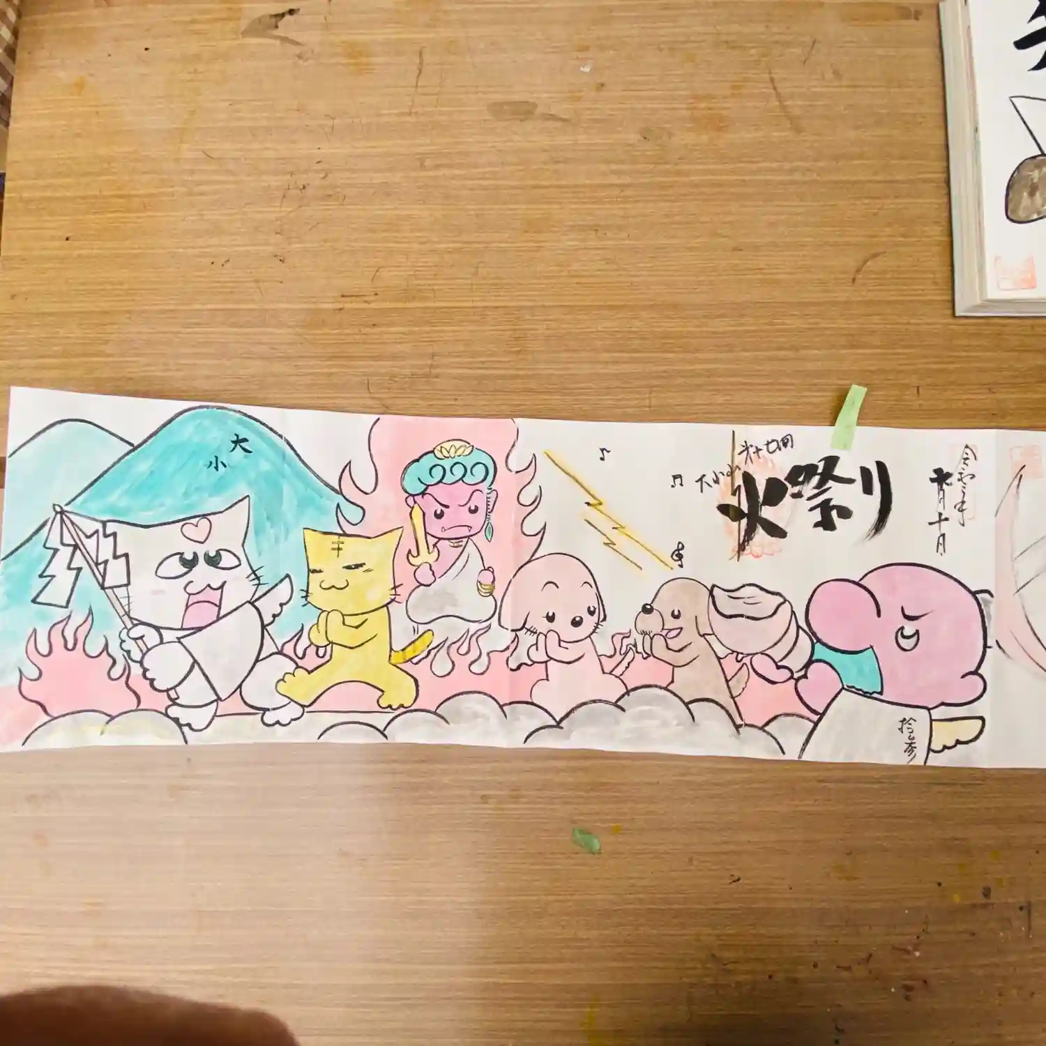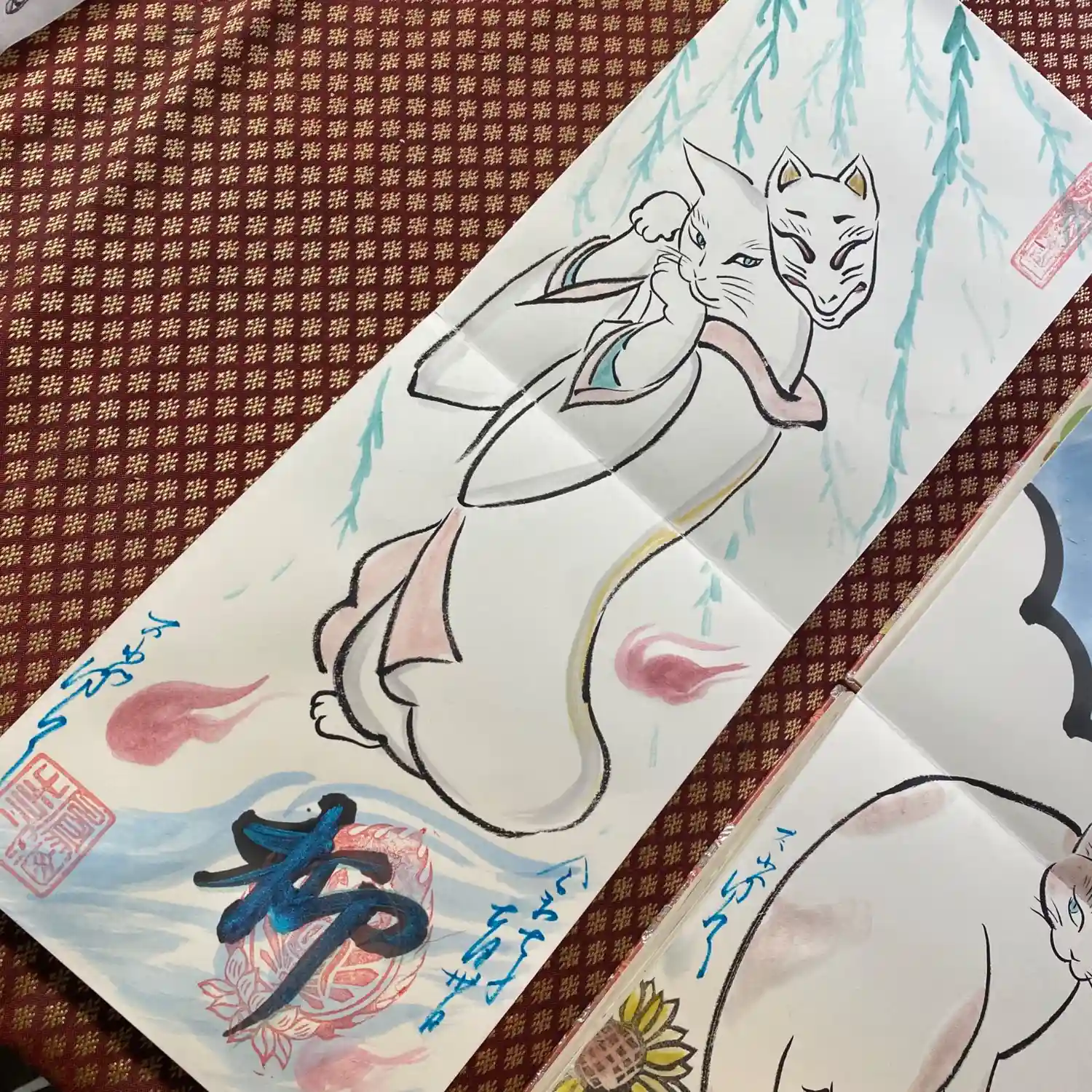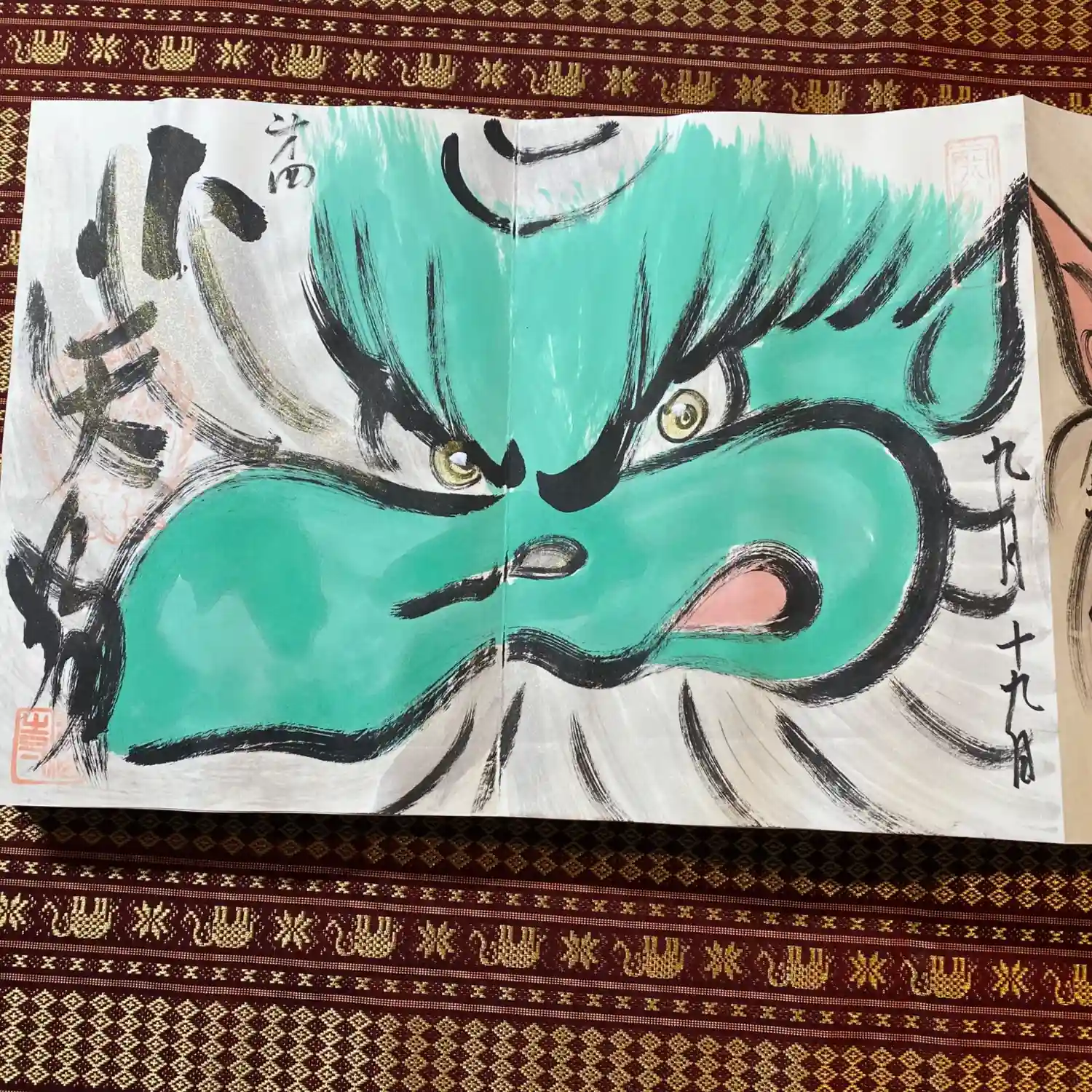 先月末に登場した八大天狗の参「比良 治郎坊」大判の御朱印帳の2面から4面まで対応しております。うちわは夏限定の福猫うちわです。