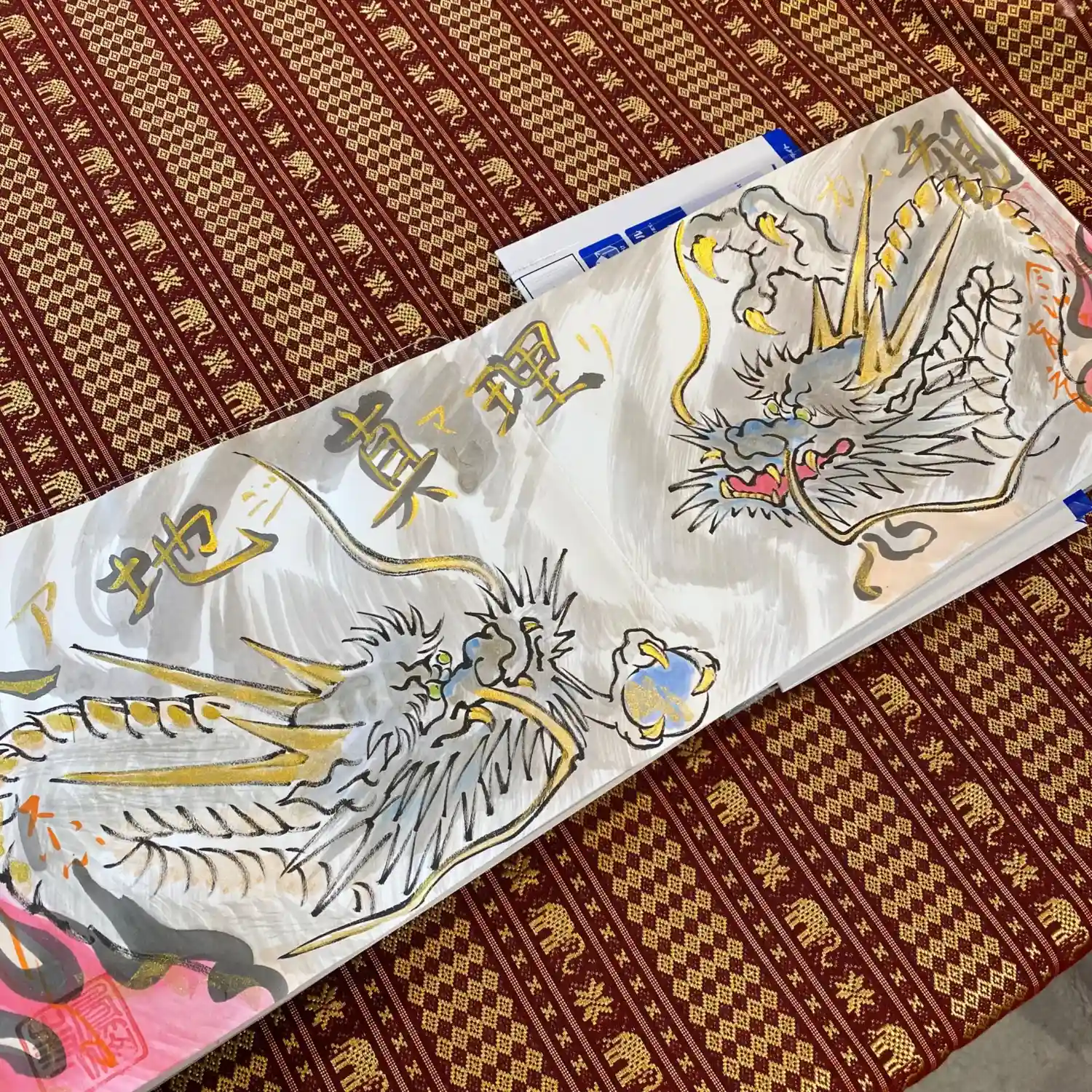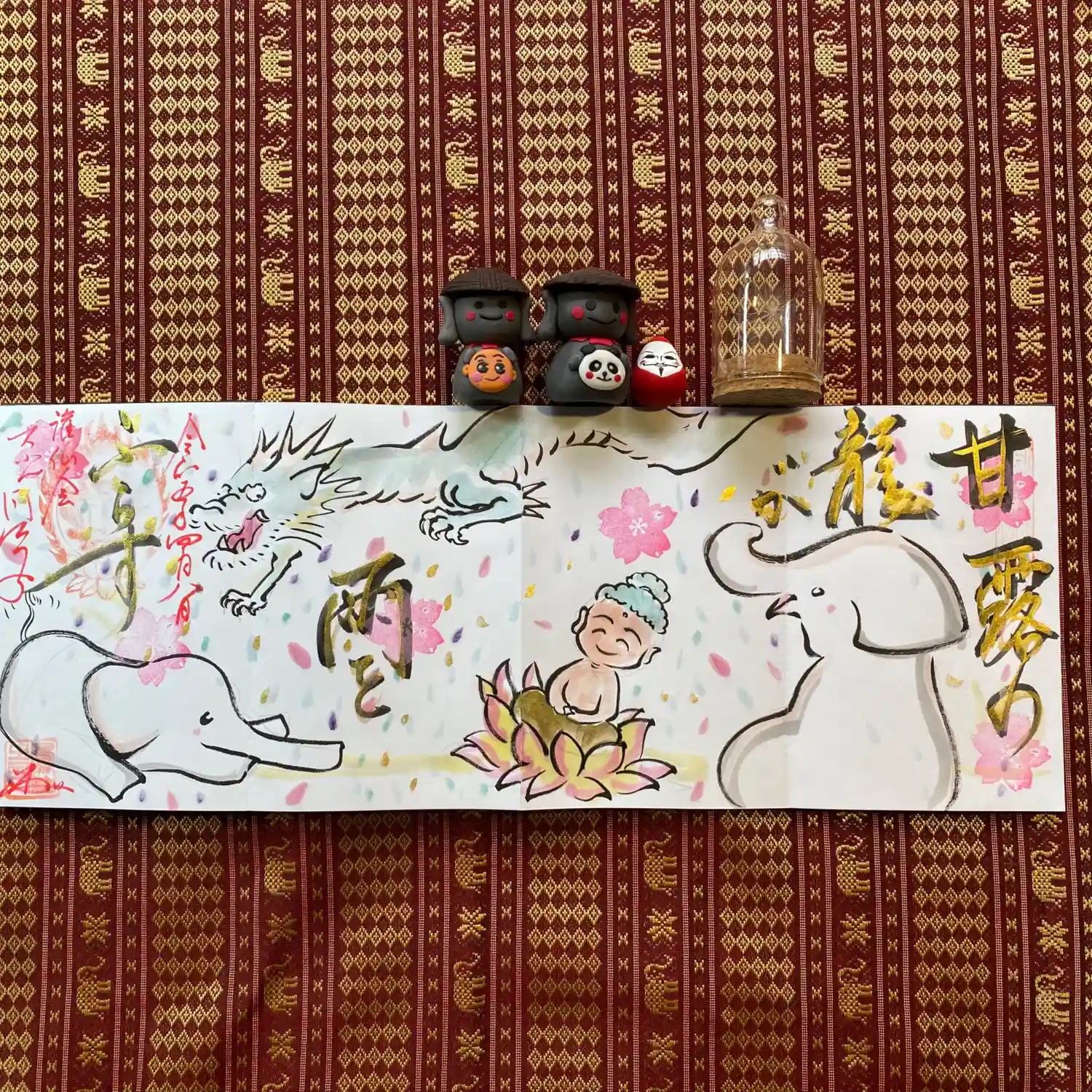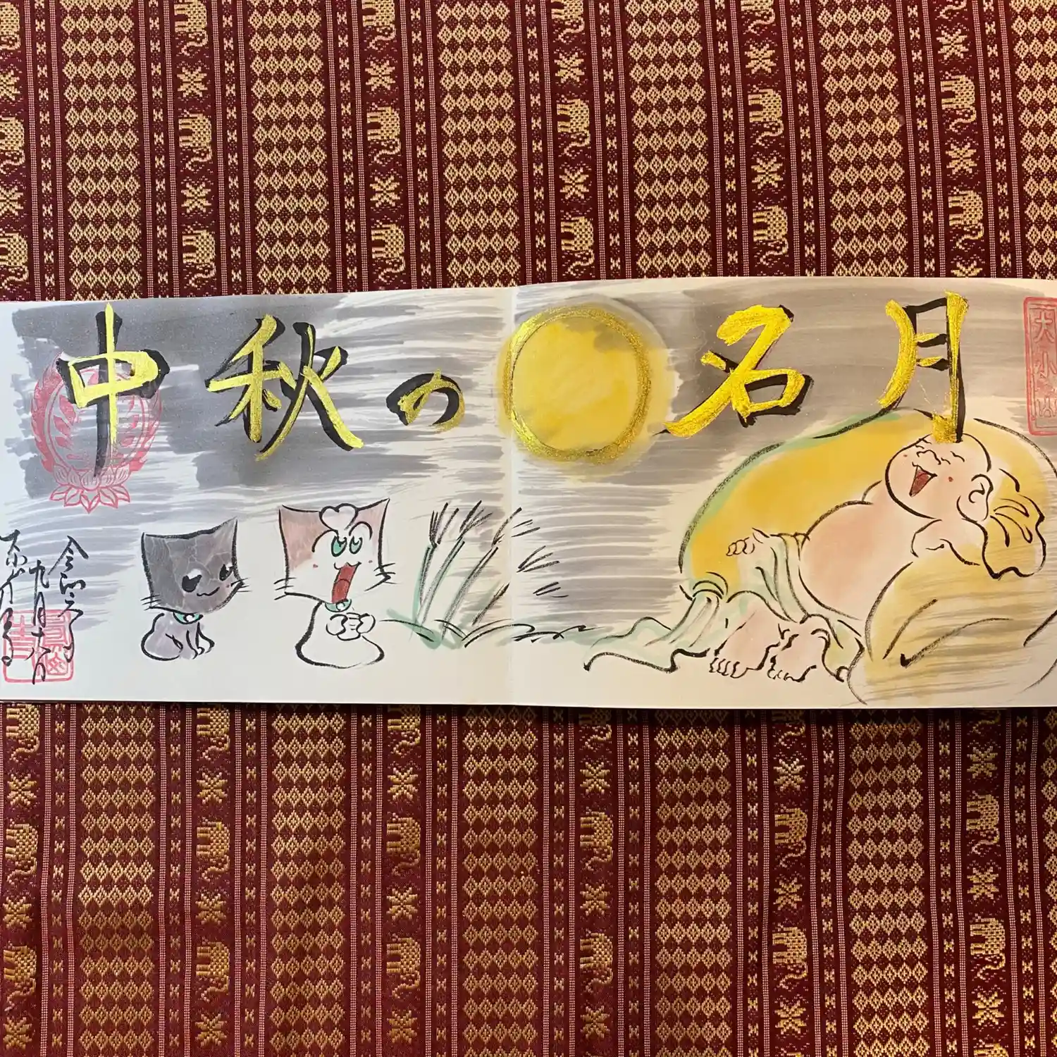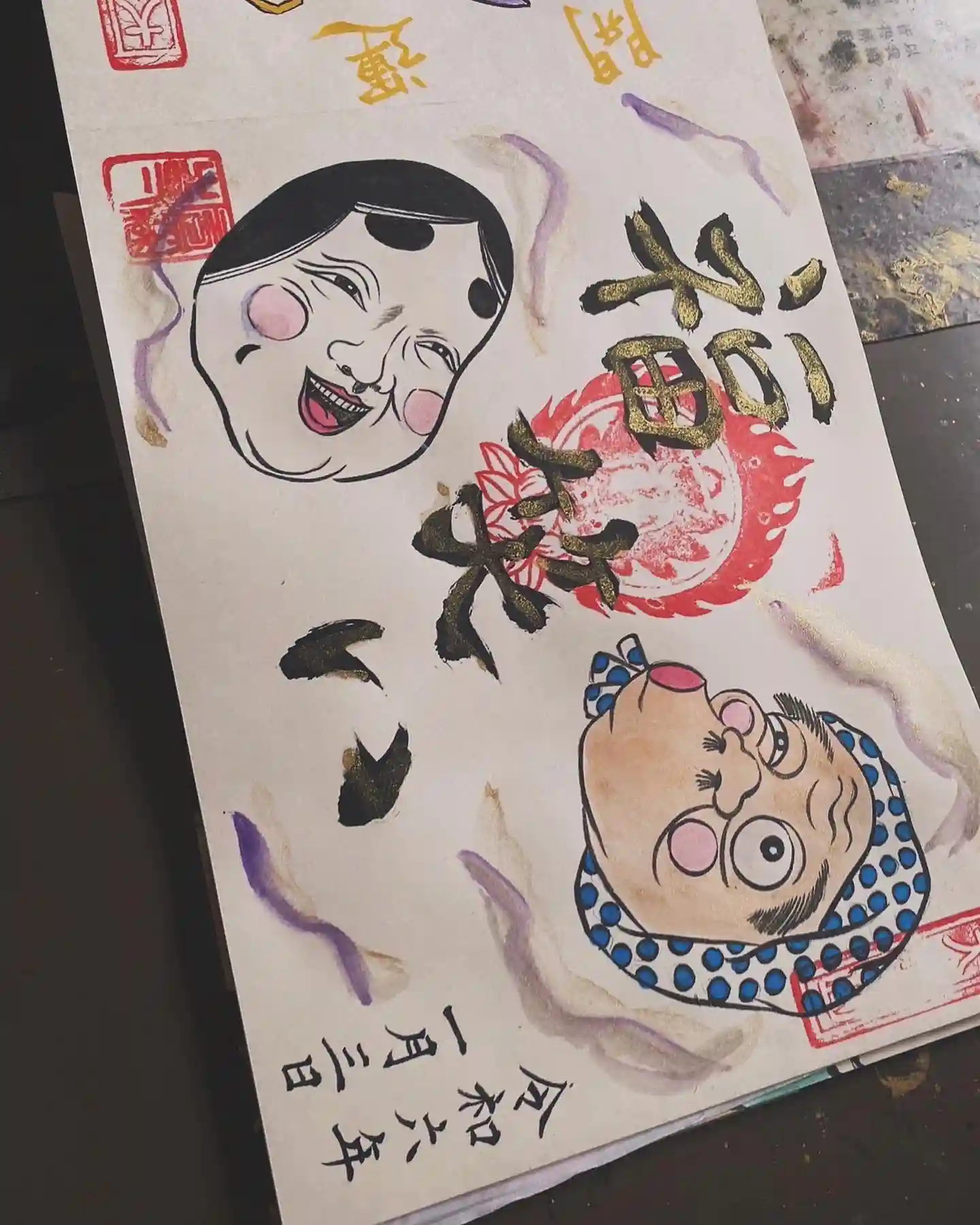 写真は宮城県の山元町のホールで、1日美術館が行われた時の様子✨鳳仙寺の御朱印帳も展示して頂きました✨奥には小松美和さんの作品が見えます✨一流のアーティストさん達の作品の末席に✨