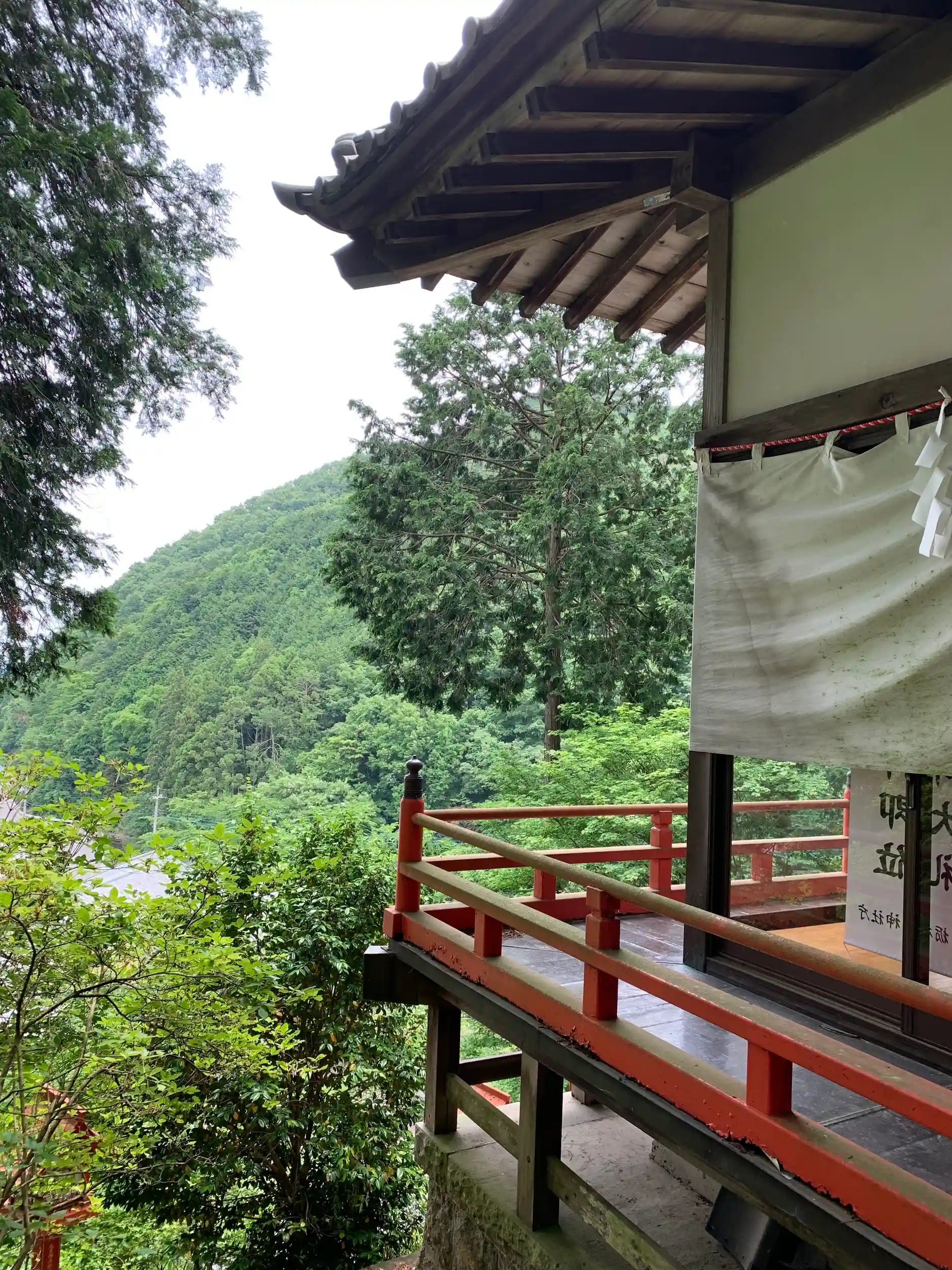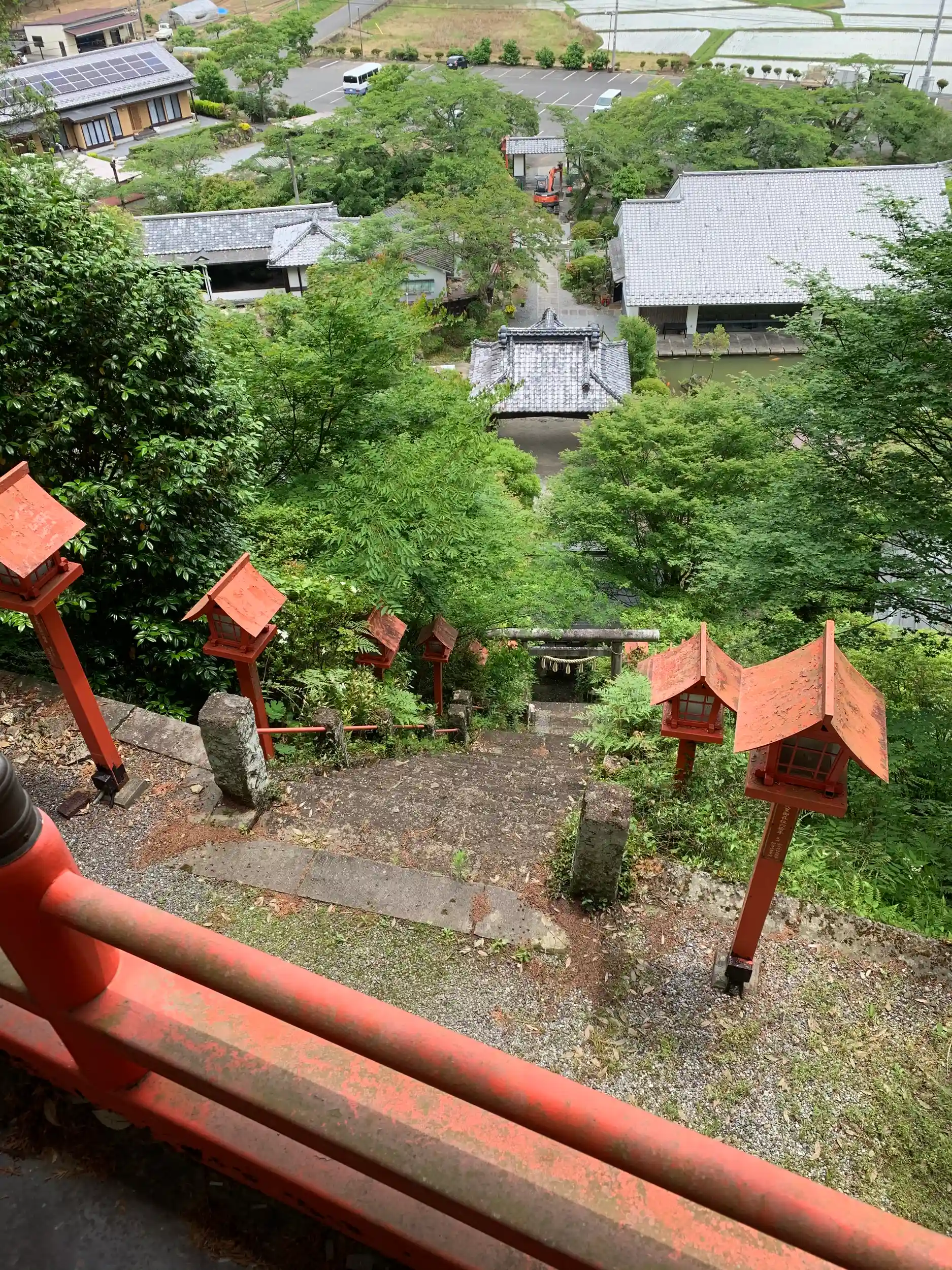 本殿から見た石段は傾斜、何度って言うんだろう。