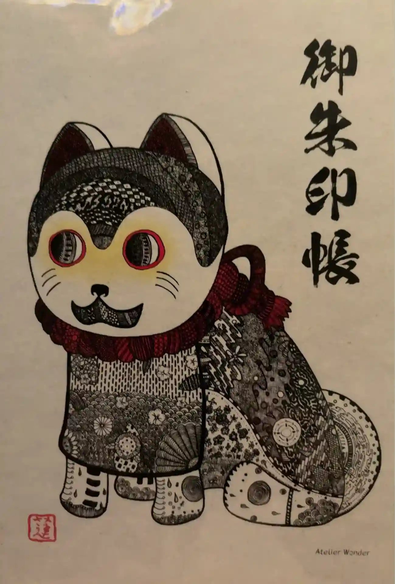 張子の犬の絵の作者は関口蓮さん。精密な線画を描く若手作家さん。