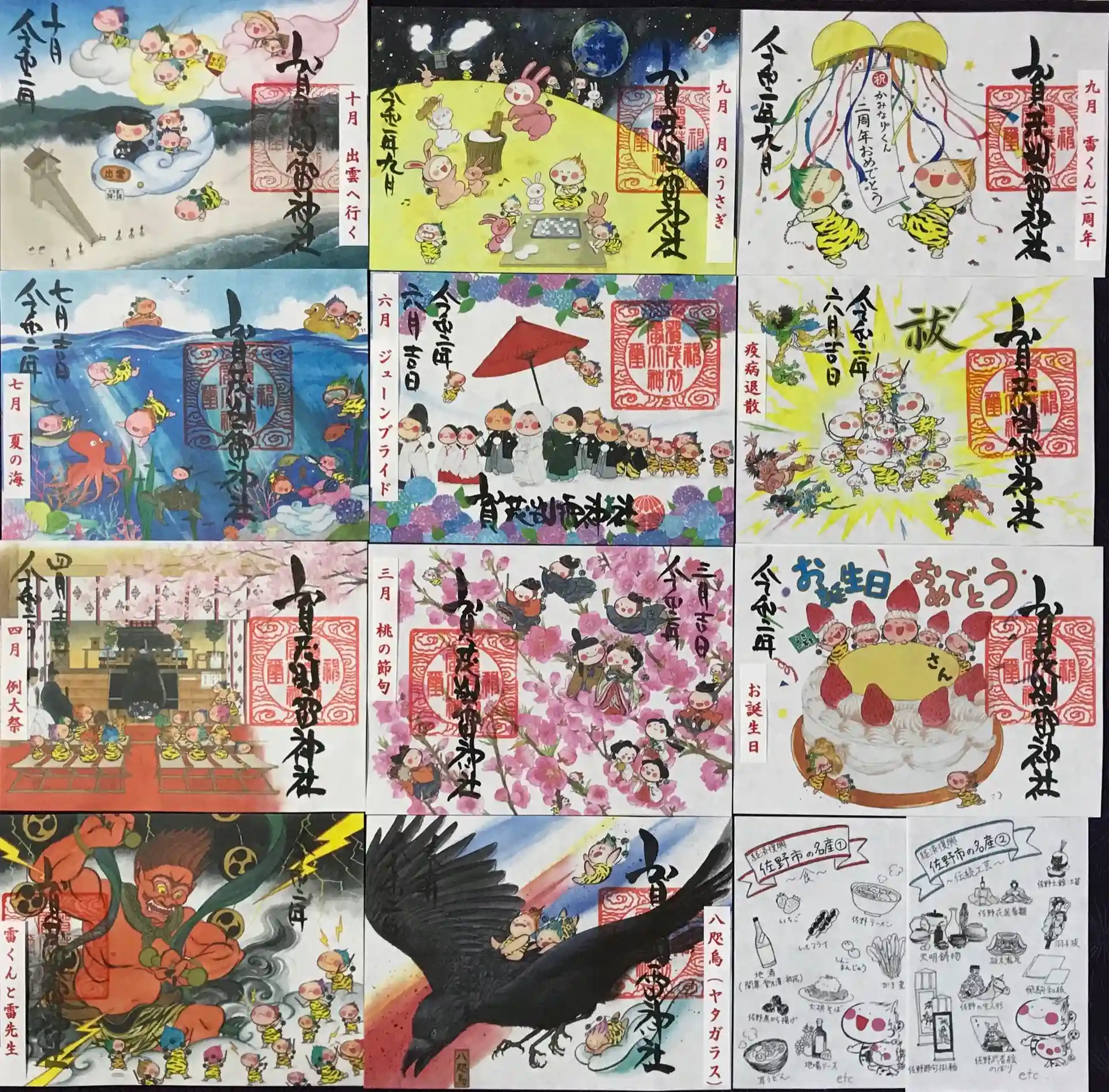 10月の雷くん御朱印のご案内です。『雷くん出雲へ行く』神在月に神様の集会に参加する為、雷くん達が佐野市の土産を持って出雲へやってきました。皆様のお詣りをお待ちしております。また、遥拝、写詞による「雷くん御朱印」各種※(8月の肝試しは終了)と「雷くん飛躍お守り(初穂料千円)」の郵送対応も致します。対応方法の詳細は、添付画像の内容を良くお読み頂き、お申し込み下さい。