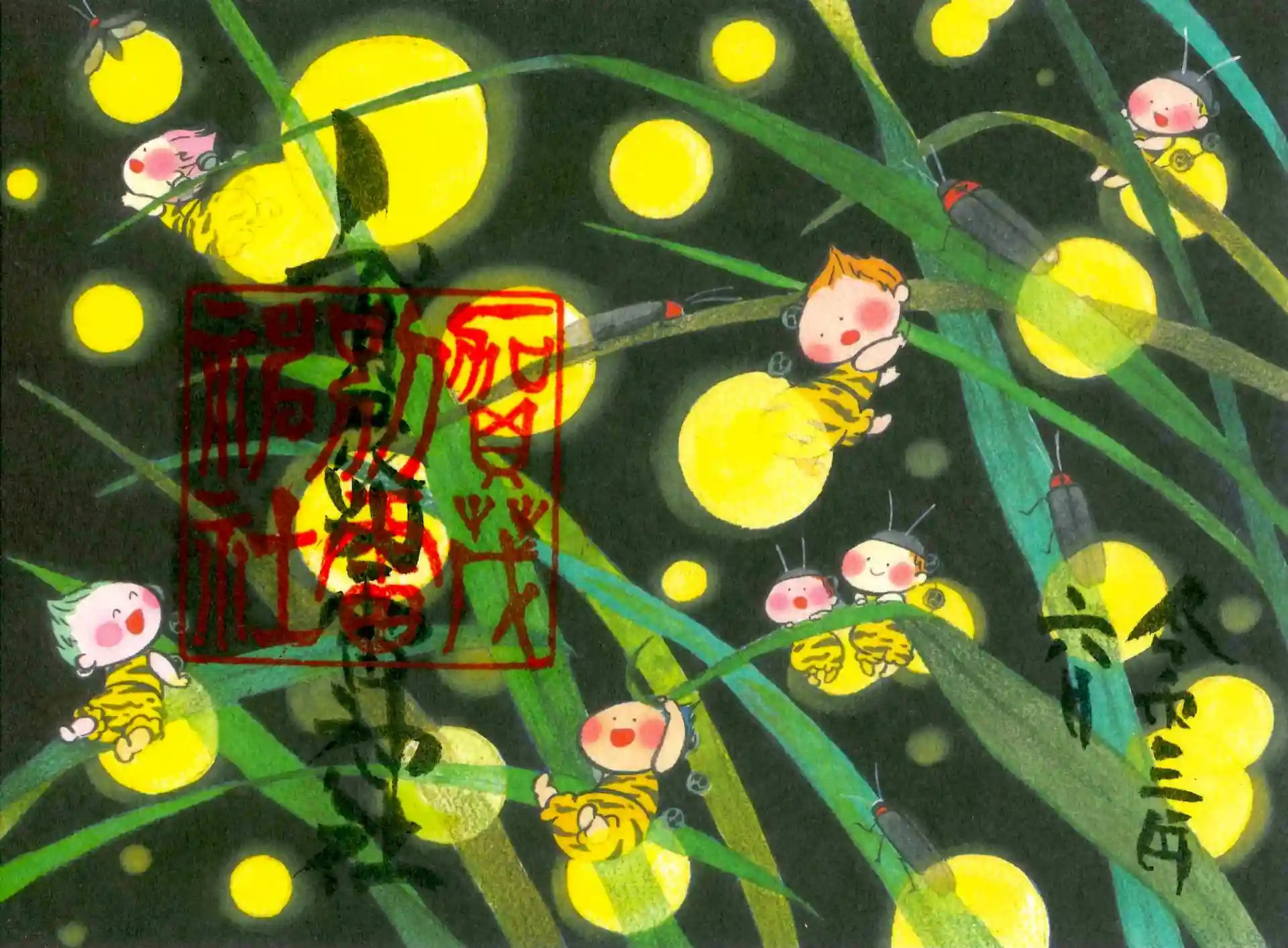 6月の雷くん御朱印のご案内です。『雷くんと蛍の夕べ』暗闇の中に浮かび上がる幻想的な蛍と雷くん。雷くんのお尻も蛍につられて光っています。郵送対応方法は下記リンクをご参照下さい。