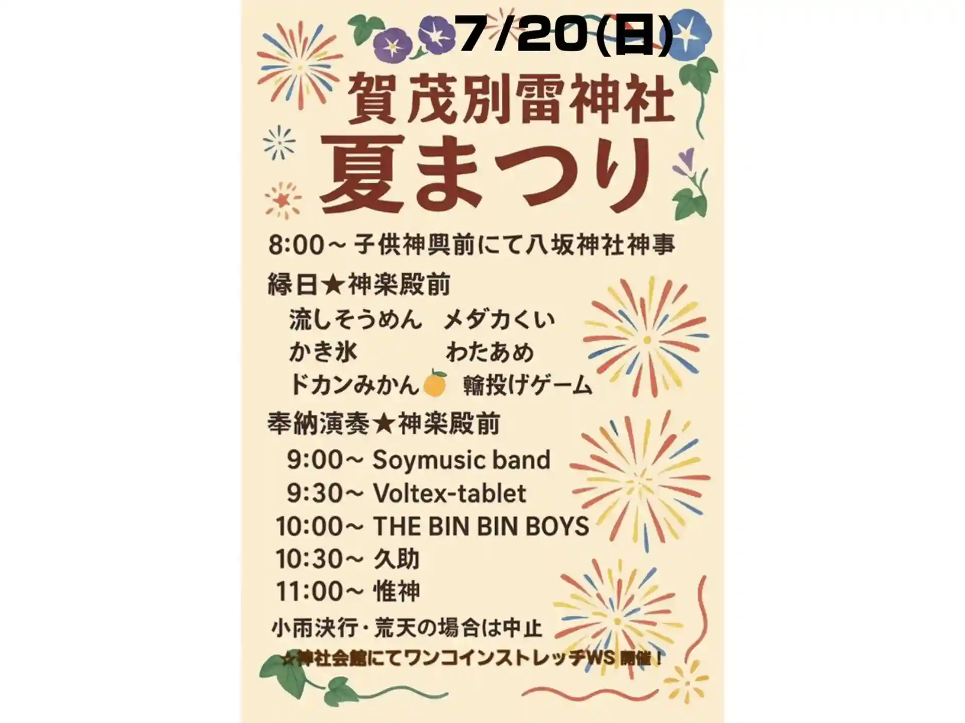 9時〜13時くらいまで、神楽殿前広場にてミニ縁日を行う他、神楽殿では有志による音楽奉納ライプが行われ、拝殿前の広場でもキッチンカーなどが出店します。