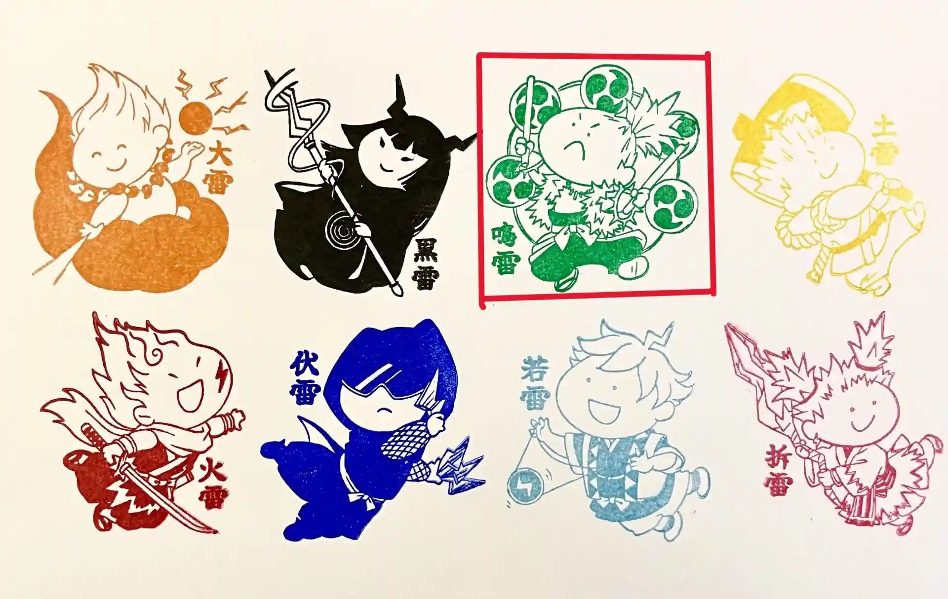モチーフに、御朱印帳に片面または見開きで、御朱印を金色で直書きして八雷神スタンプを押印します。
