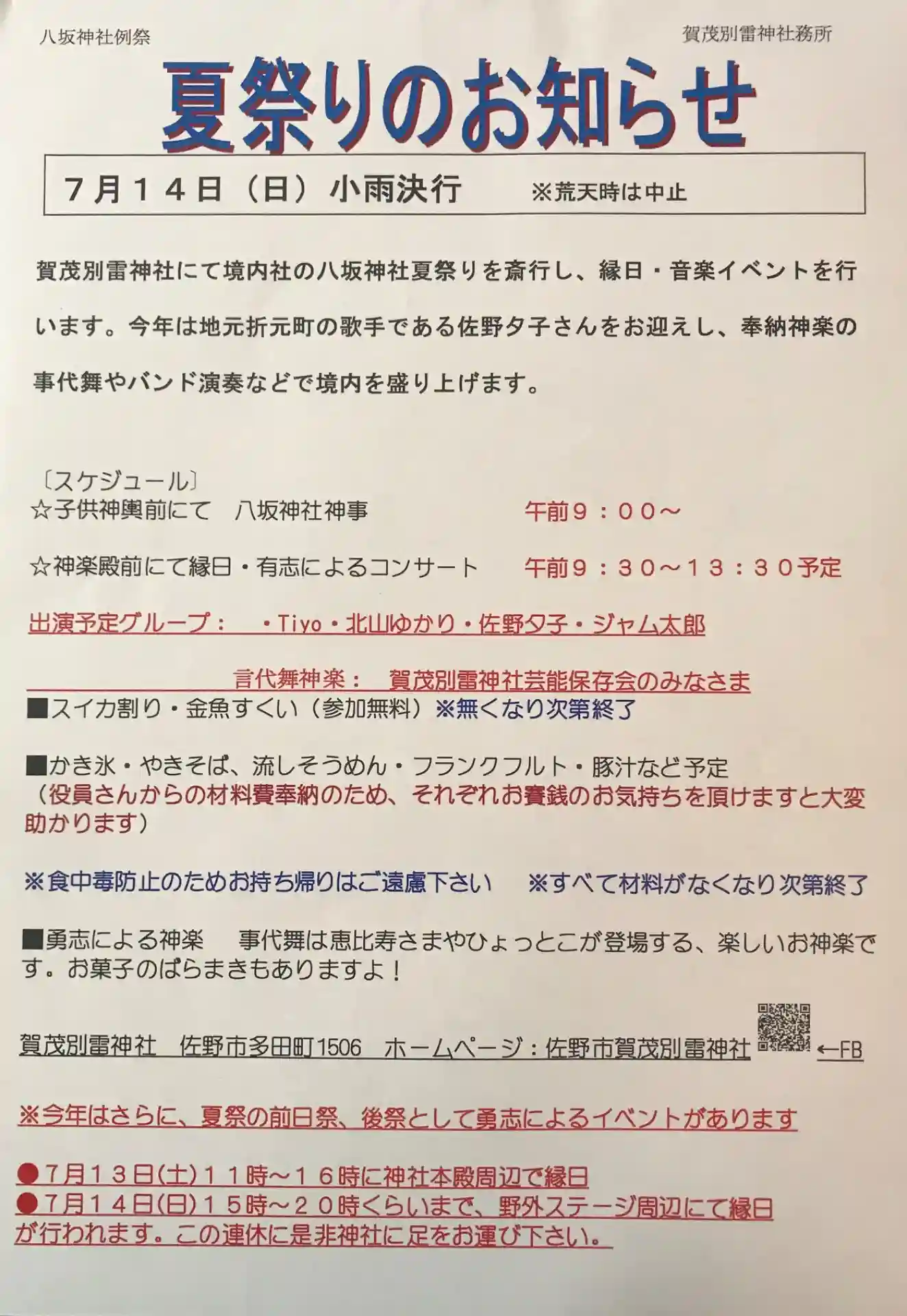 夏例祭の前後に別枠で付帯イベントも行われます。そこで7月13、14日に「夏祭」、15日に「海の日」…