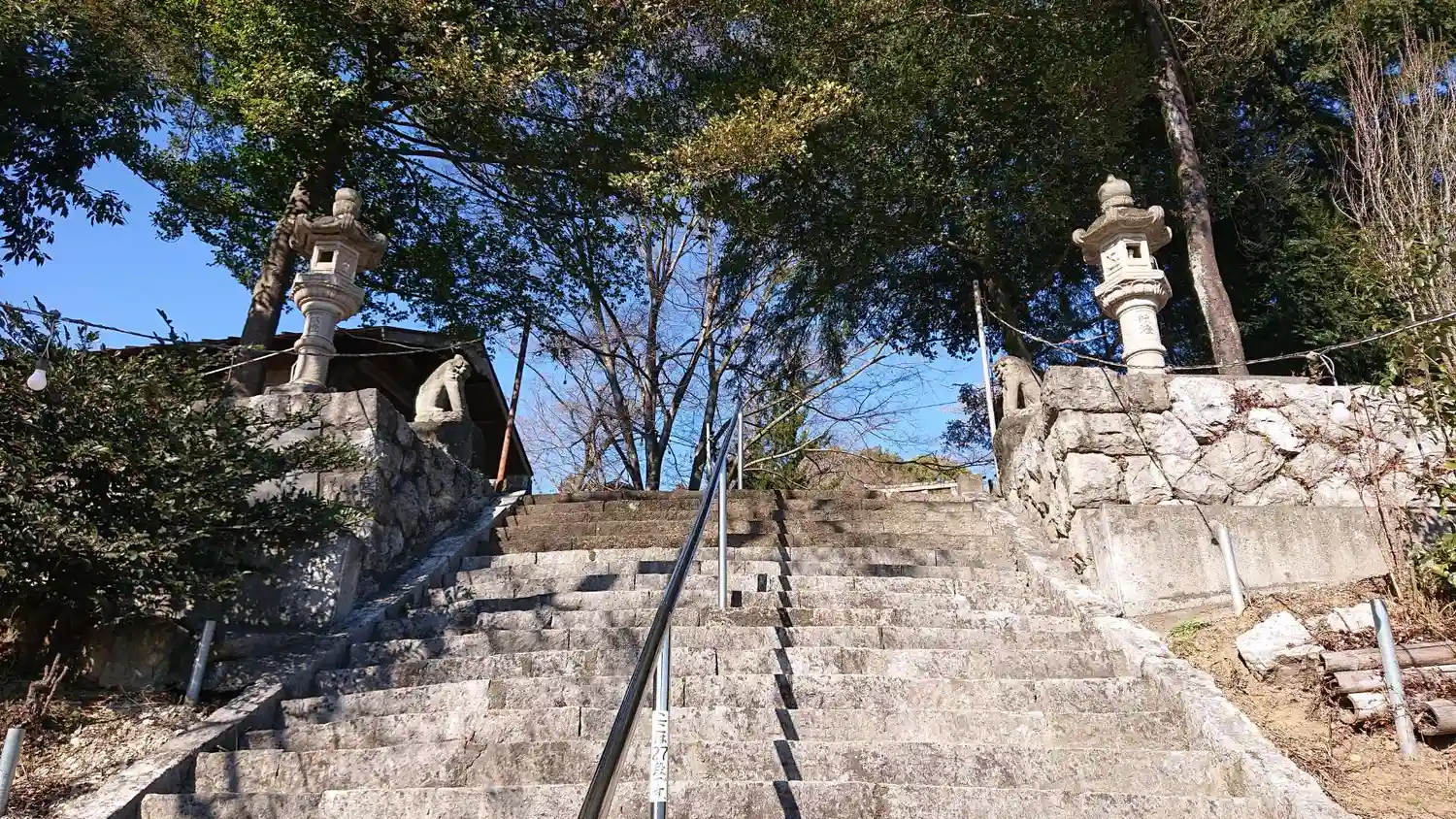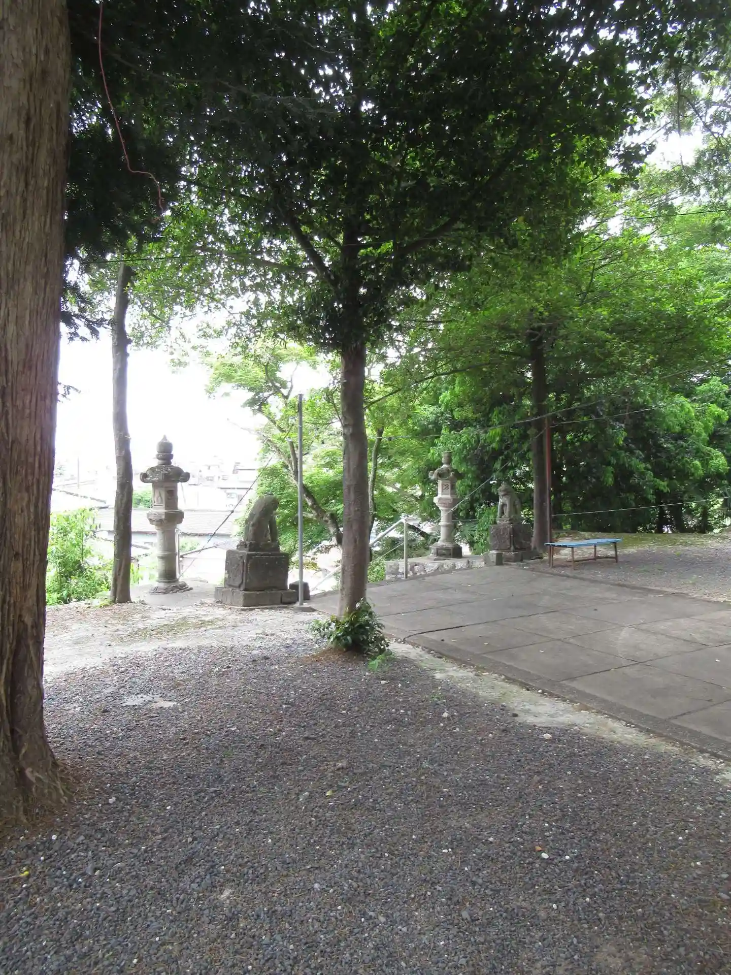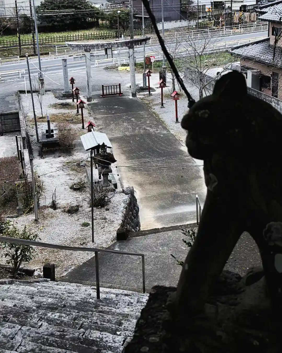 国道沿いの鳥居から階段90段で拝殿。途中の階層に神楽殿と狛犬がいます。