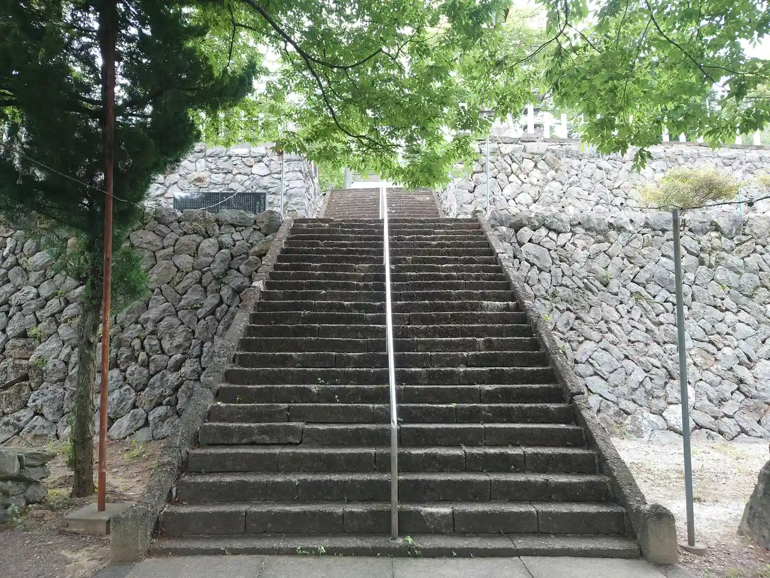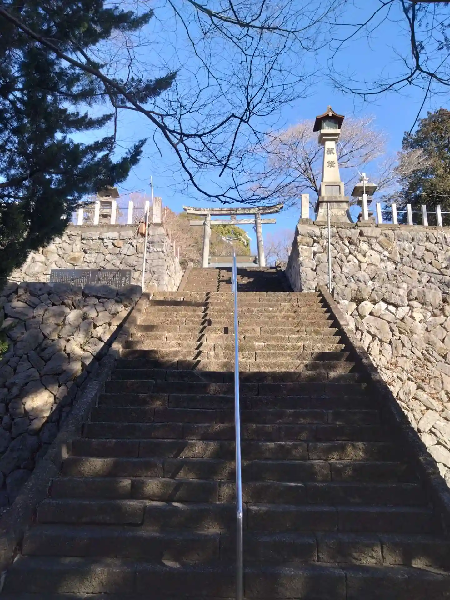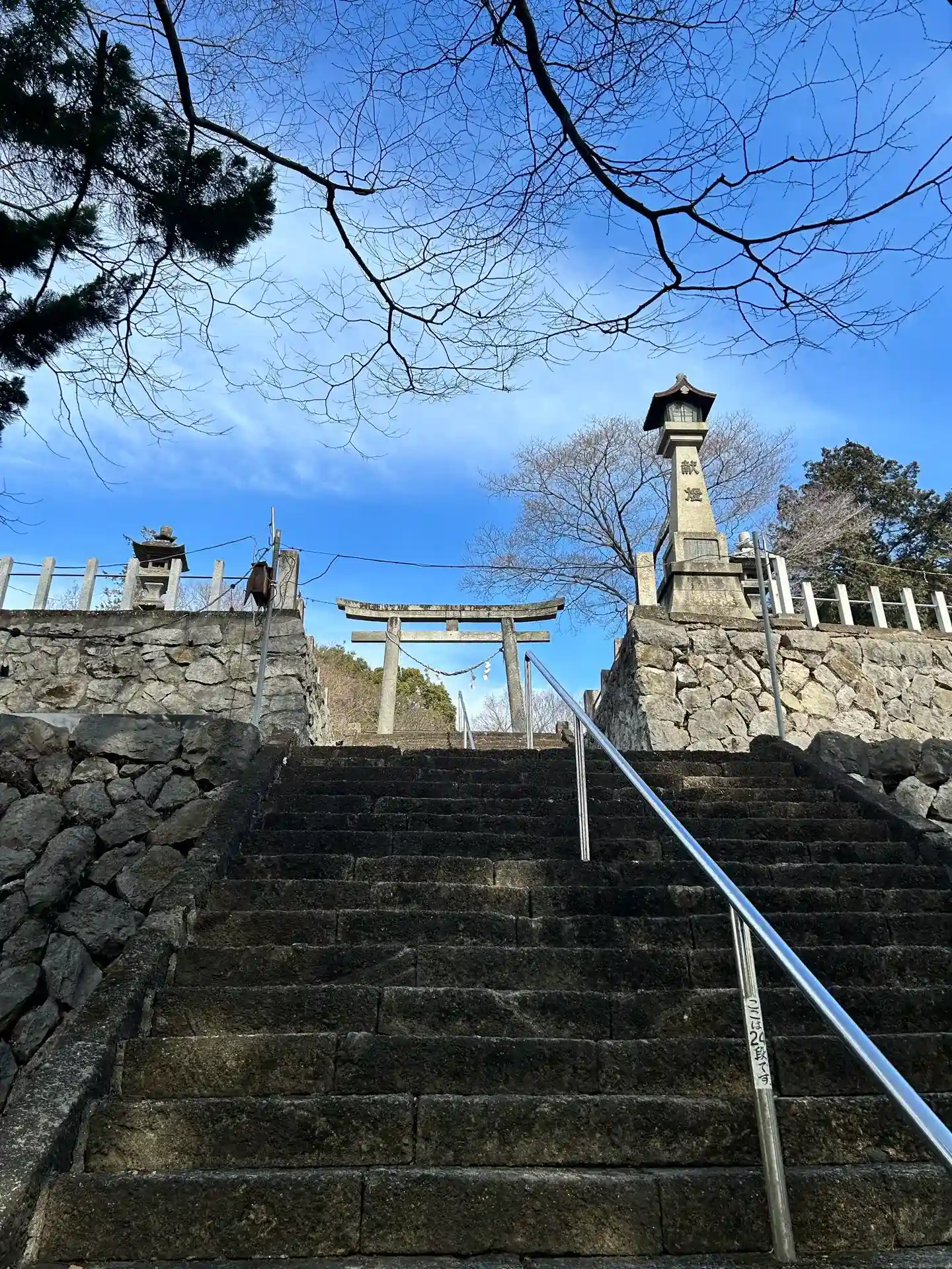 国道沿いの鳥居から階段90段で拝殿。途中の階層に神楽殿と狛犬がいます。