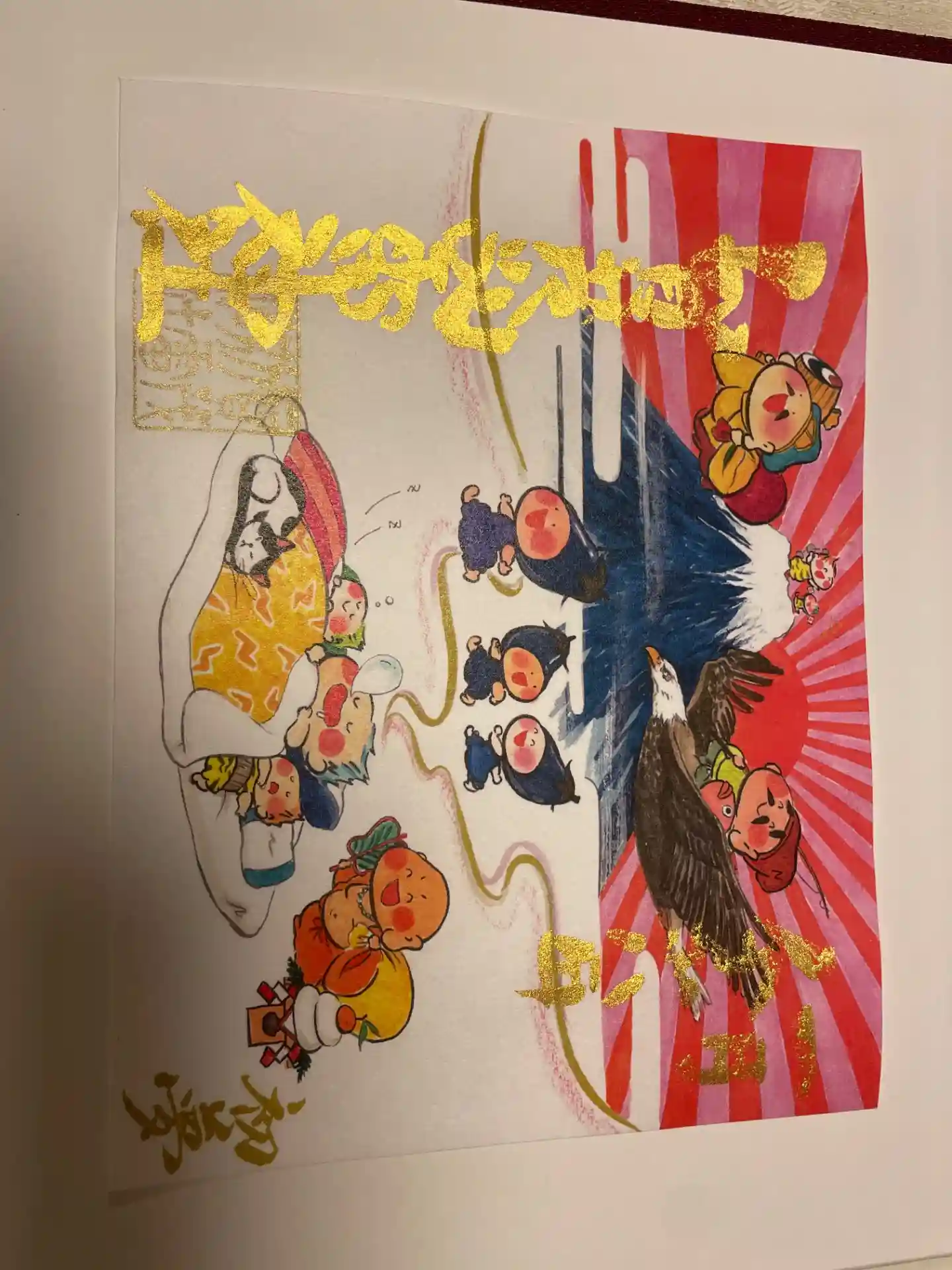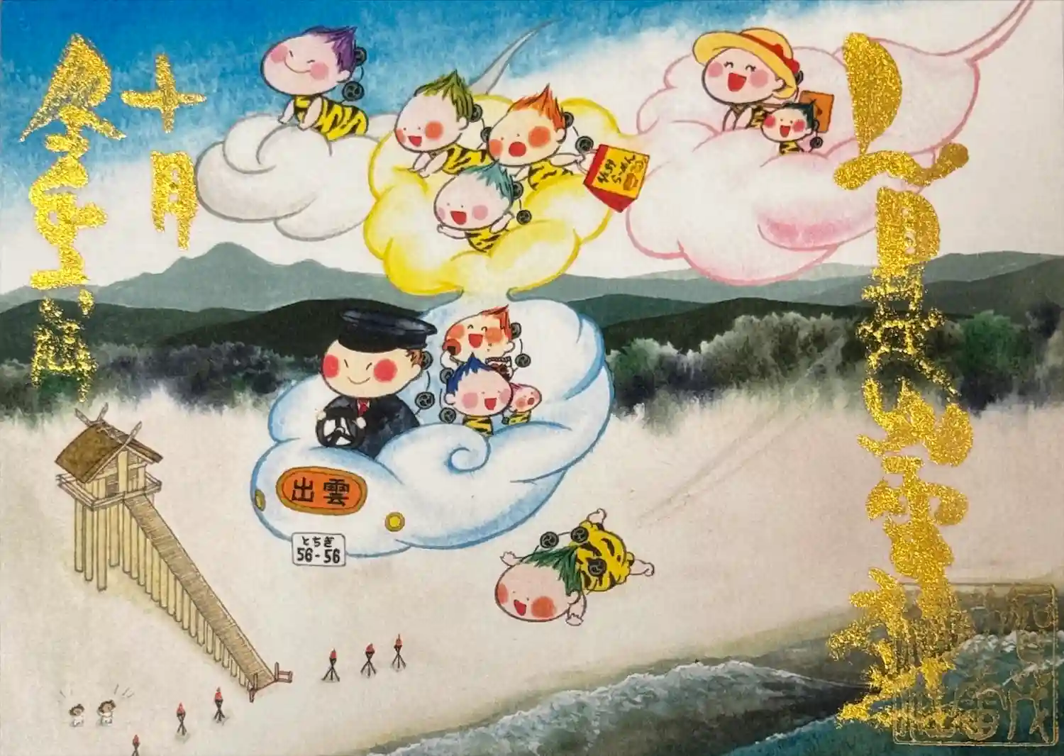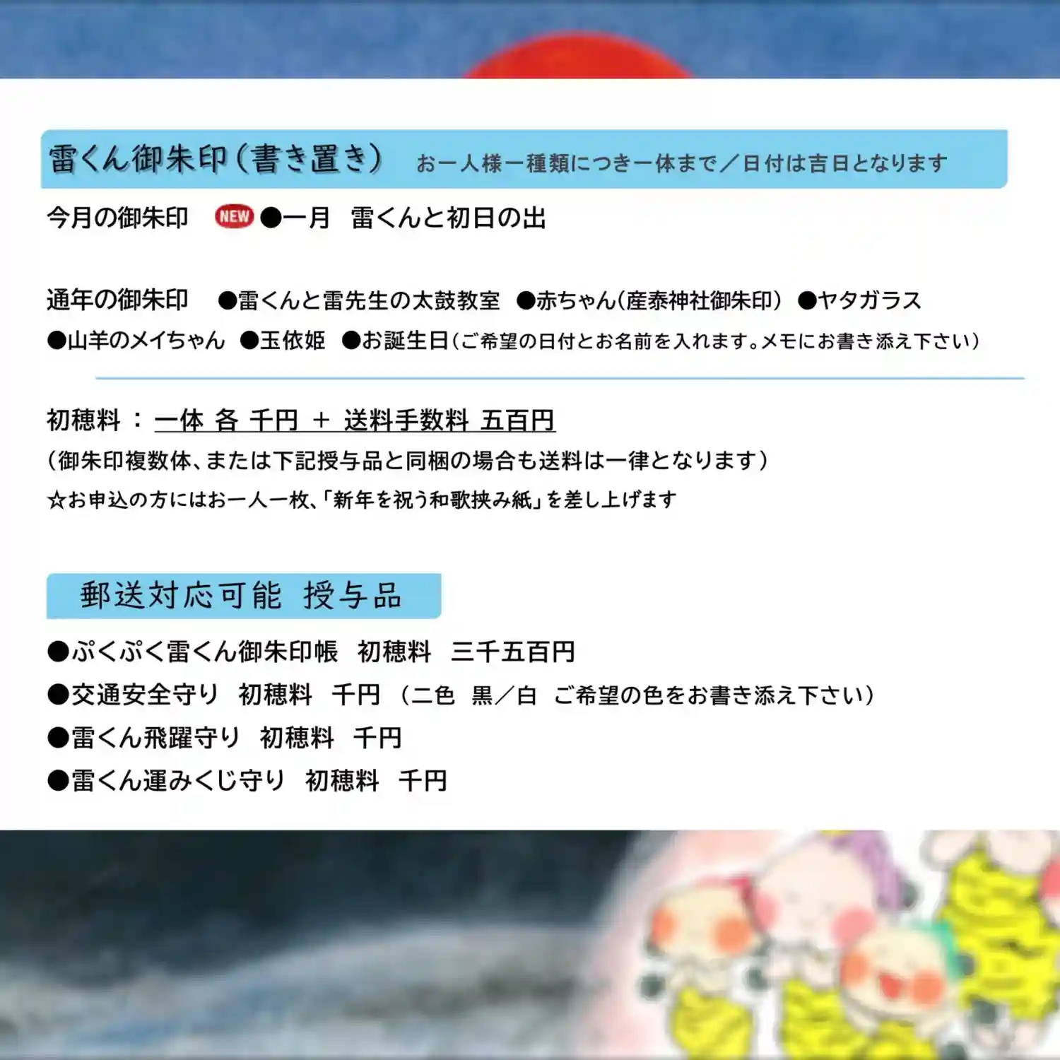 1月の雷くん御朱印のご案内です。『雷くんと初日の出』。御朱印画は富士山で、ご来光に向い雷くん達がお…