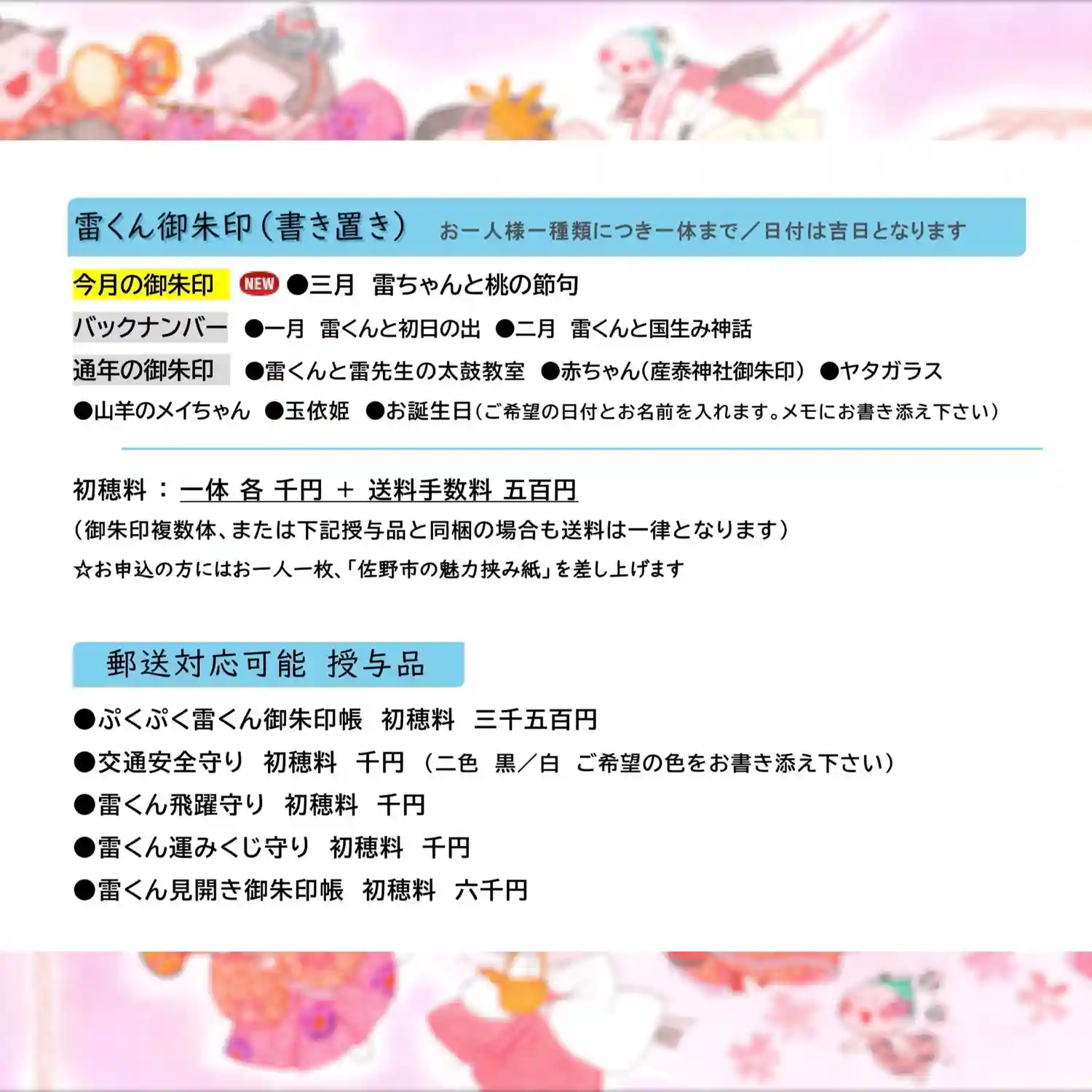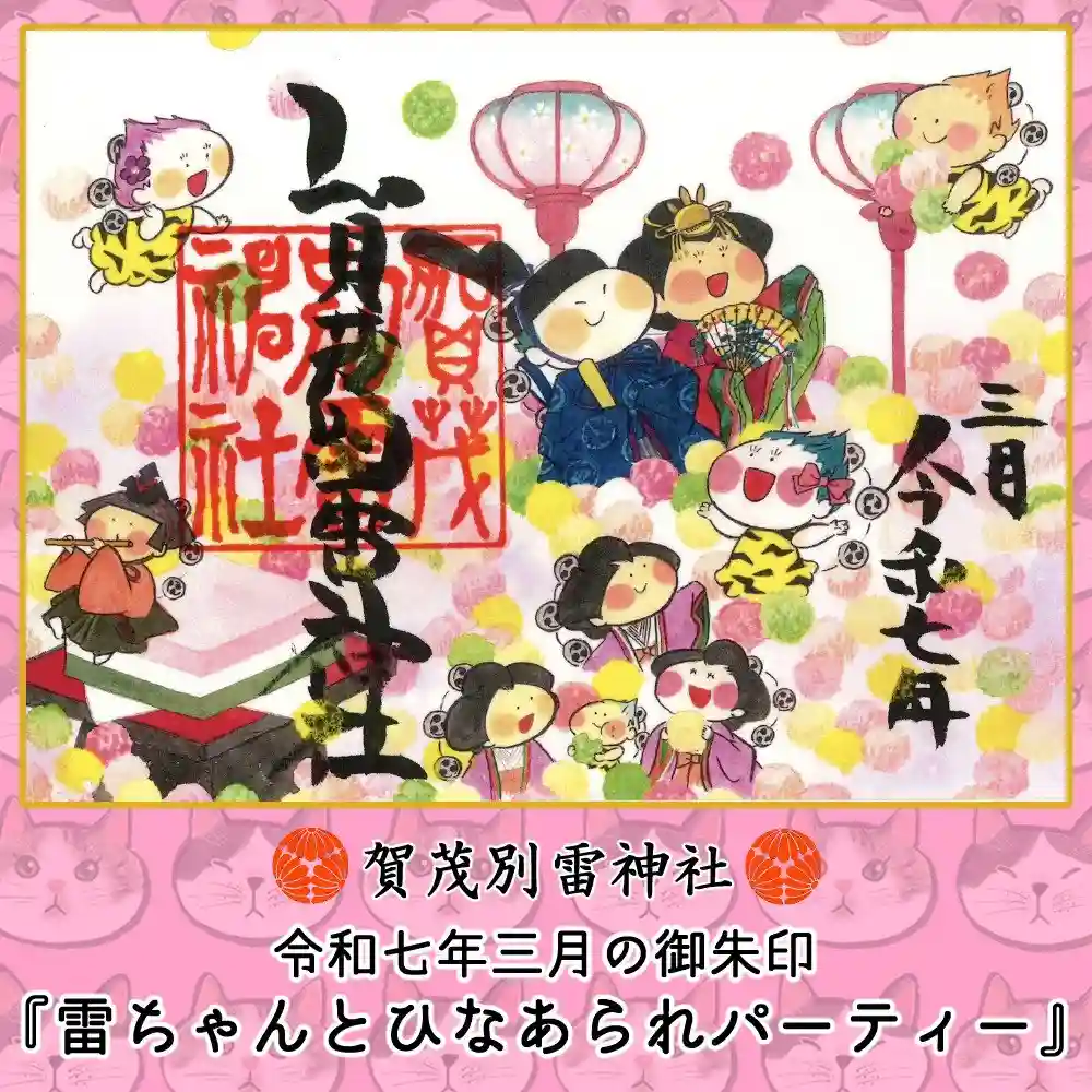 3月の雷くん御朱印のご案内です。『雷ちゃんと桃の節句』雷ちゃんがお雛様たちと一緒に、柔らかな春風の…