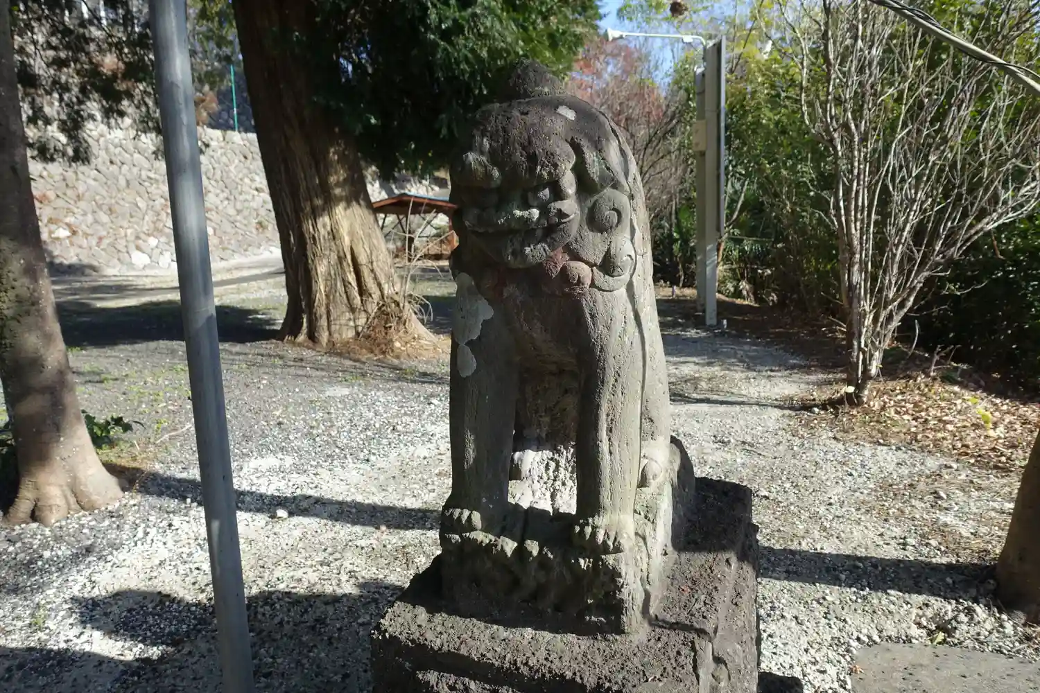個性的な狛犬。足が長く目が大きいので可愛い