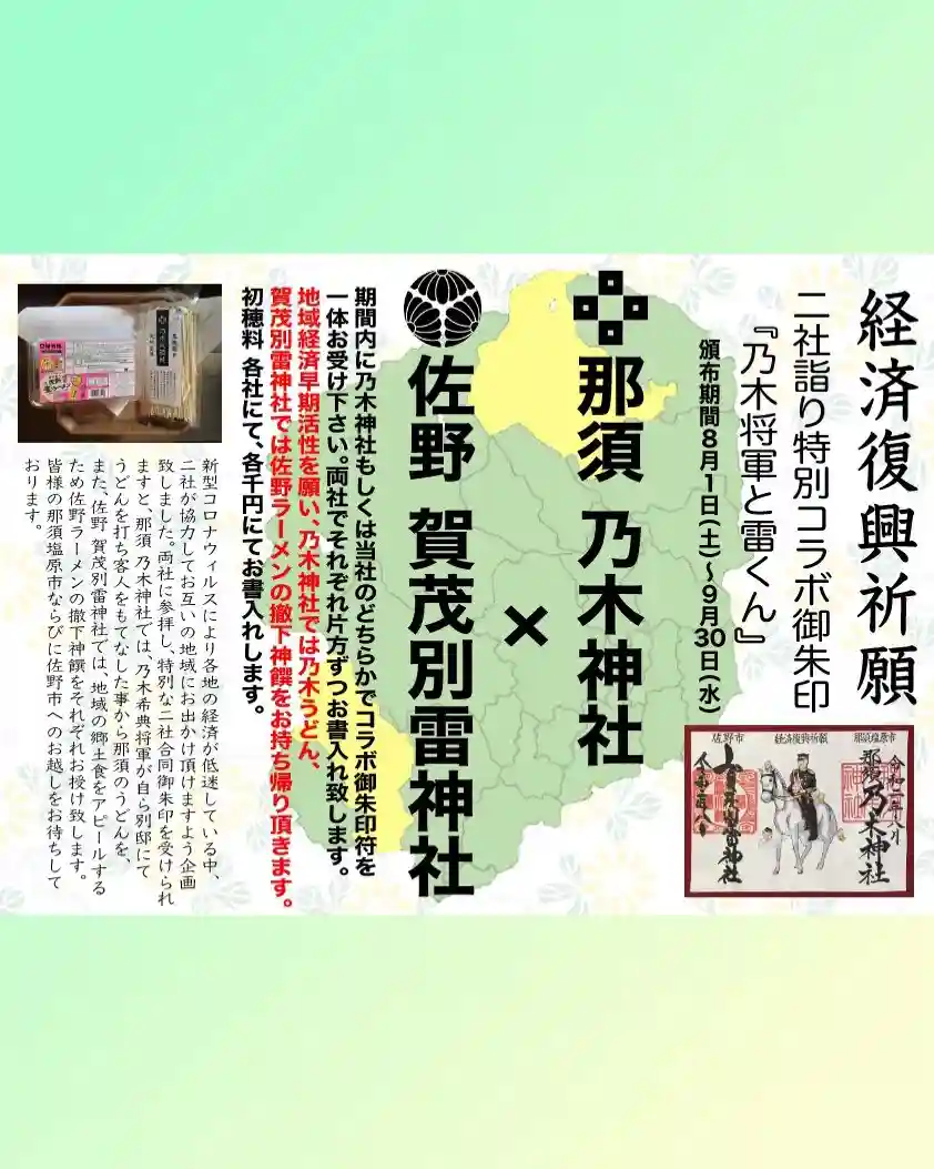 地域経済早期復興支援コラボ企画。那須塩原市 乃木神社×佐野市 賀茂別雷神社。8月1日〜9月30日…