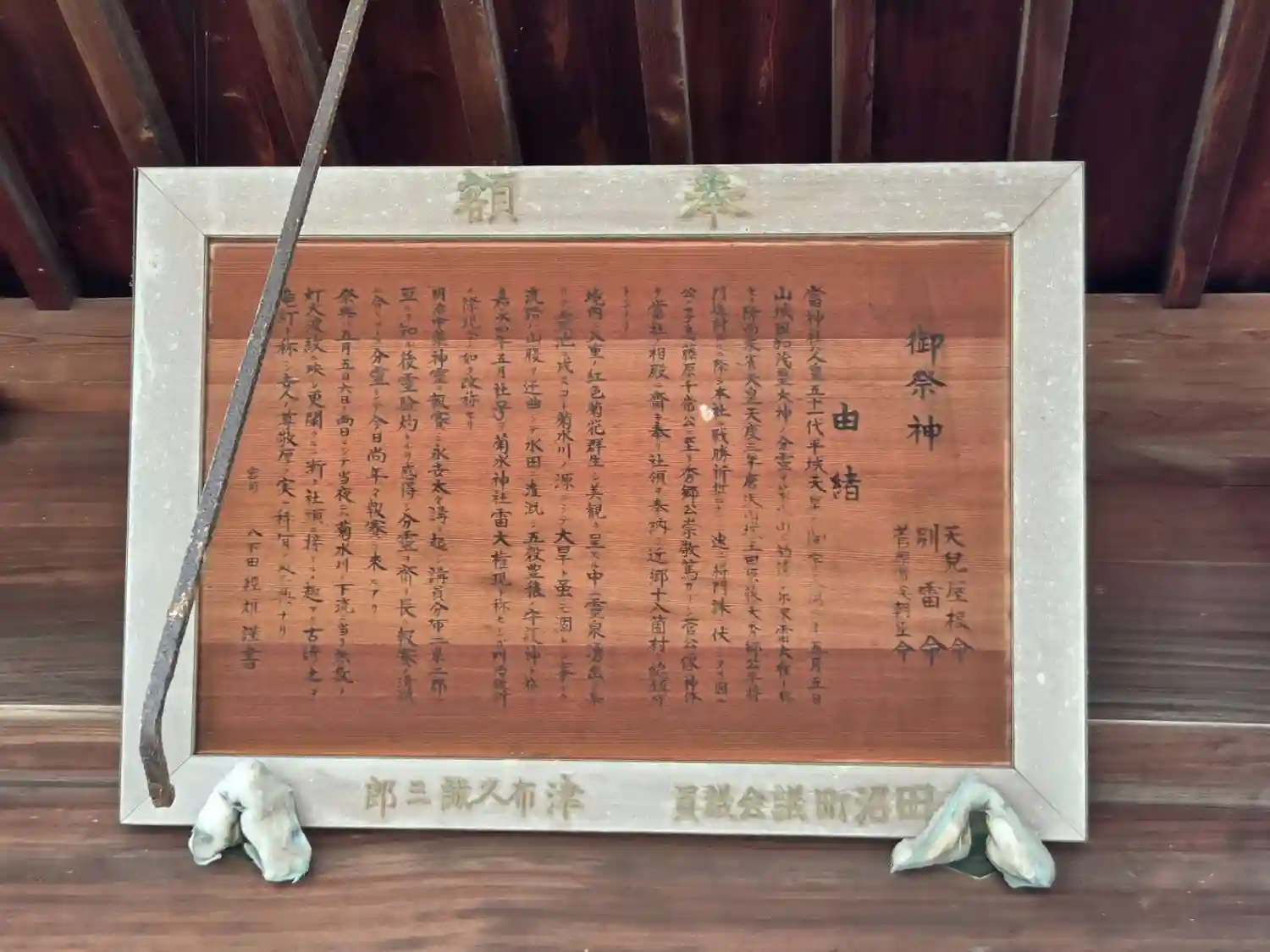 社殿の裏には菊水と呼ばれる小池がありました。この霊池は菊沢川の源で、清水がコンコンと湧き出て大干ばつでも枯れることはなく、灌漑肥沃として五穀成就の守護神とされました。それ故に、社号を菊沢神社加茂別雷大権現と称しましたが、明治維新後に現在の社号に改称されました。