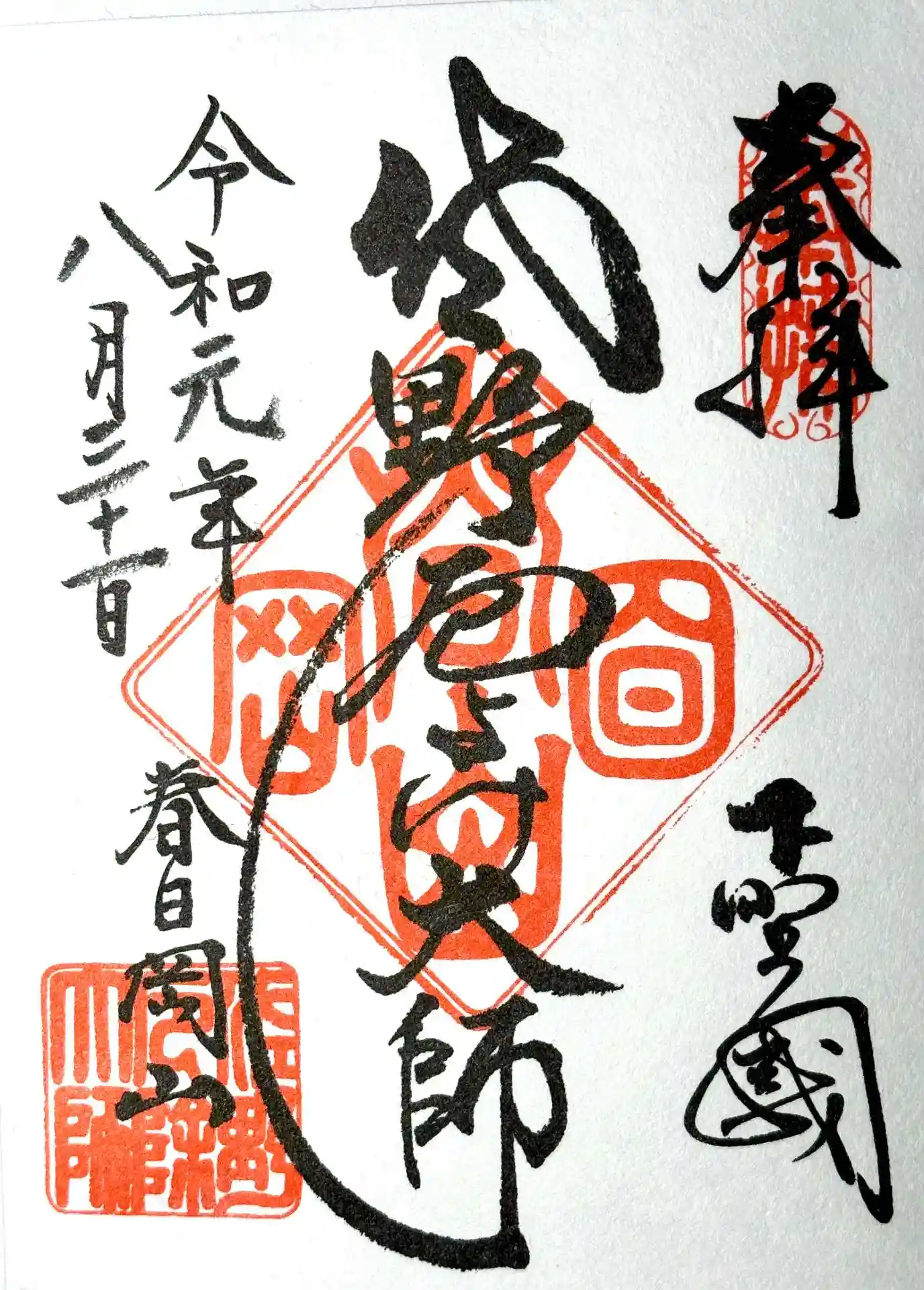 真ん中に佐野厄よけ大師と書かれ、右上に奉拝の印、右下に下野國の文字、真ん中に春日岡山の印、左下に春日岡山の文字、佐野厄除大師の印が押されています。