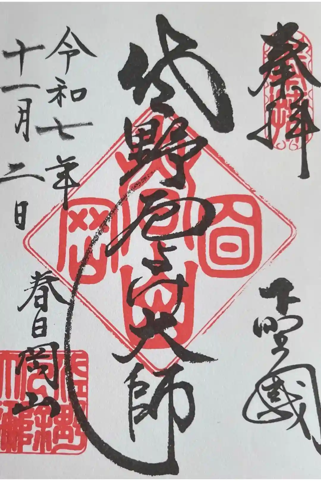 真ん中に佐野厄よけ大師と書かれ、右上に奉拝の印、右下に下野國の文字、真ん中に春日岡山の印、左下に春日岡山の文字、佐野厄除大師の印が押されています。