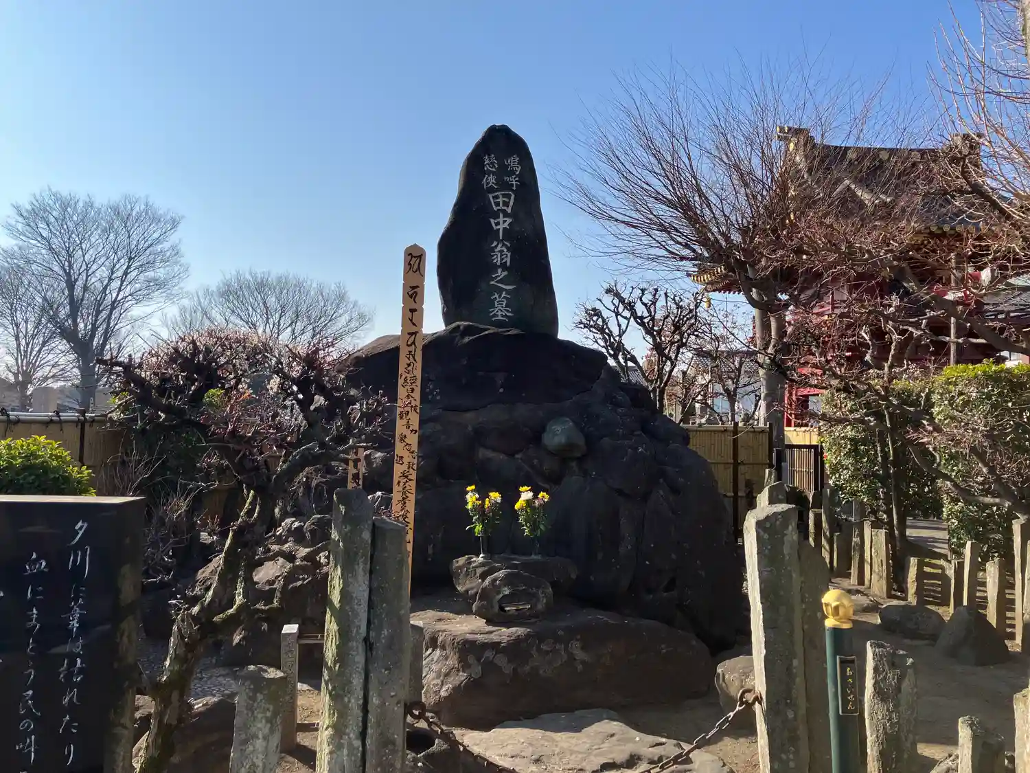 日本の公害の第一号といわれている足尾鉱毒事件の救世主、田中翁の分骨地である。近代日本の先駆者としての翁の功績をたたえ、毎年9月4日同志の人々が集まり、法要をいとなみ続けて今日に至っています。