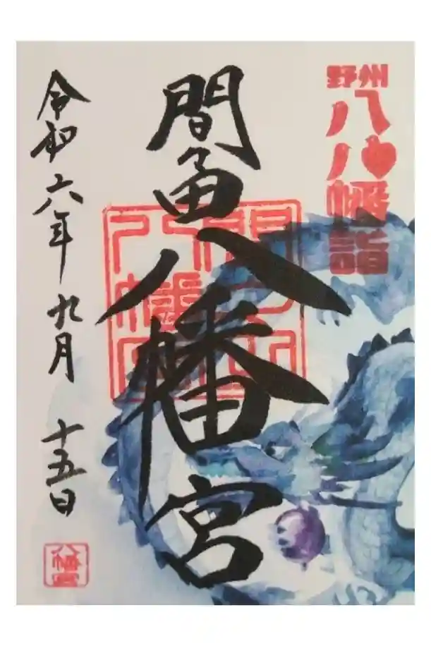 じゃがまいた(蛇)が描かれた二面見開きの御朱印で、右面は真ん中に間々田のじゃがまいたの金文字と間々田八幡宮の印、右上に国重要無形民俗文化財の印、左面は上部に疫病退散の印、左下に八幡宮の印が押されています。