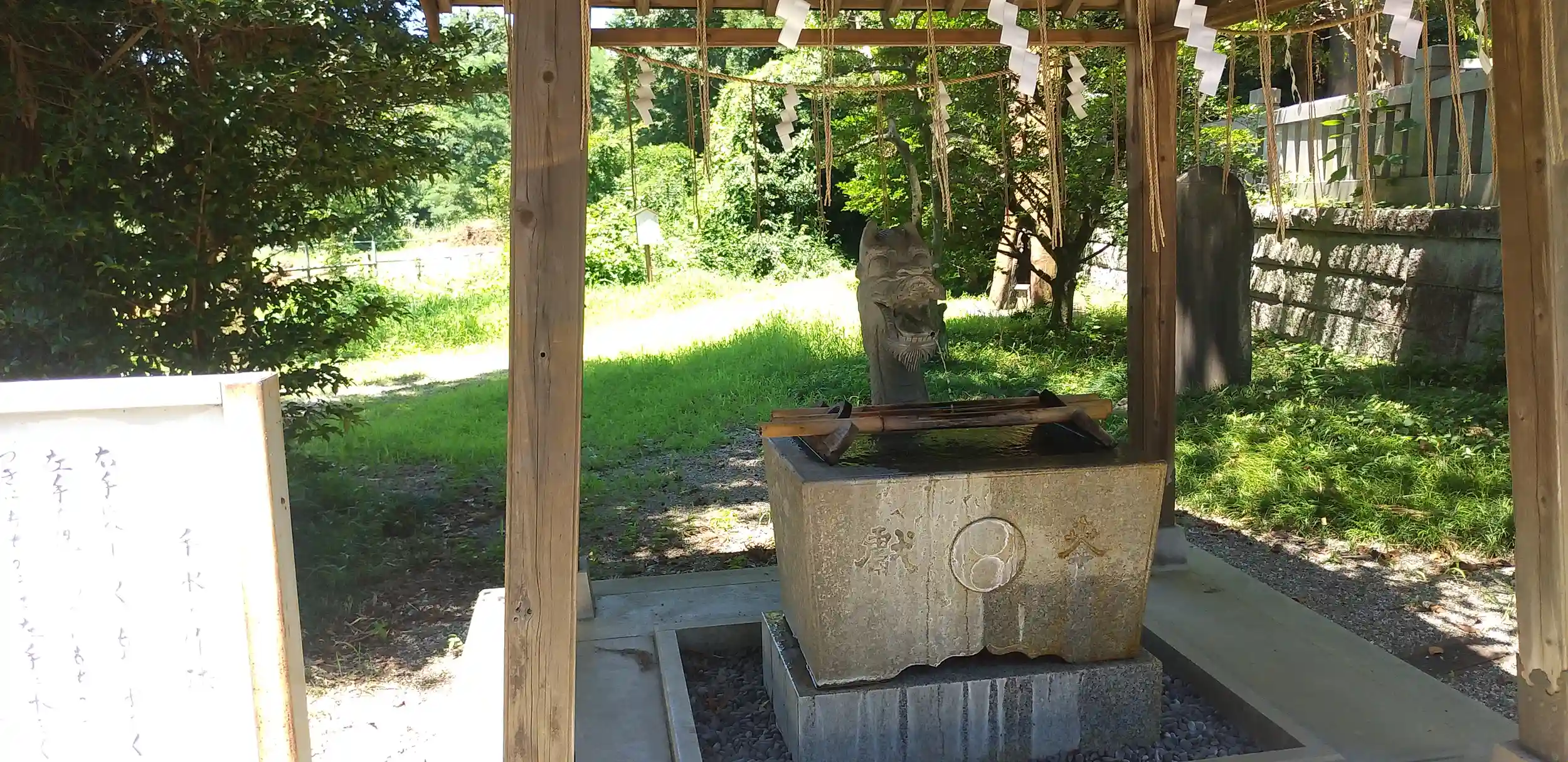 神社駐車場のそばの池に水神さまがあり、手水舎まえの階段を上ると御座します。