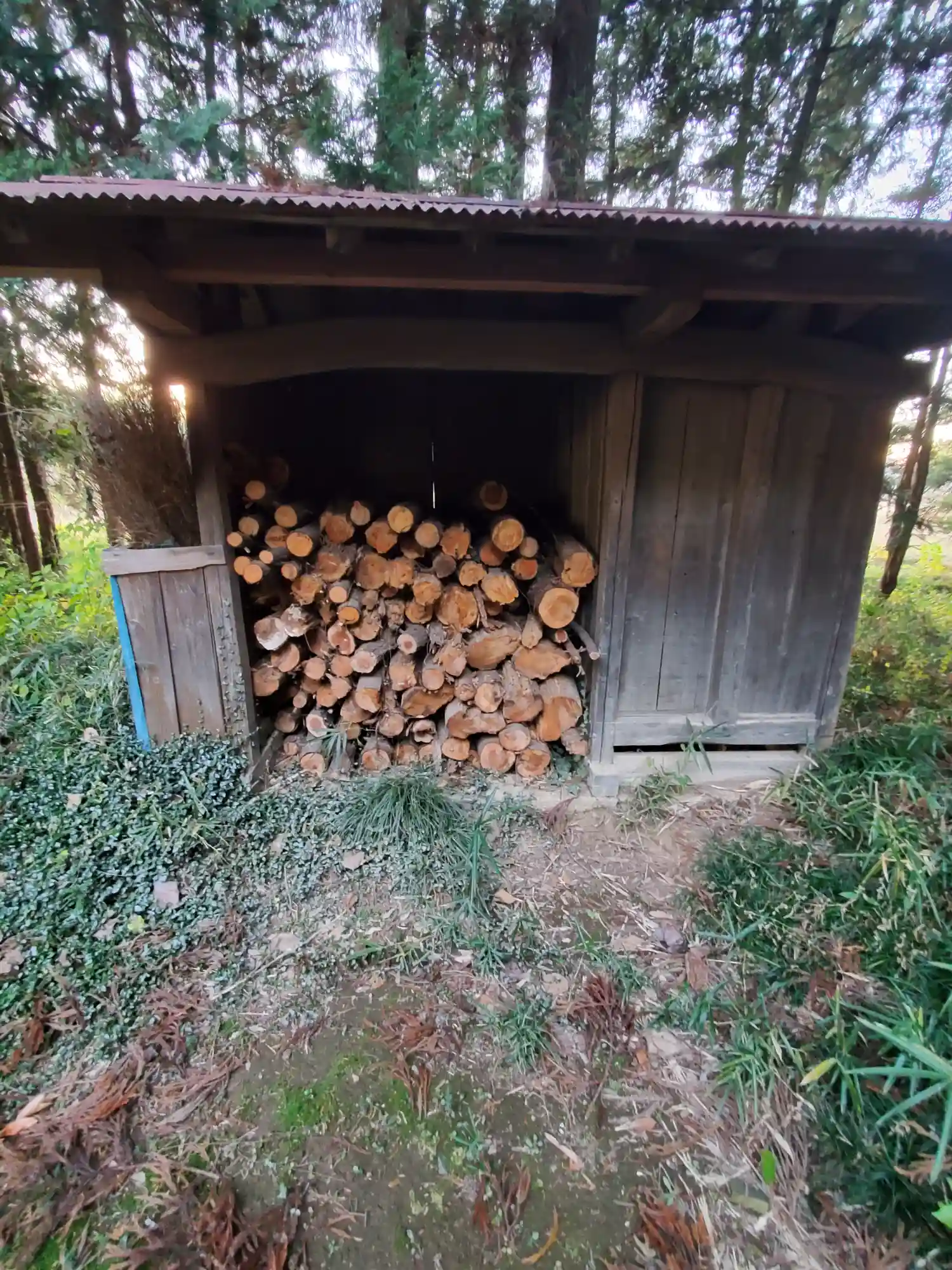 横に薪と掃除用具の積まれた小屋