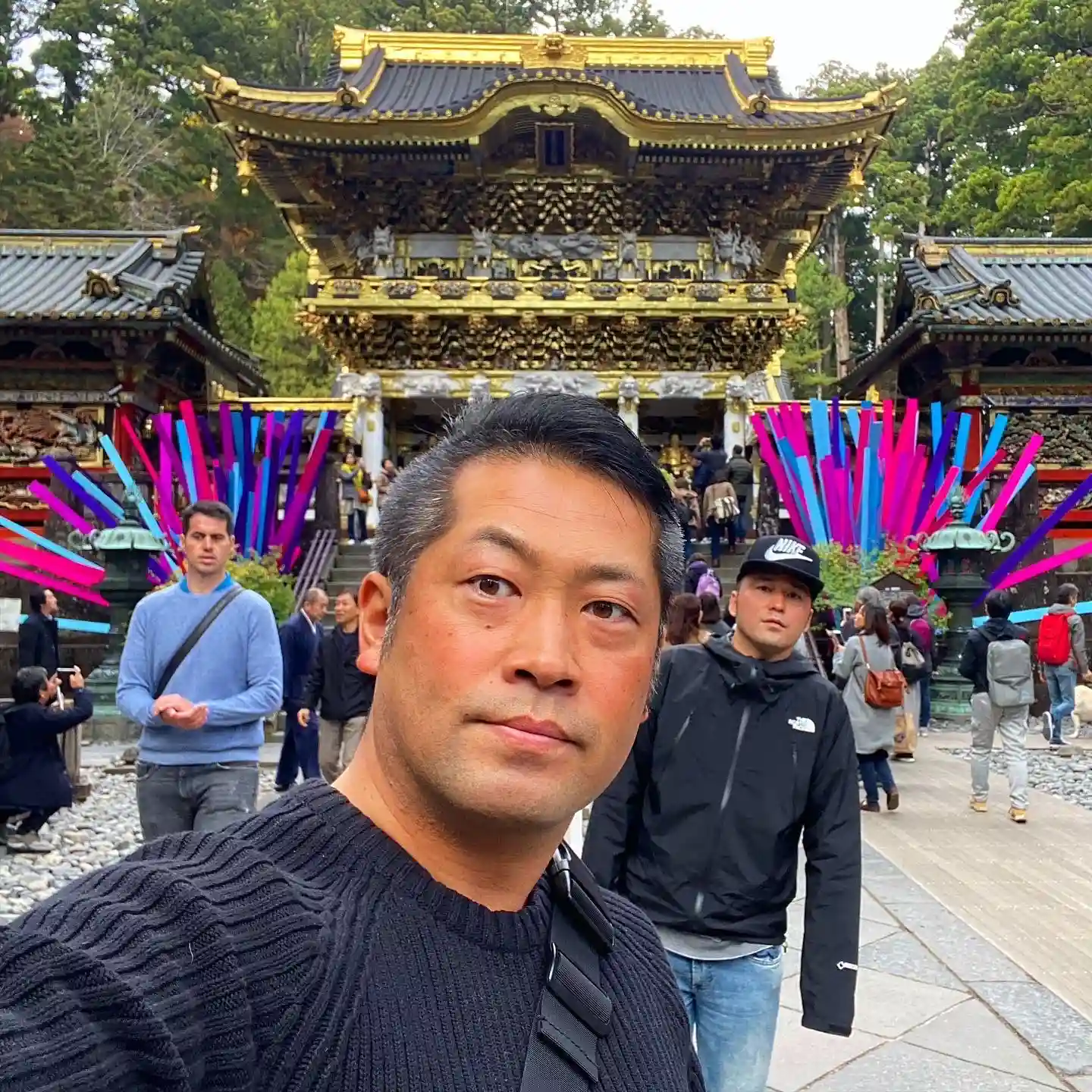 假屋崎省吾さんが飾り付けした陽明門の前で。