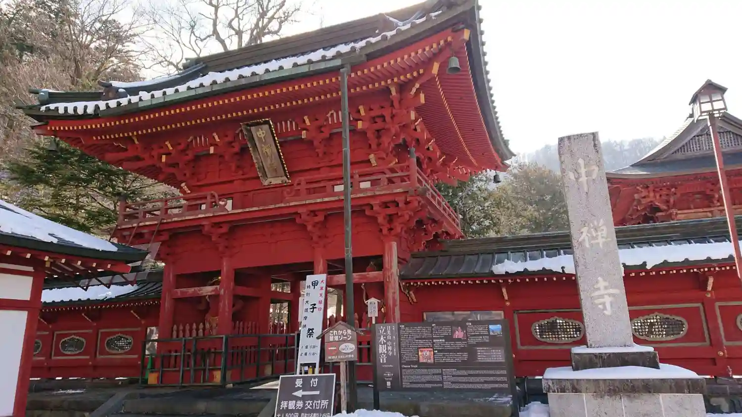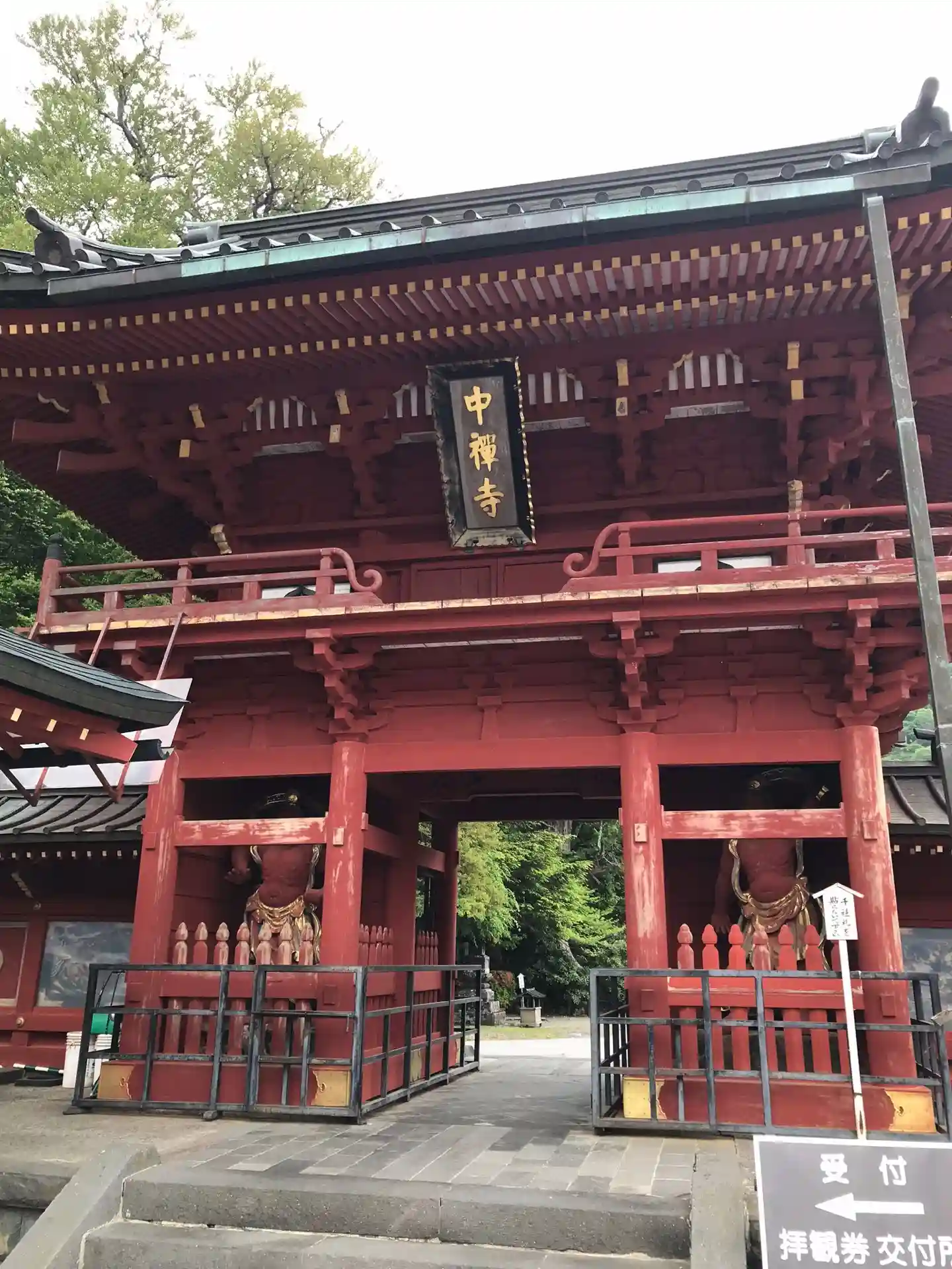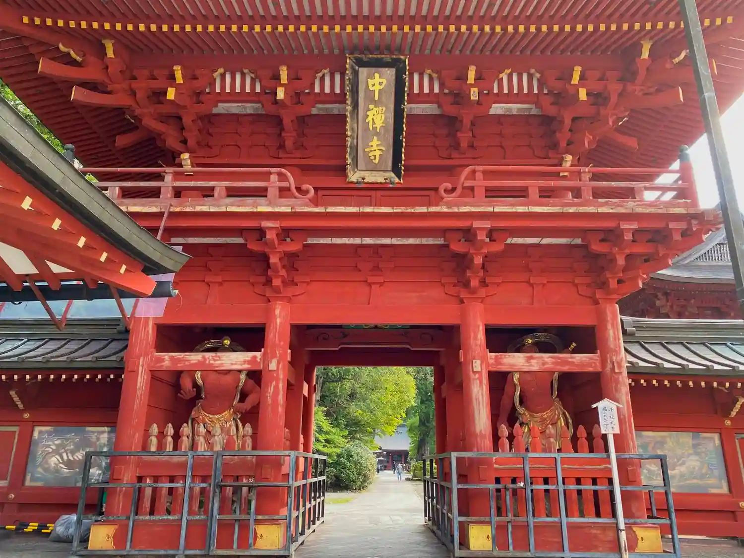鮮やかな朱色が印象的な<仁王門>。大きな<中禅寺>の扁額。