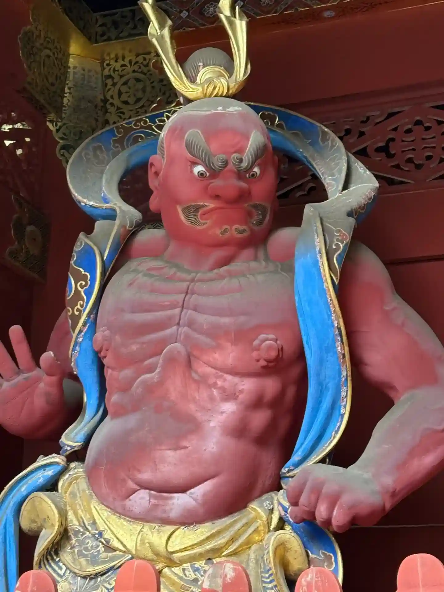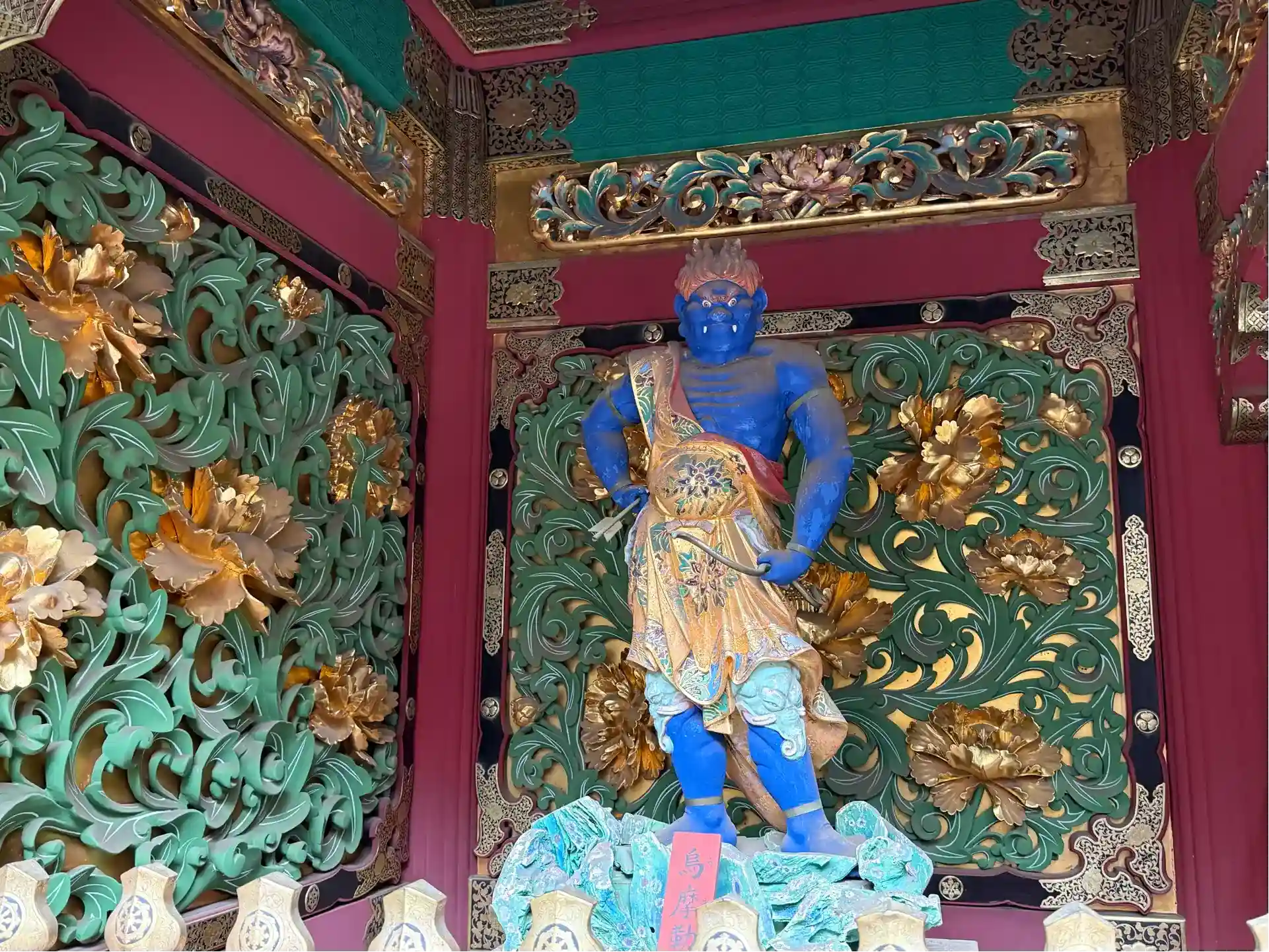 四体の夜叉「阿跋摩羅(あばつまら)、毘陀羅(びだら)、烏摩勒伽(うまろきゃ)、犍陀羅(けんだら)」が、安置されていることから夜叉門と呼ばれ、霊廟(れいびょう)を守っています。夜叉門には、牡丹(ぼたん)の花が彫刻されているので、別名【牡丹門】とも呼ばれています。なかでも、【烏摩勒伽】は全国でもめずらしい仏様です。