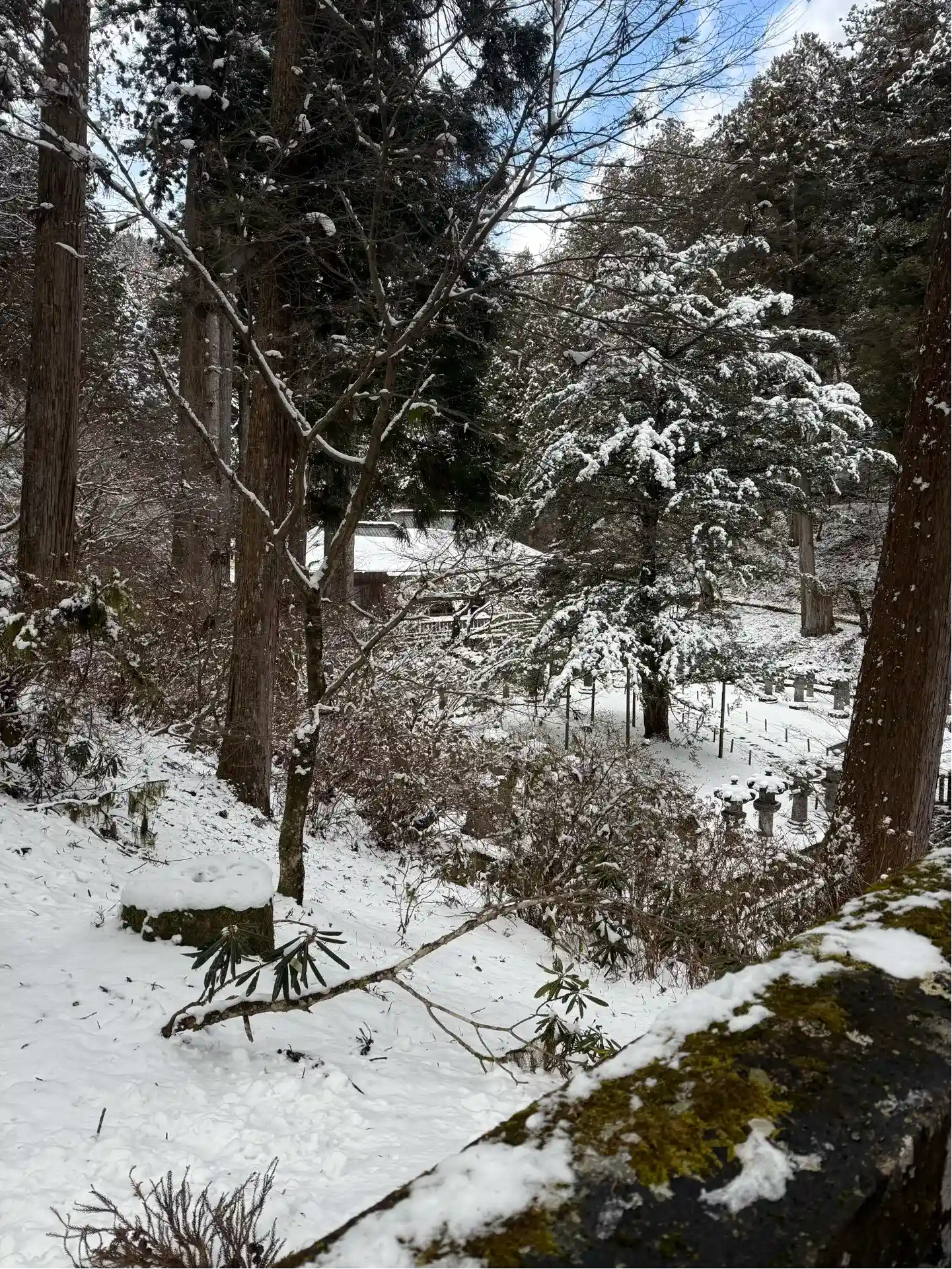 残雪を踏みしめながら登る石段は趣きを感じました