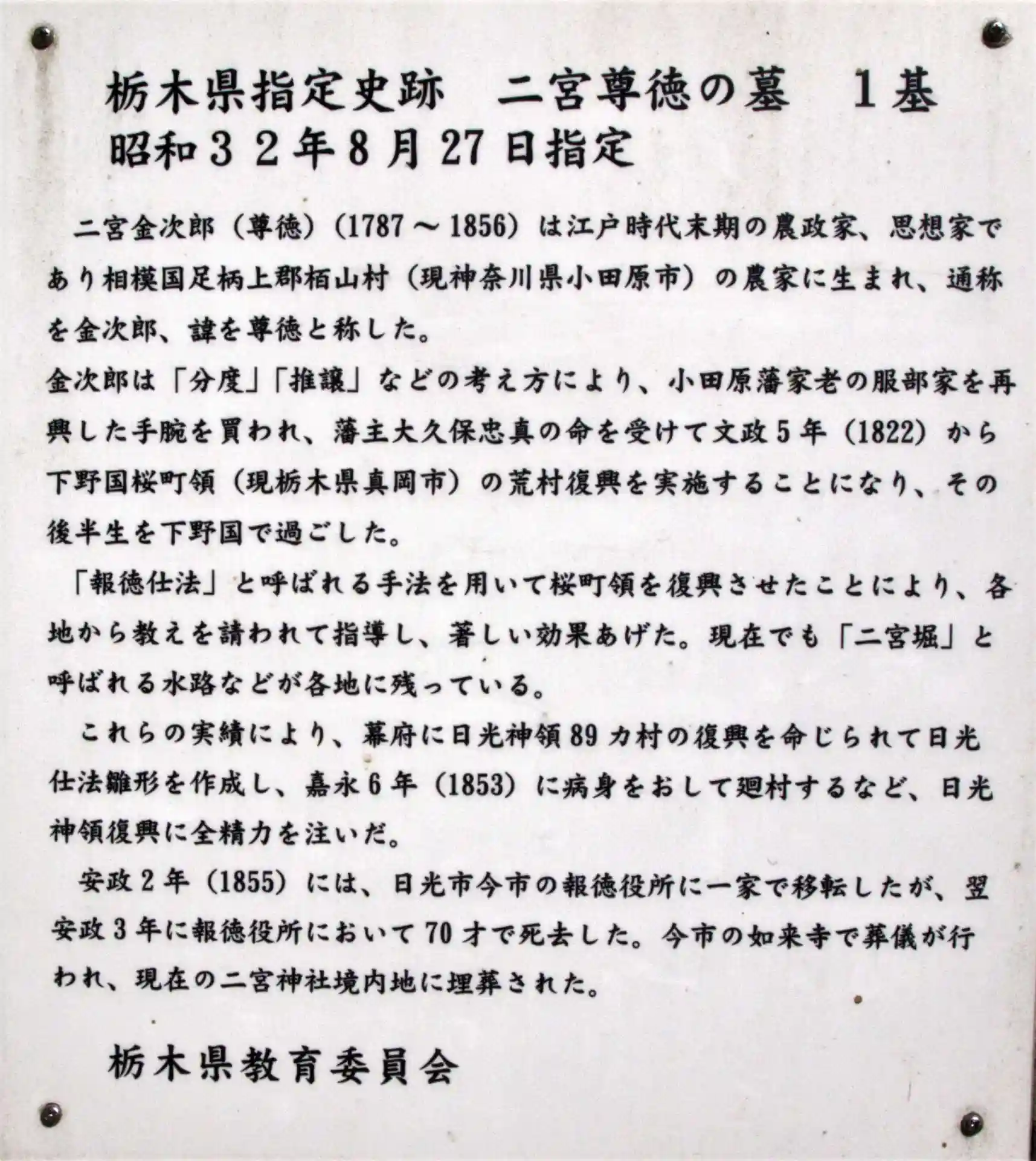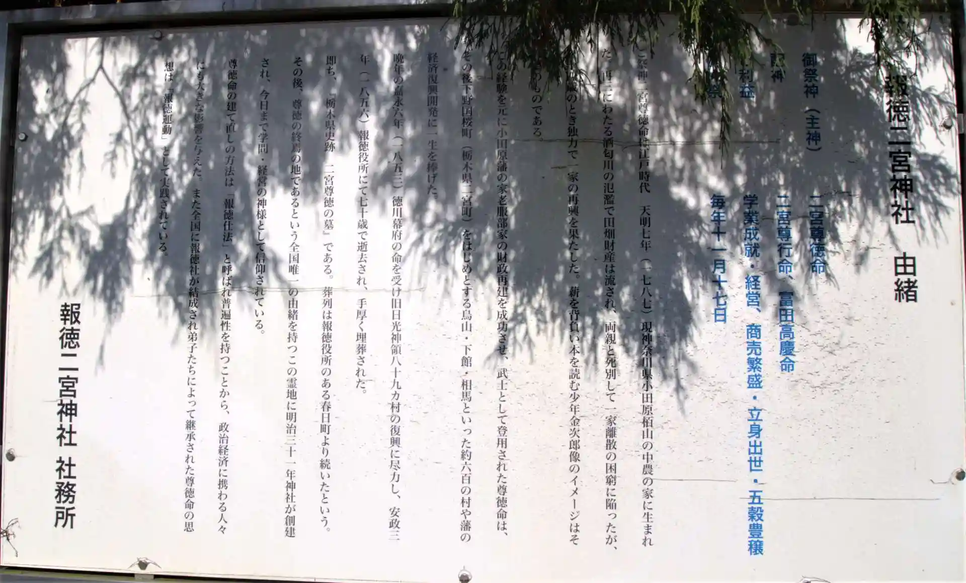 小田原に生まれ、真岡市桜町、日光市今市と善職し、今市の報徳役所にて逝去、尊徳の終焉の地である由緒を持つ今市に神社が創建された。(学問・経営の神様)